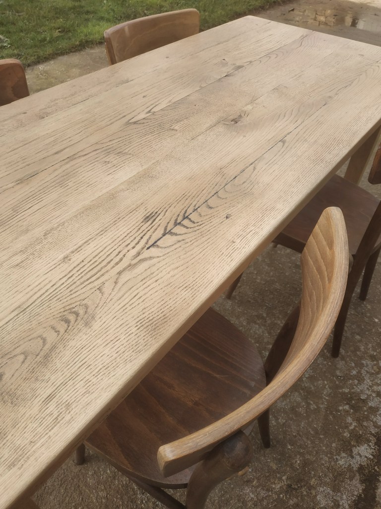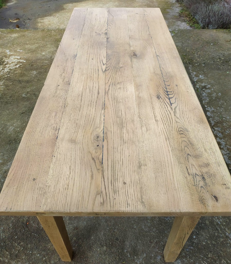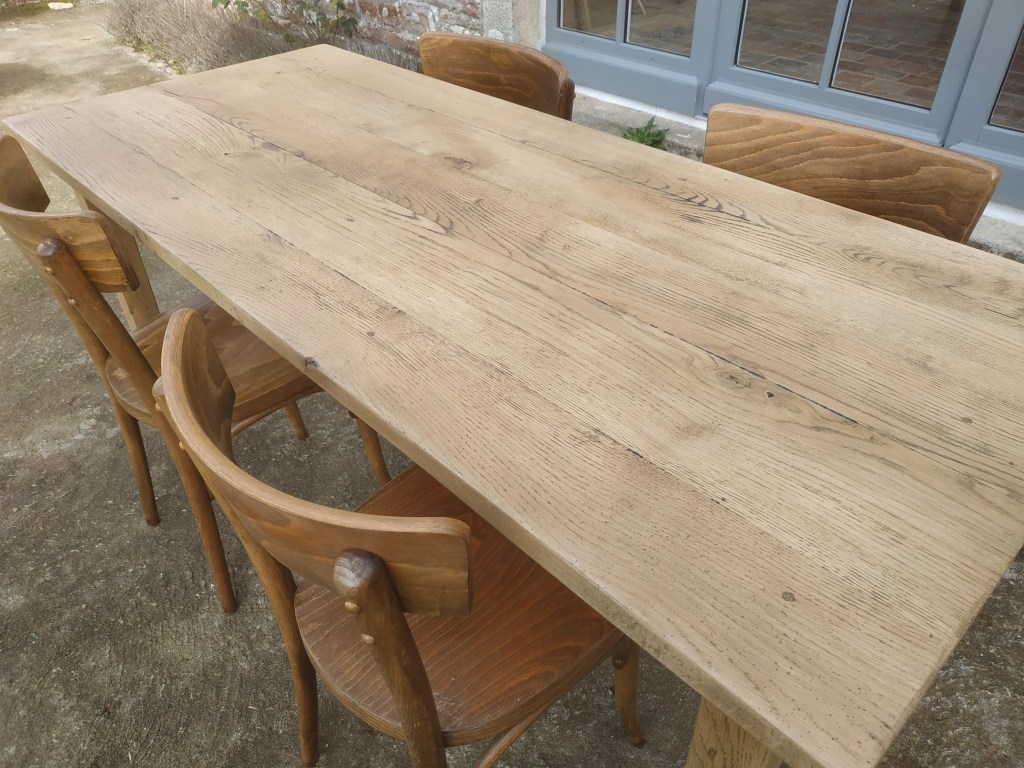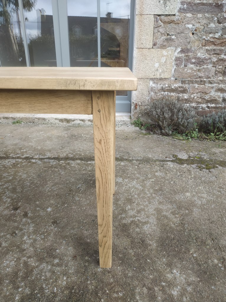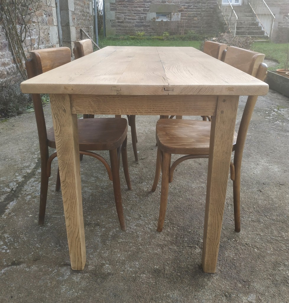 Belle table de ferme en chêne massif, très solide et très stable. Son plateau fait 30mm d’épaisseur. Très belle patine, très beau bois. Cette table peut accueillir indifféremment 4 ou 6 personnes. Sa belle hauteur sous tablier (65cm) assure le confort nécessaire pour les jambes.