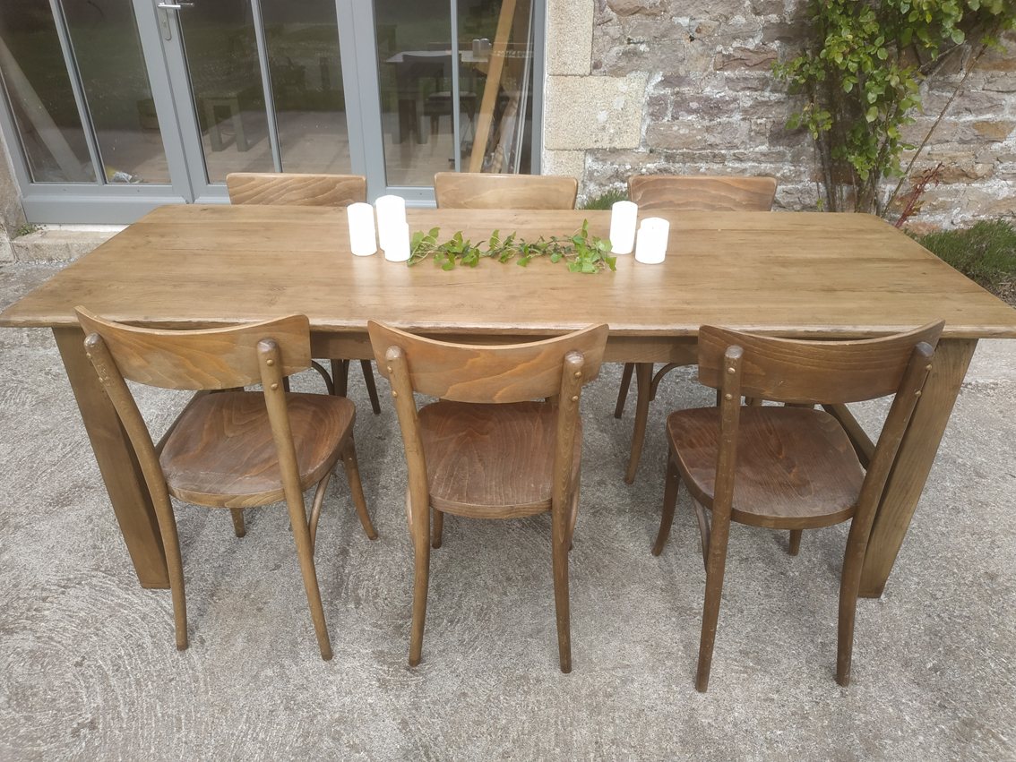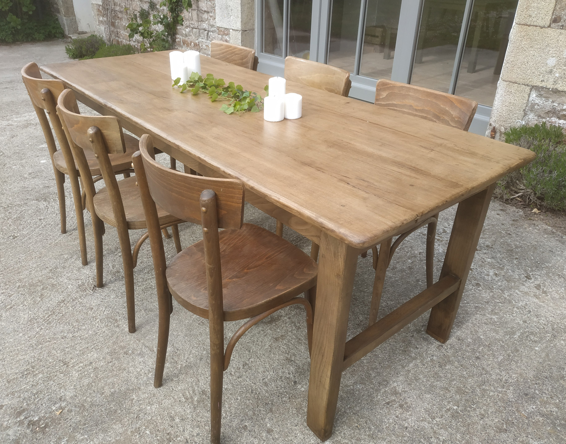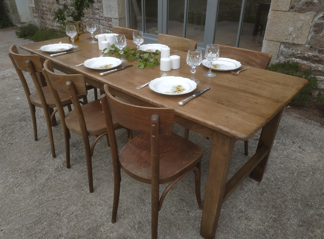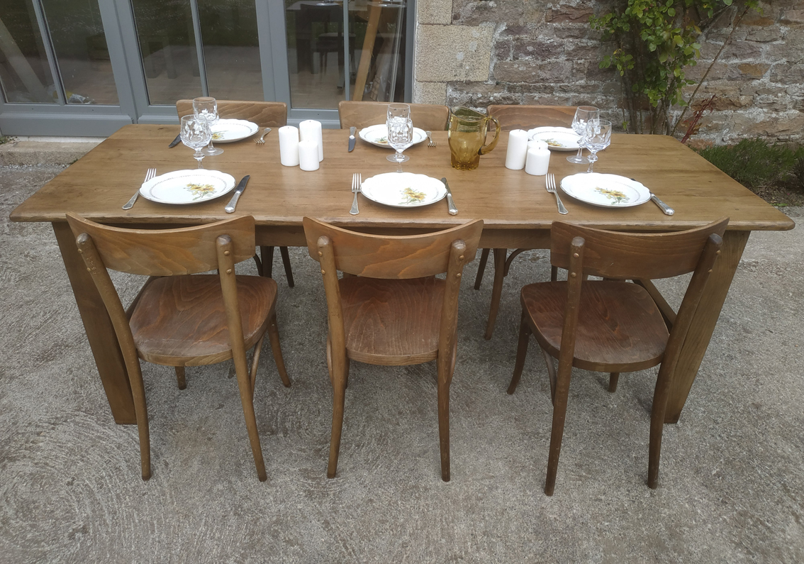 Table de ferme restaurée. Le plateau a été refait en chêne. Il a recu 3 couches de vernis et ne demandera pas d’entretien particulier. Le tablier a été aminci et les pieds réhaussés, la hauteur sous chassis a ainsi été amenée à 65cm. Pouvant accueillir 6 à 8 convives, c’est une magnifique table très solide et stable qui vous accompagnera longtemps!