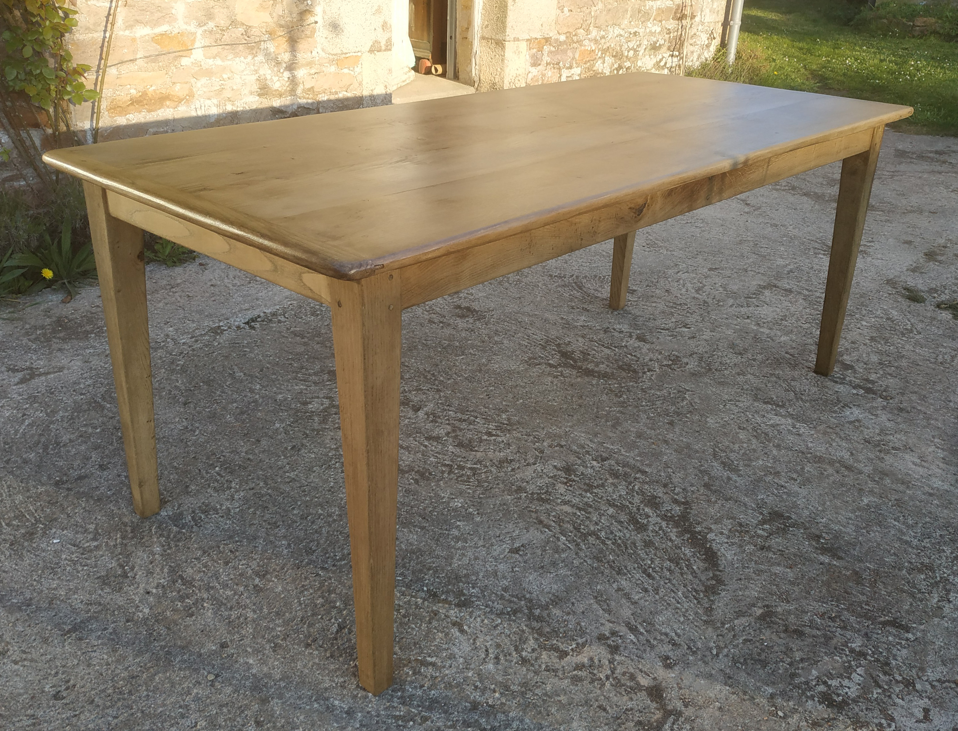 Table en chêne pour 8 à 10 convives. Finition Ton Noyer. Montage plateau avec traverses perpendiculaires.