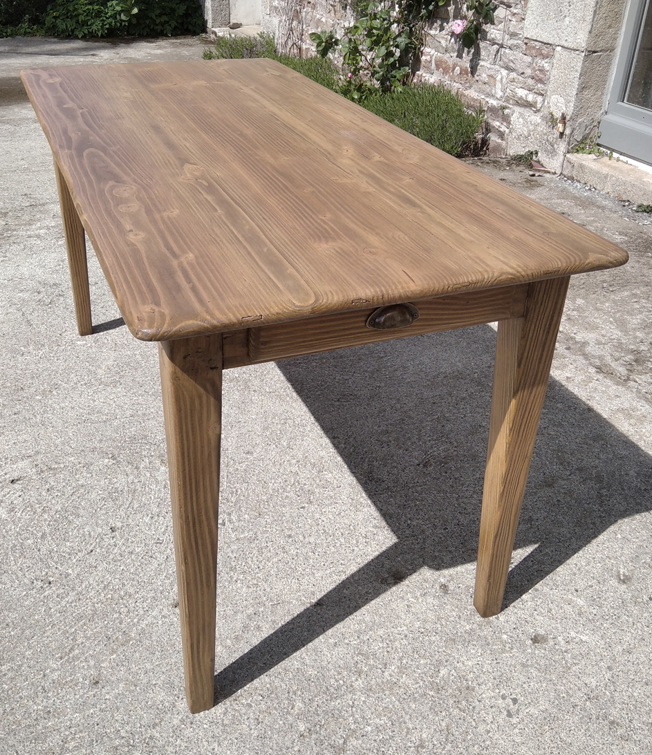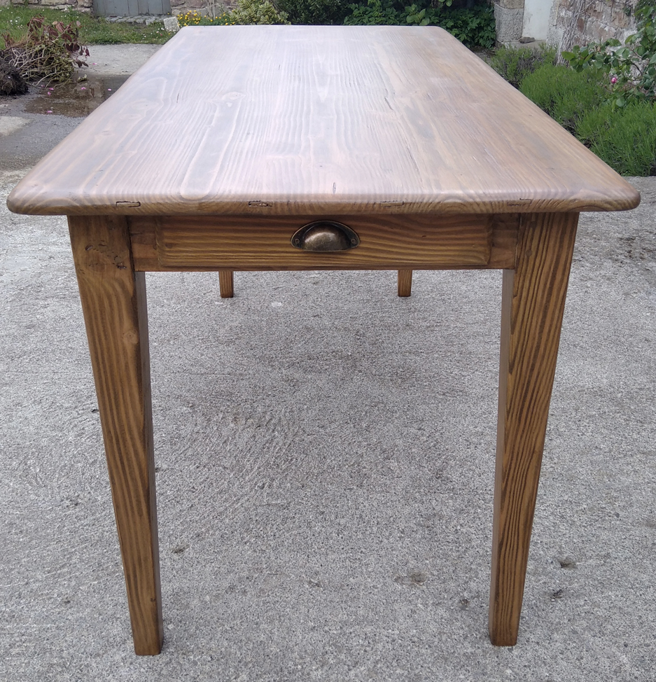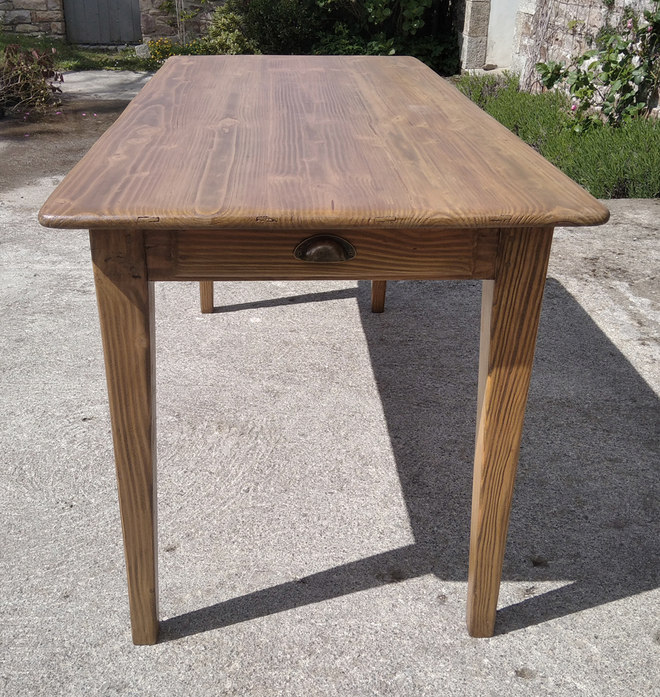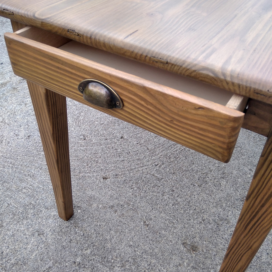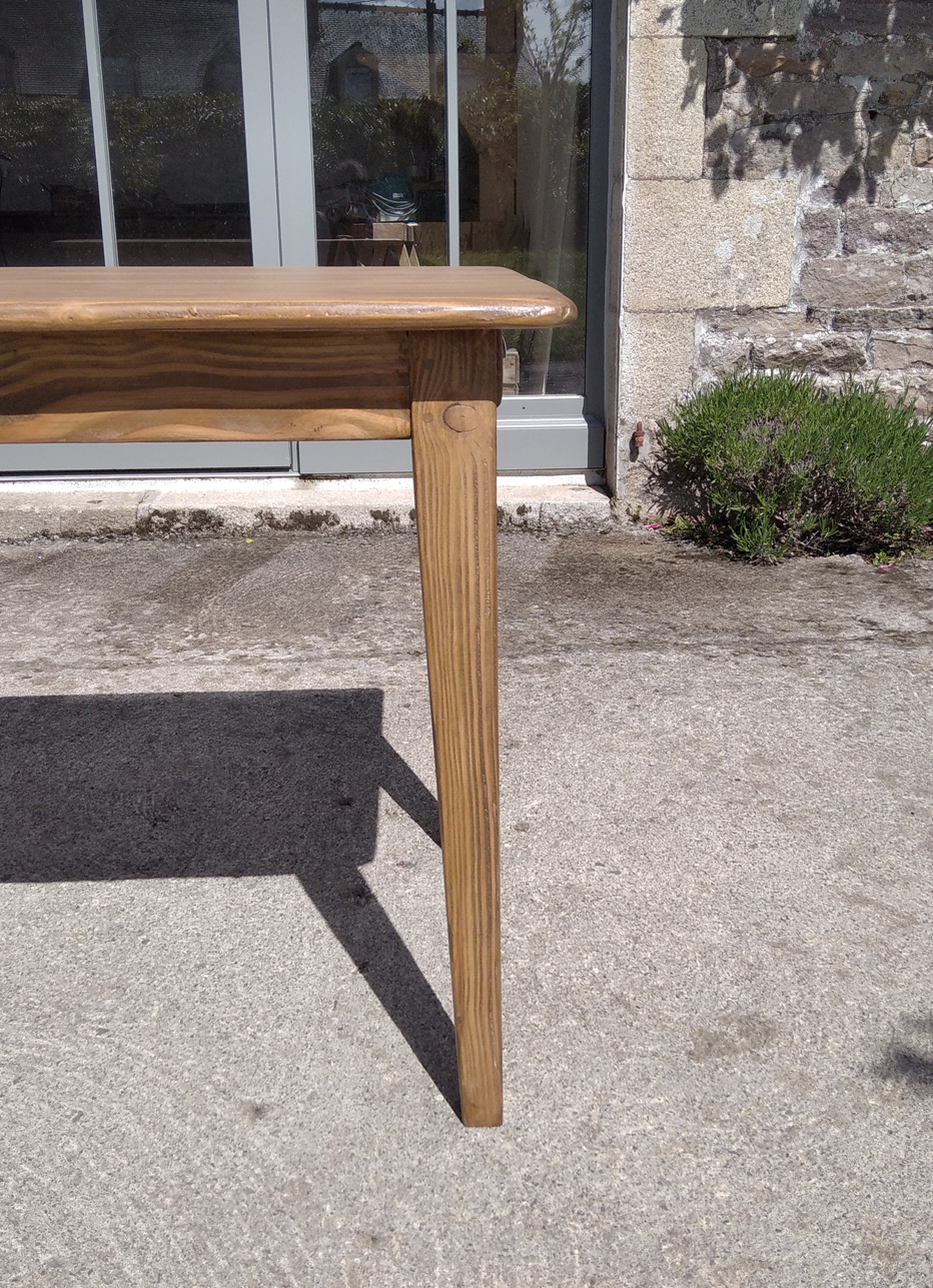 Table en pin douglas de 4/6 personnes. Finition chene moyen. 1 petit tiroir avec poignée style ancien.