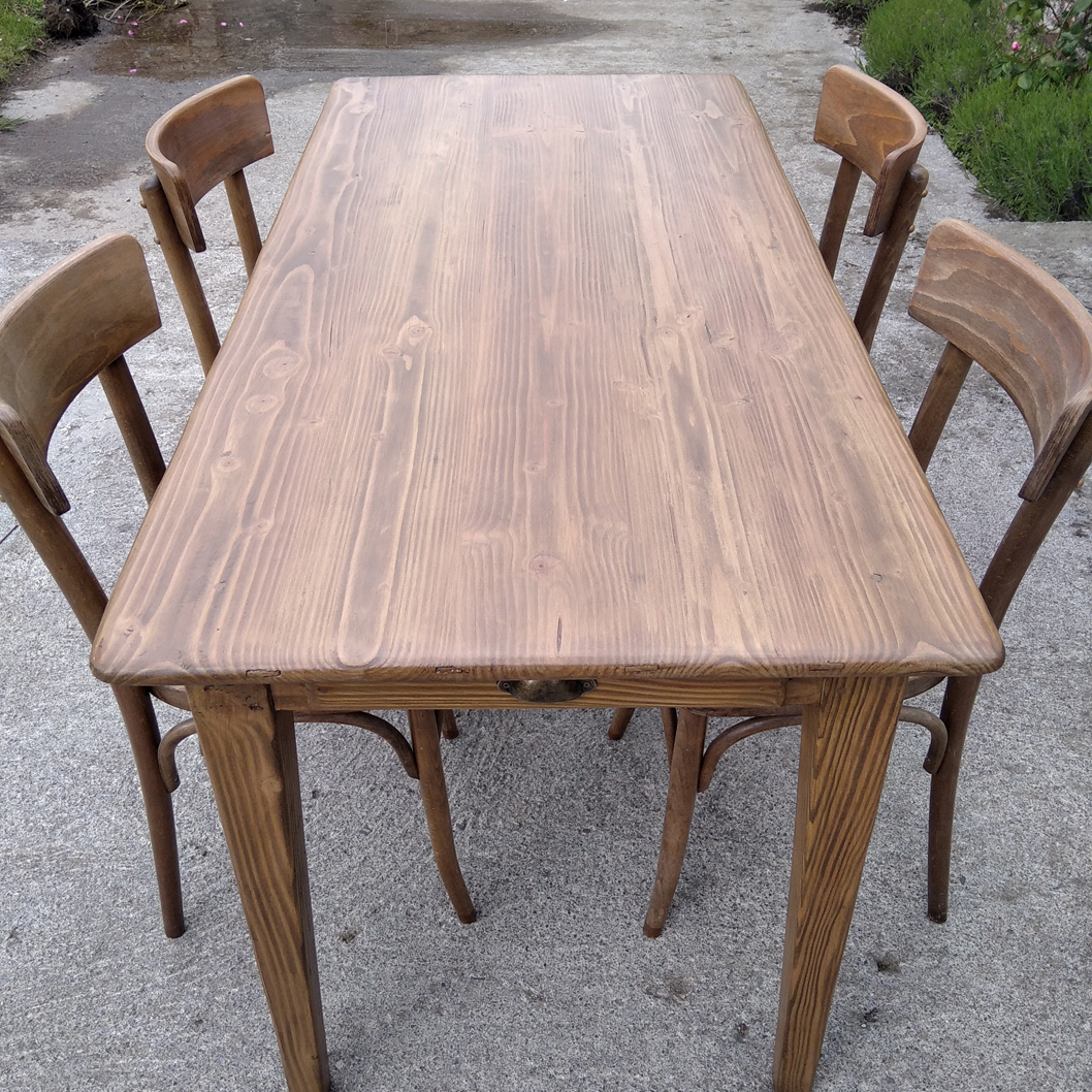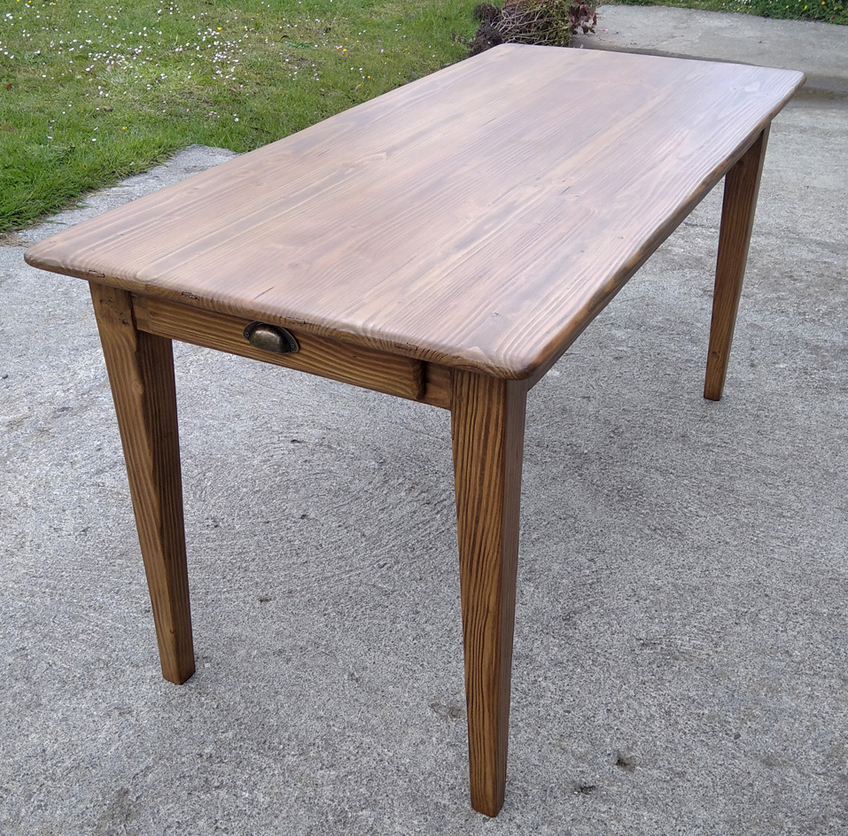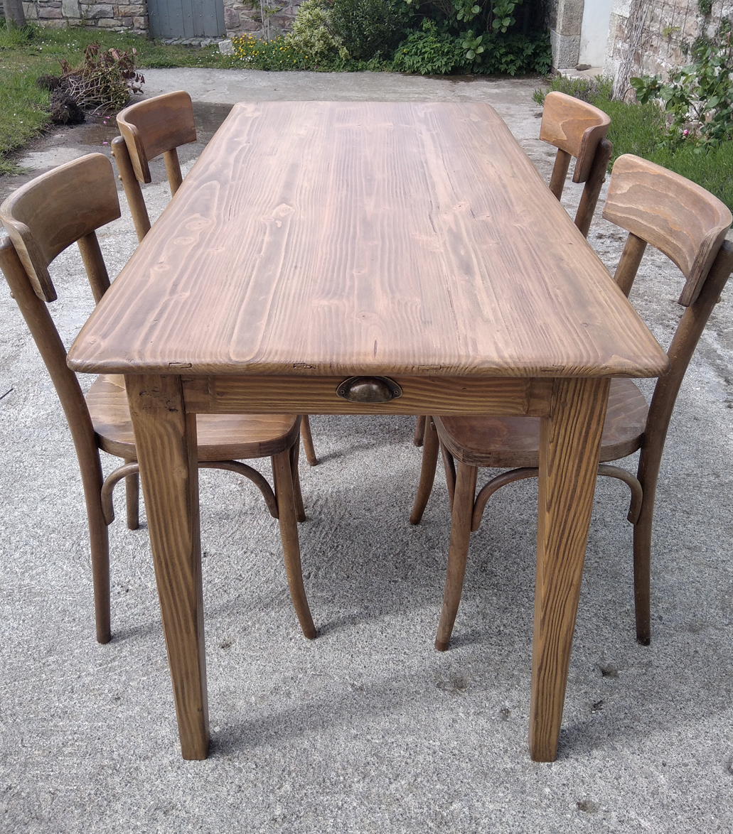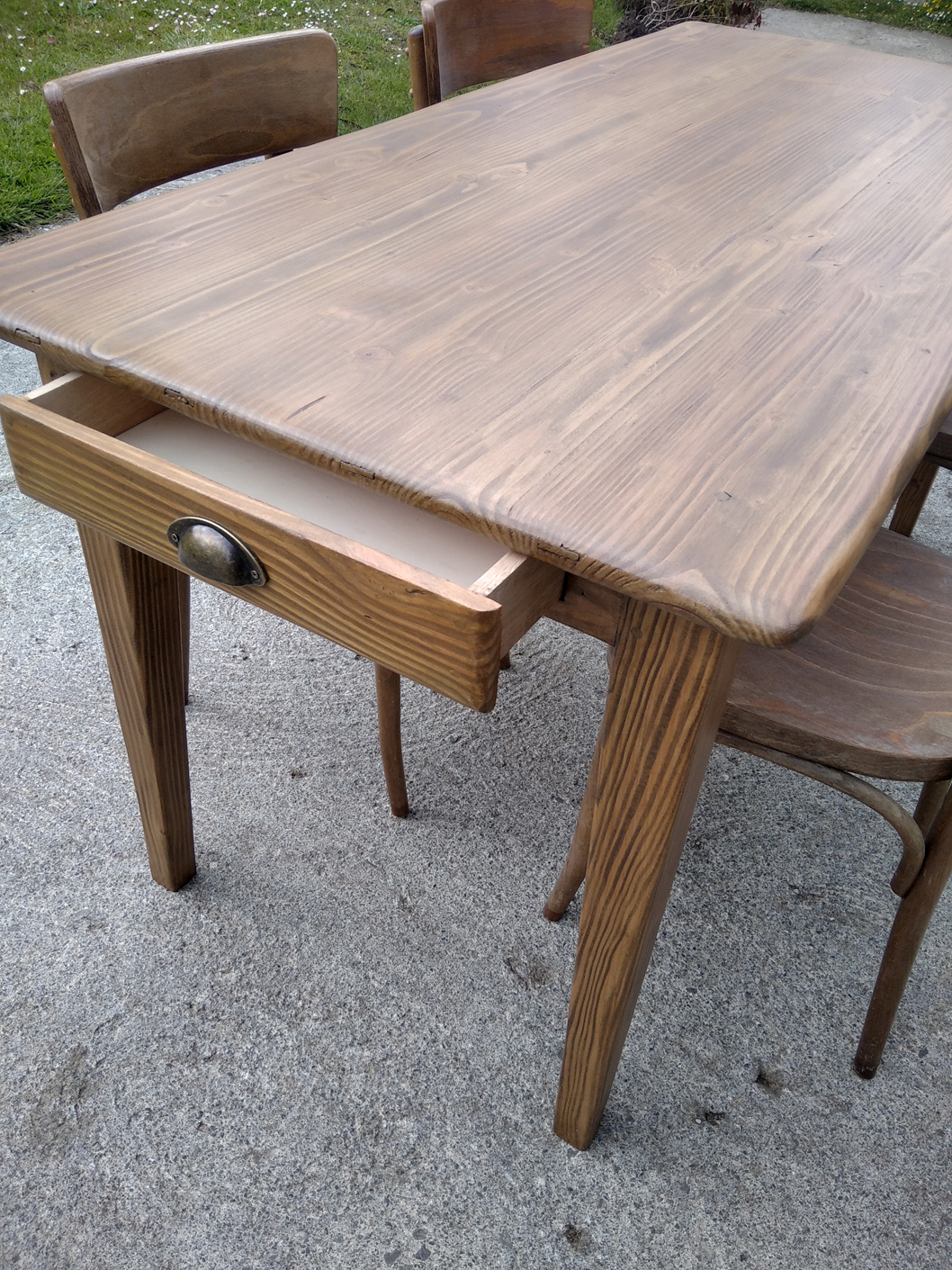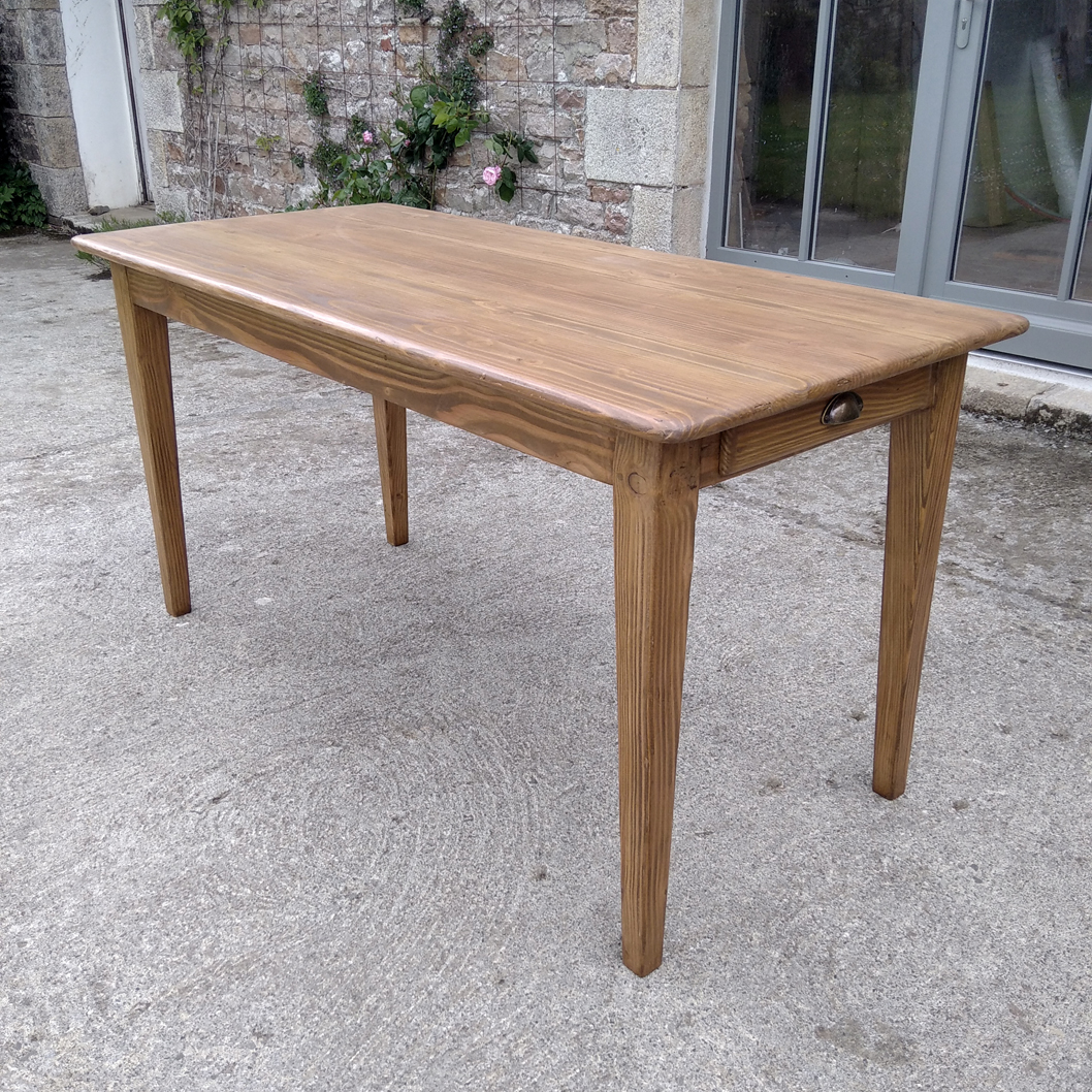Table en pin douglas de 4/6 personnes. Finition chene moyen. 1 petit tiroir avec poignée style ancien.