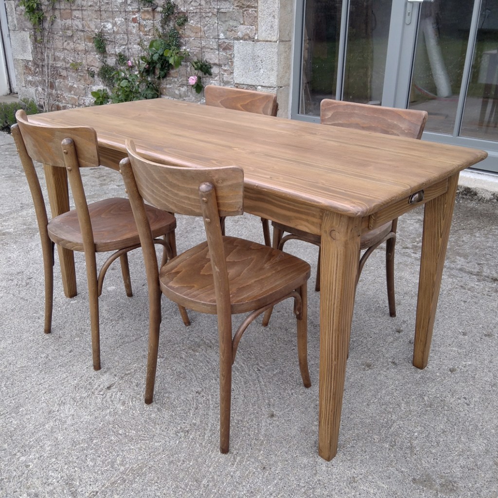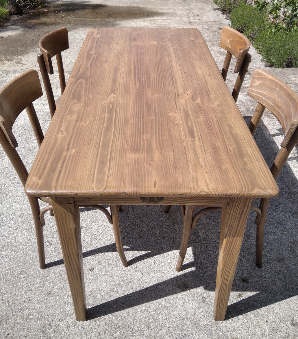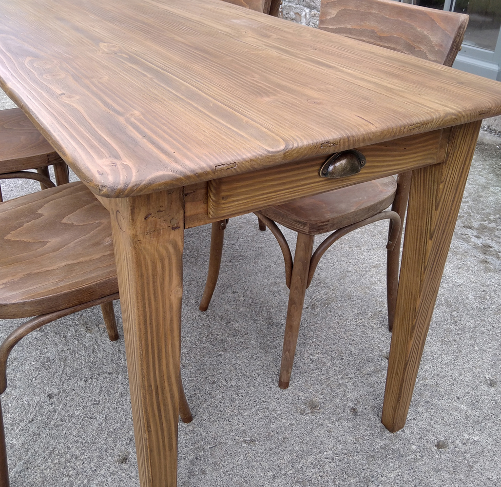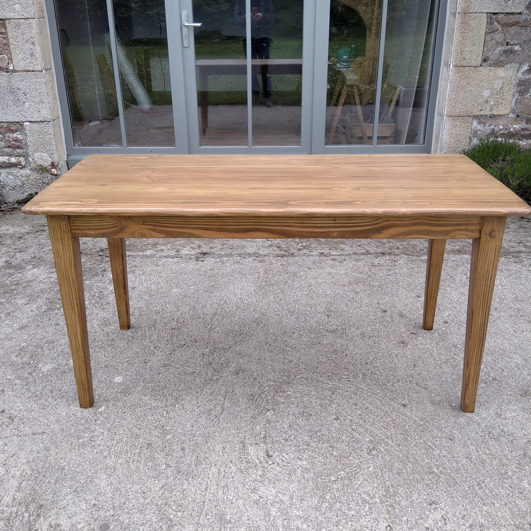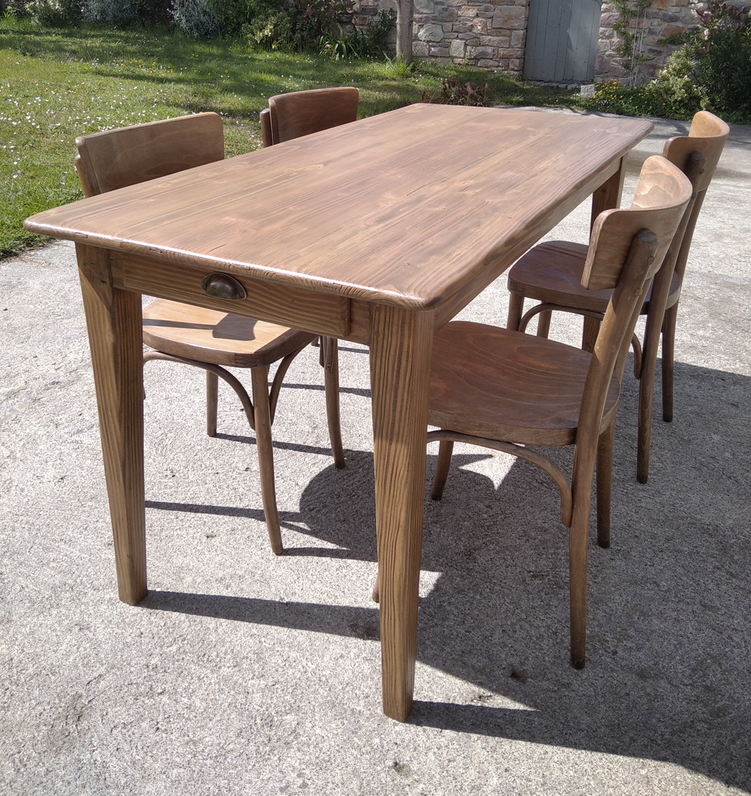 Table en pin douglas de 4/6 personnes. Finition chene moyen. 1 petit tiroir avec poignée style ancien.