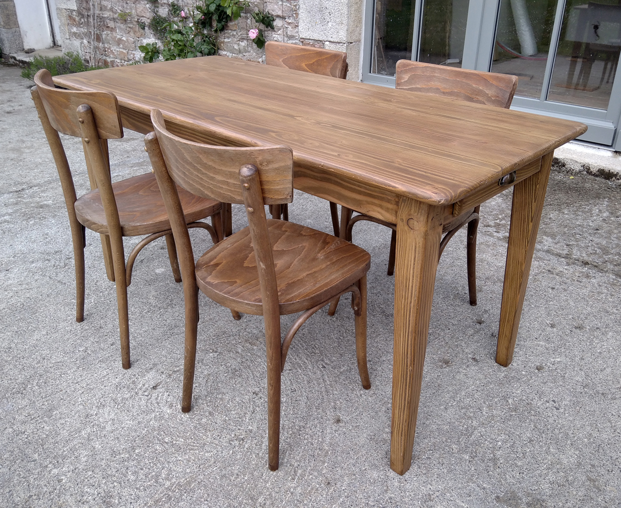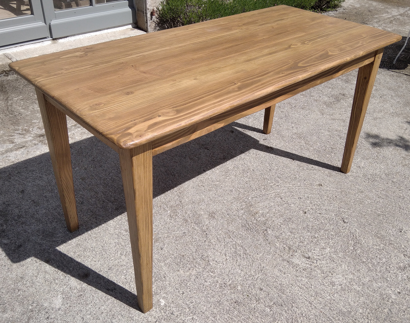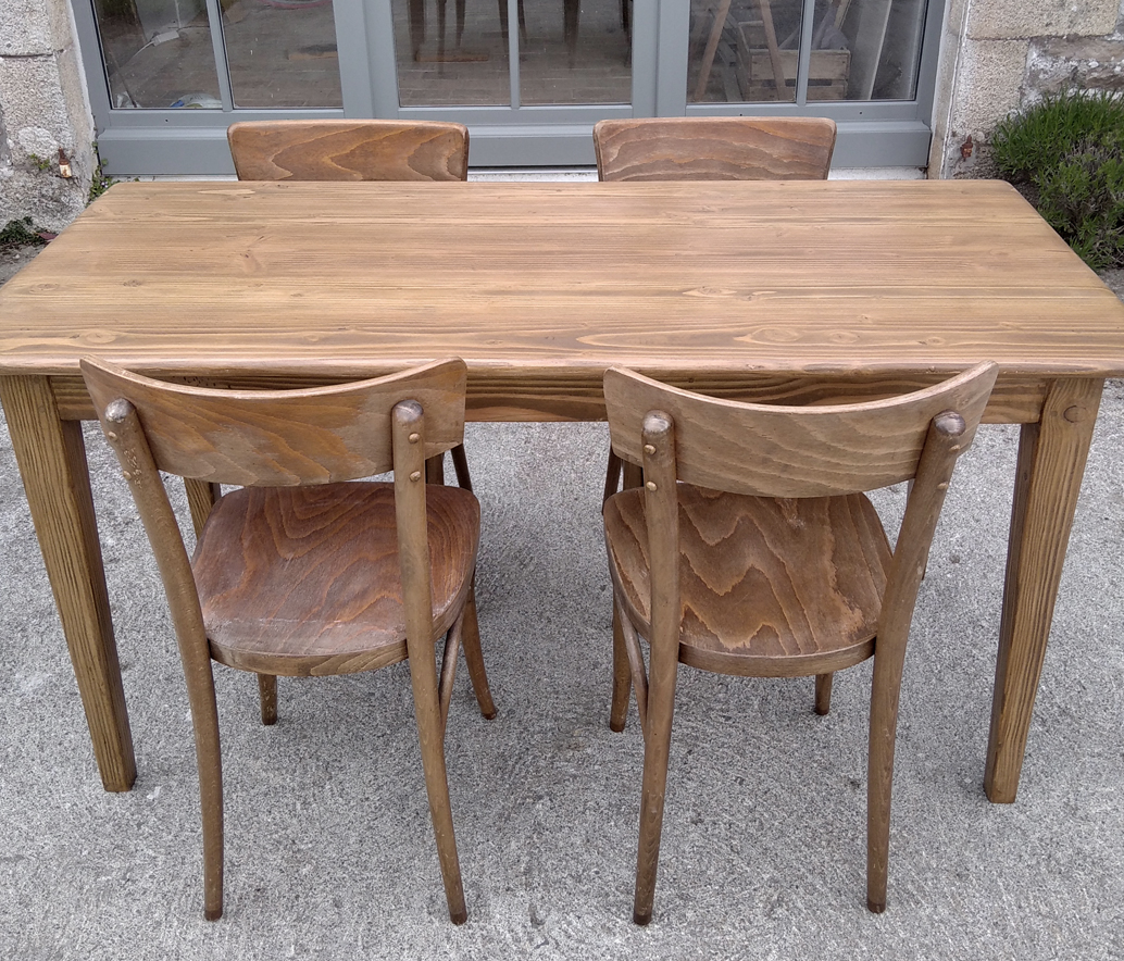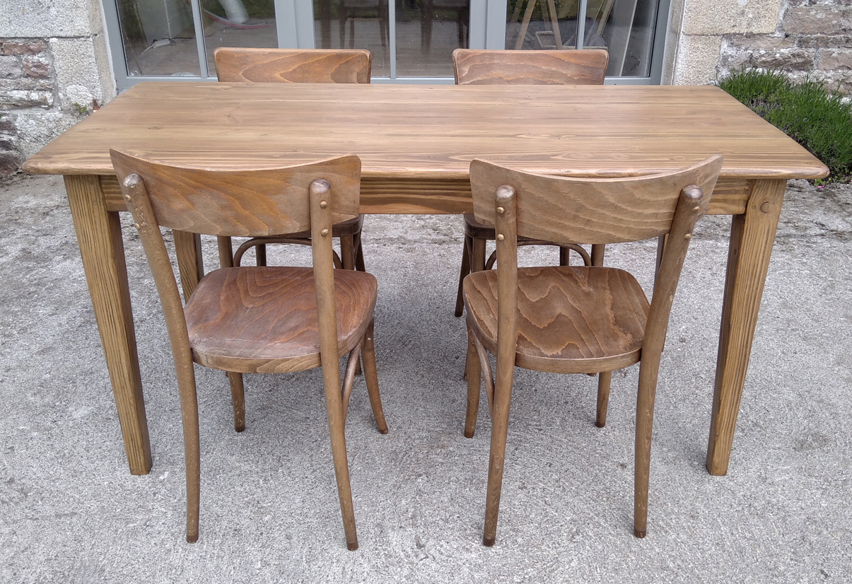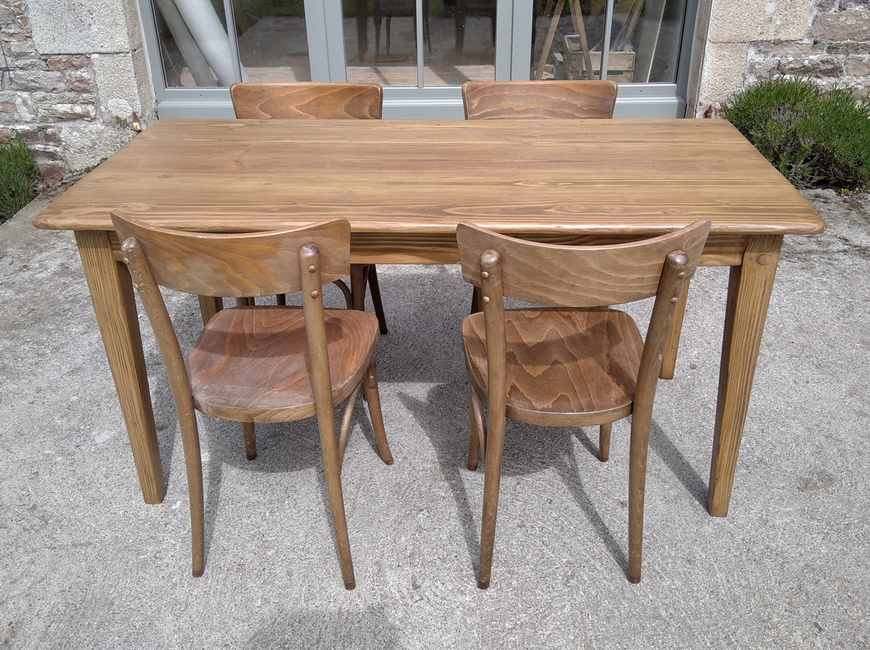 Table en pin douglas de 4/6 personnes. Finition chene moyen. 1 petit tiroir avec poignée style ancien.