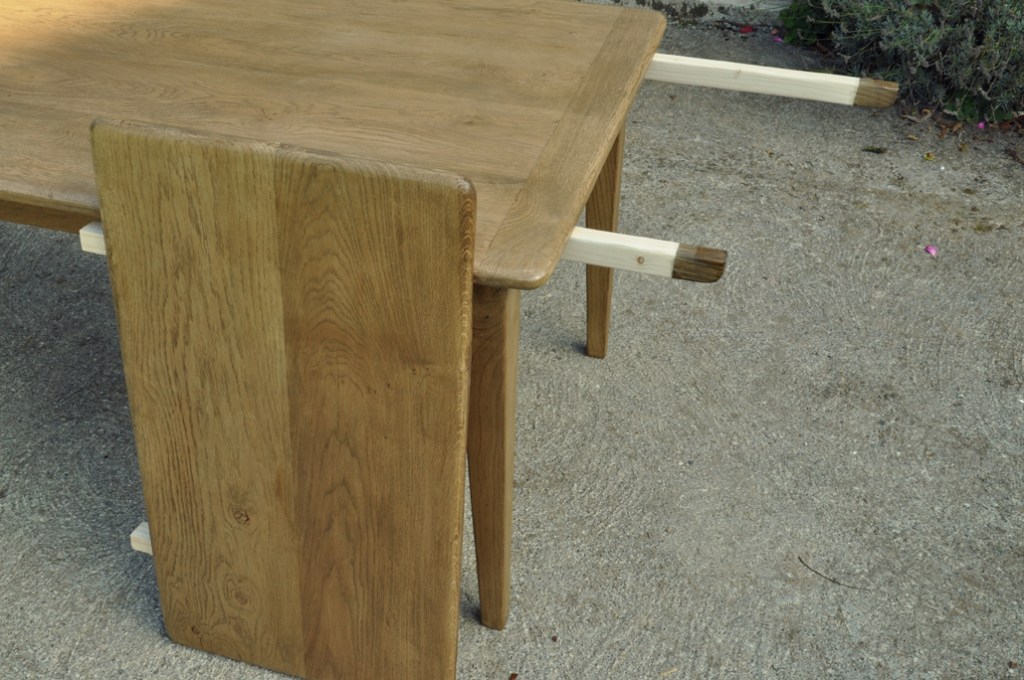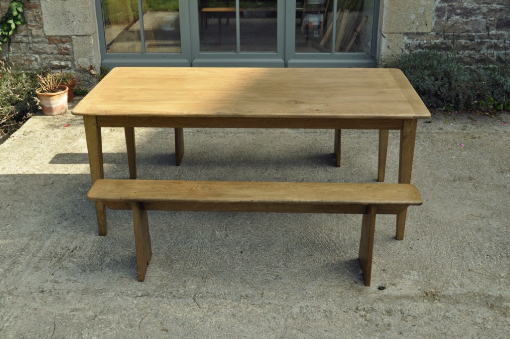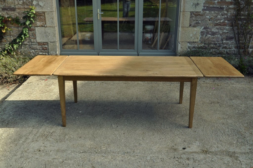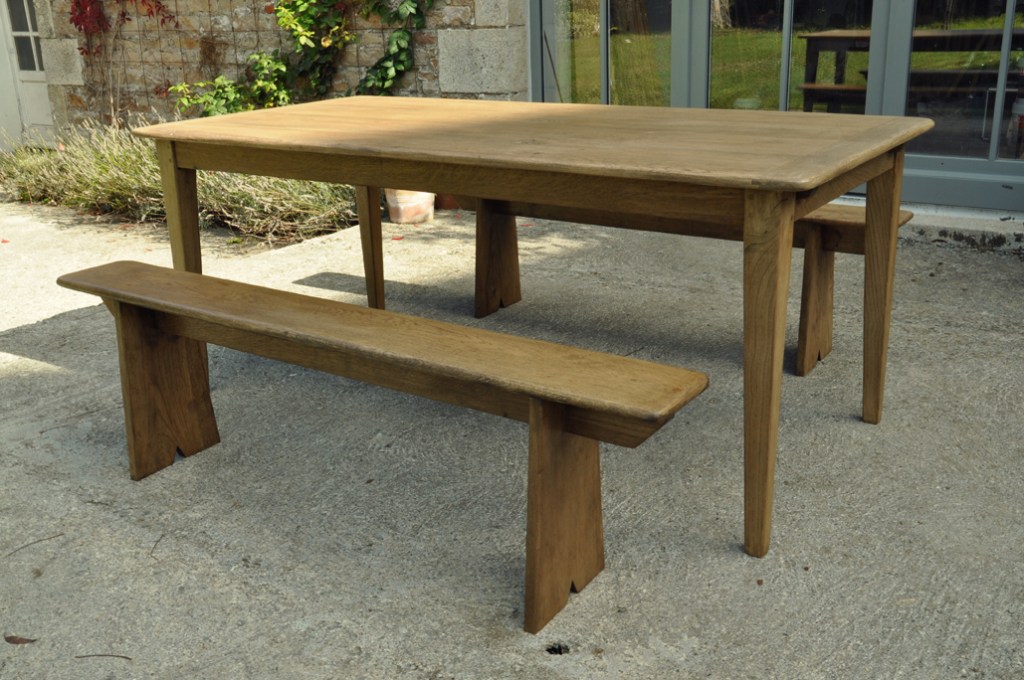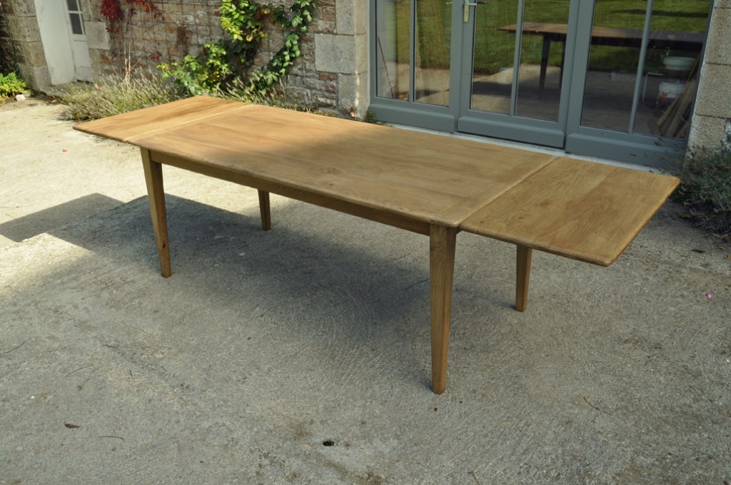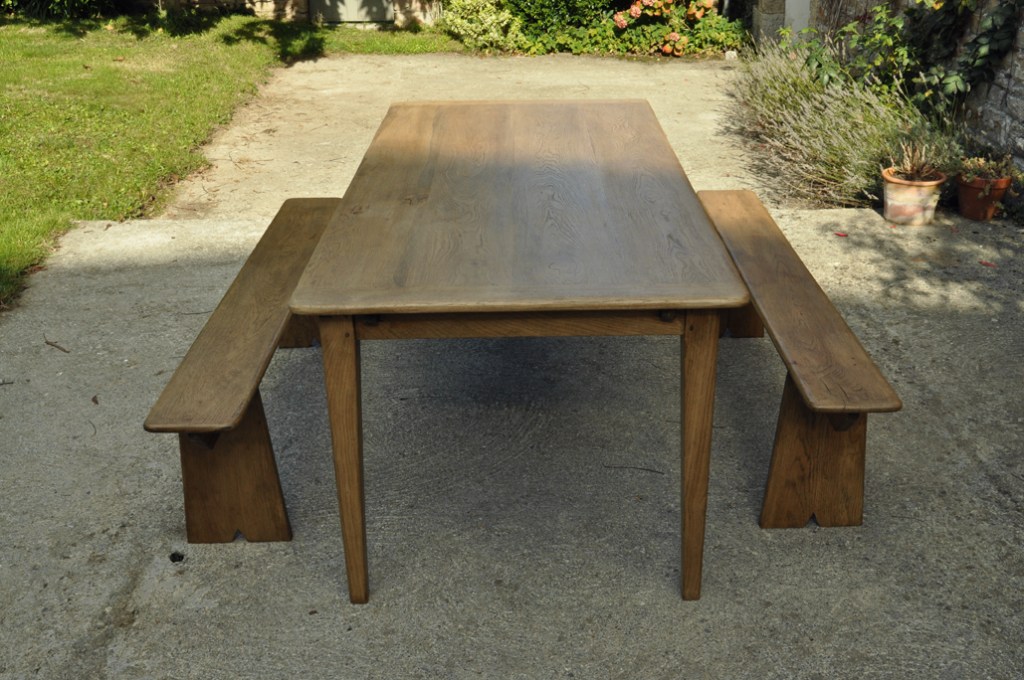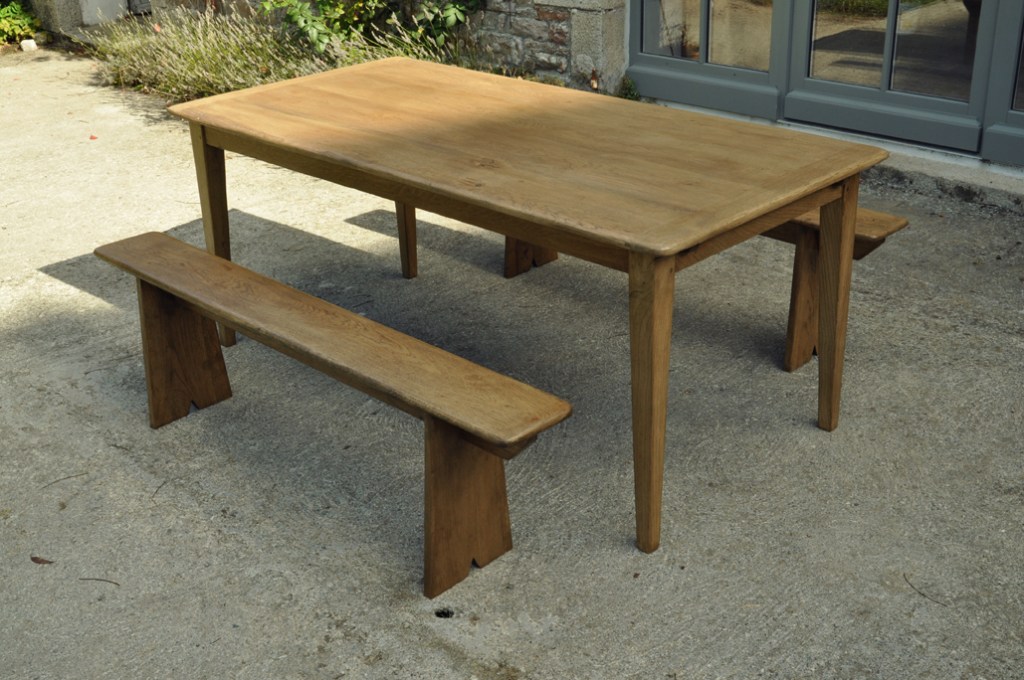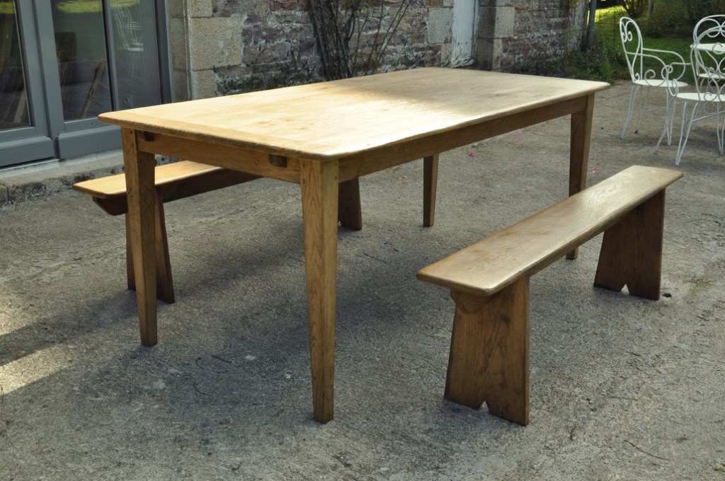 Table en chêne pour 8 à 14 convives et ses deux bancs de 160x24cm . Montage plateau avec traverses perpendiculaires. Deux rallonges de 50cm.
