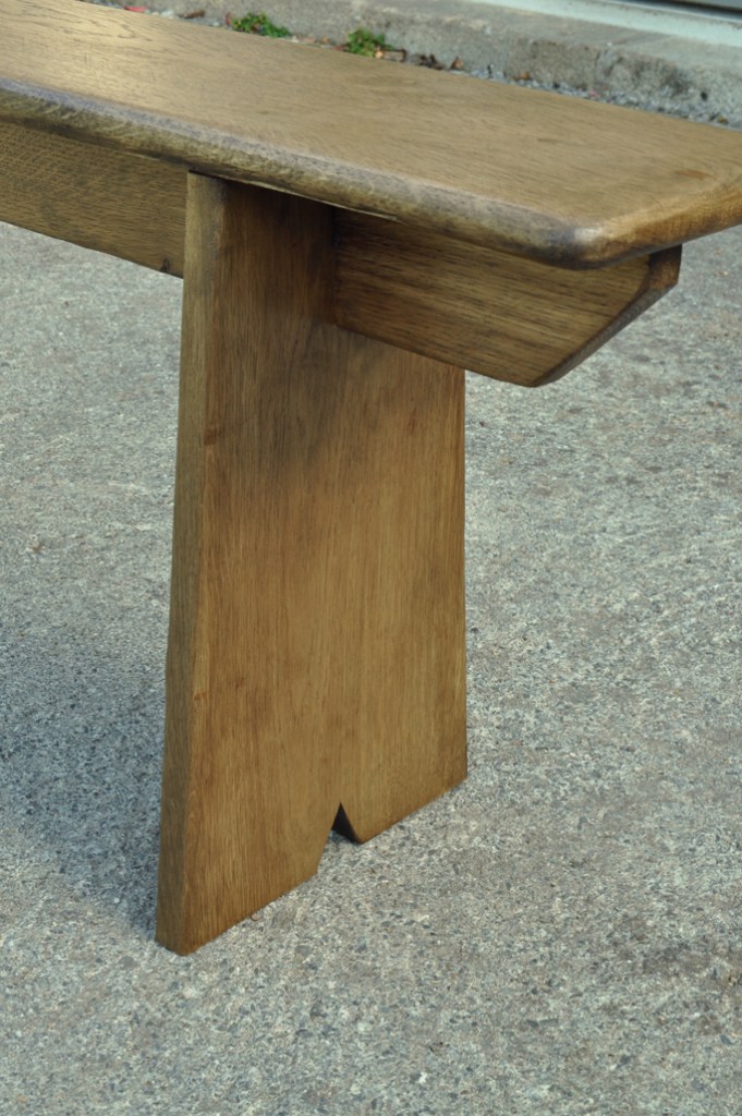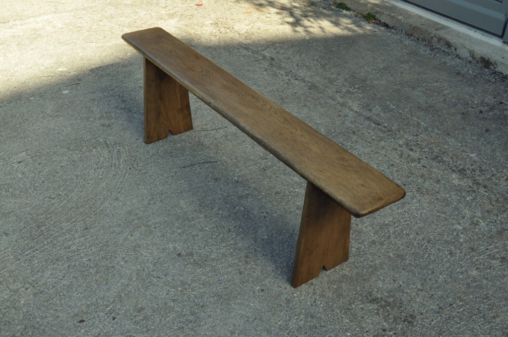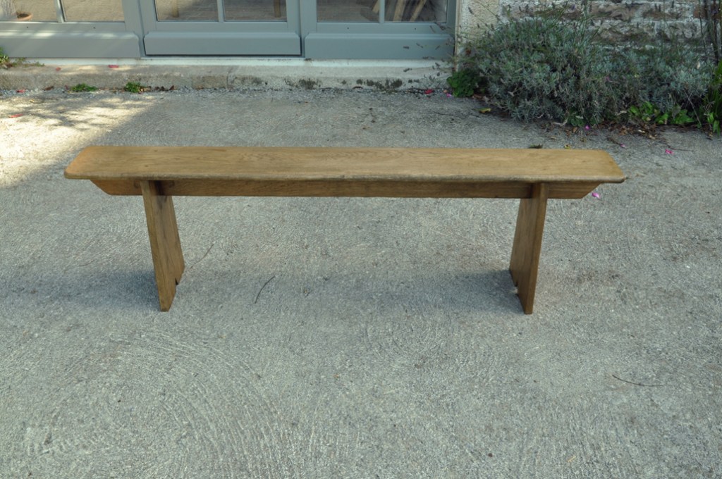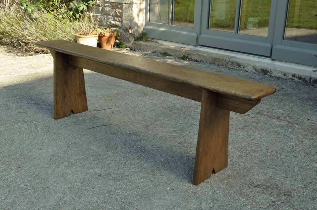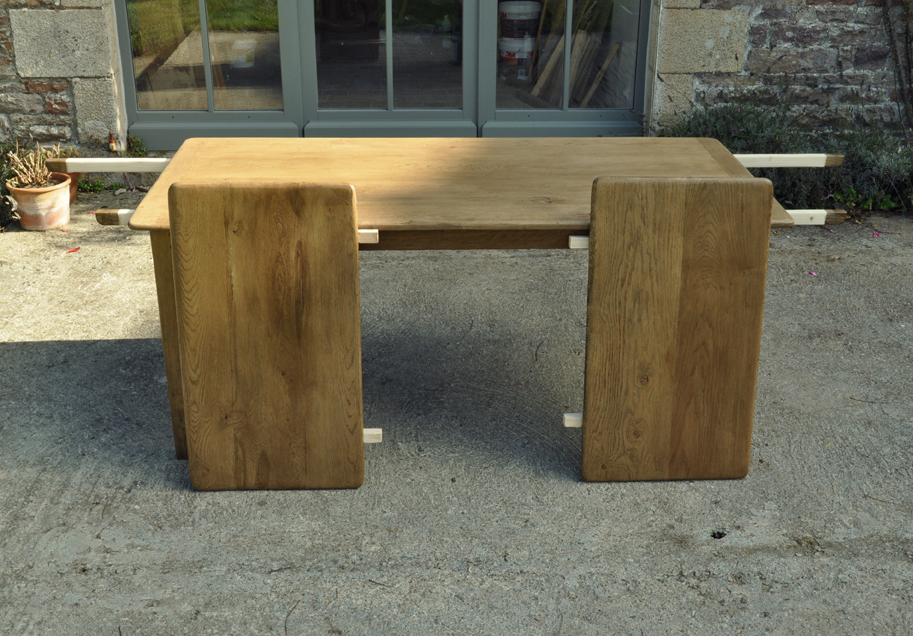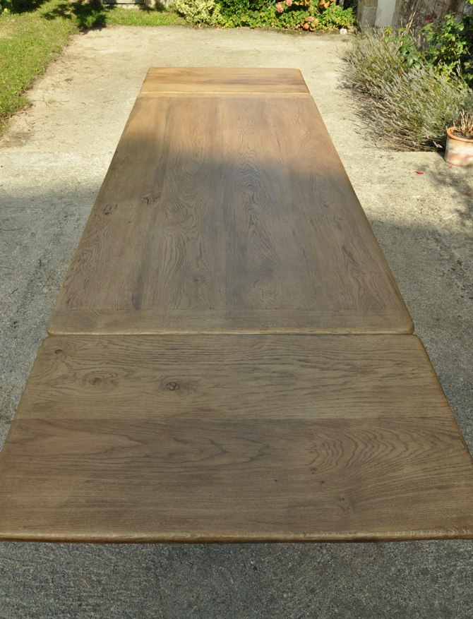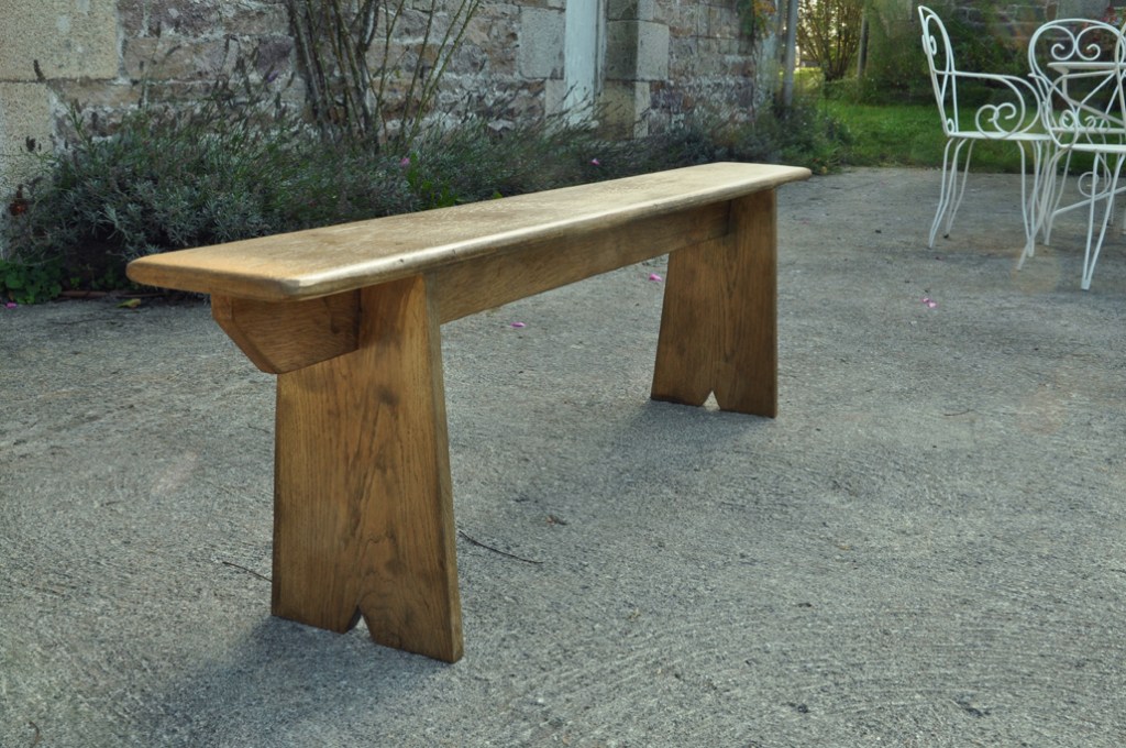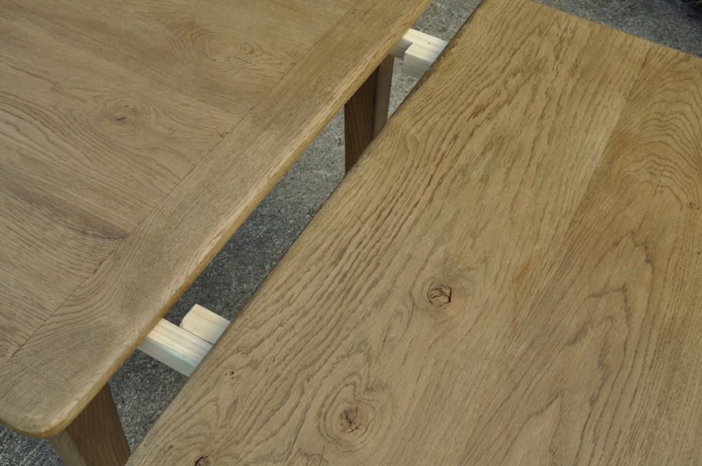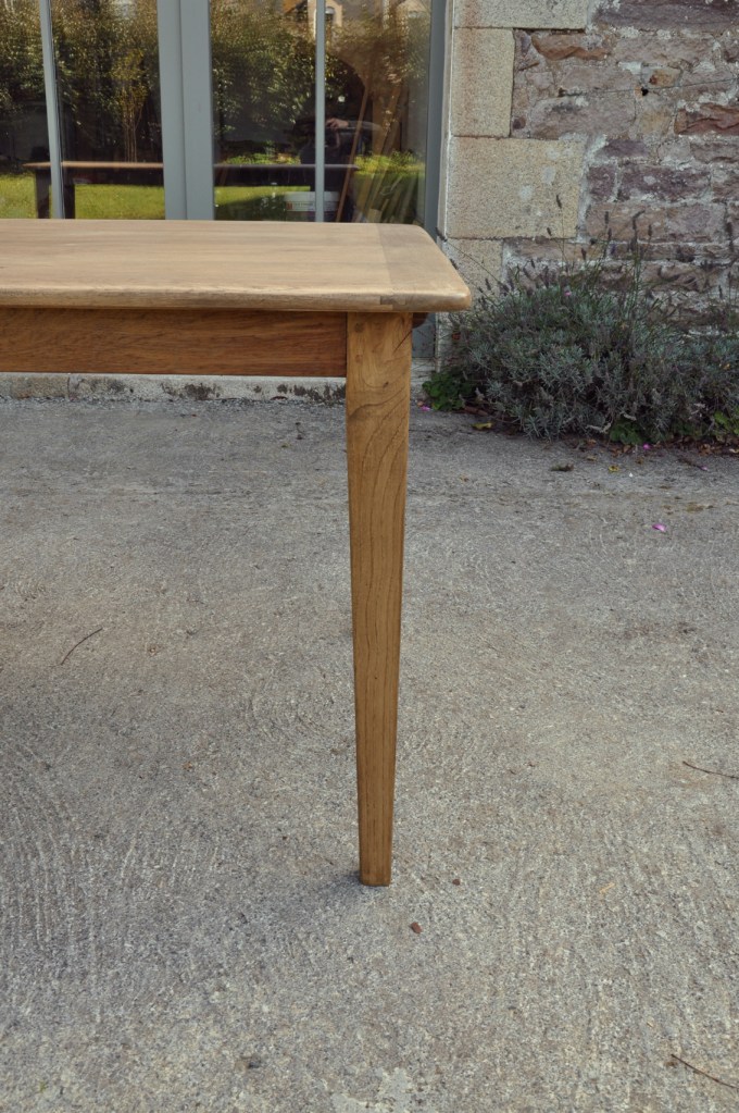 Table en chêne pour 8 à 14 convives et ses deux bancs de 160x24cm . Montage plateau avec traverses perpendiculaires. Deux rallonges de 50cm.