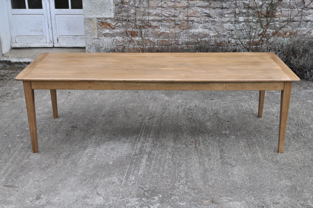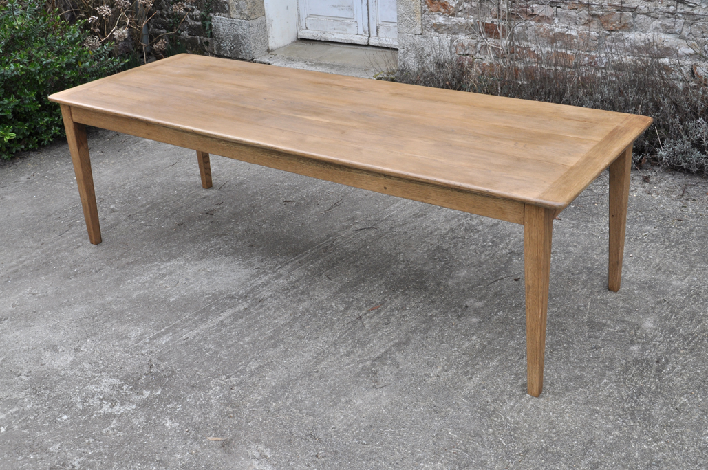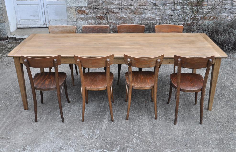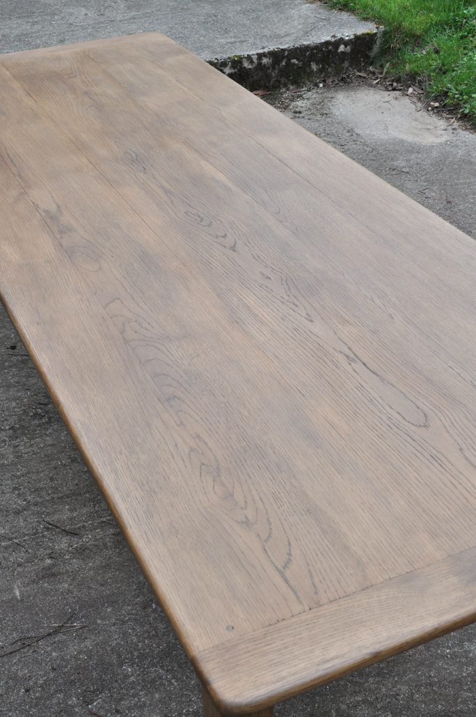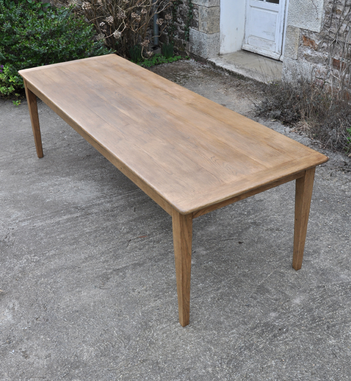Grande table de ferme en chêne ton noyer réhaussé d’un ton chaud. Elle peut accueillir 8/10 personnes confortablement.
