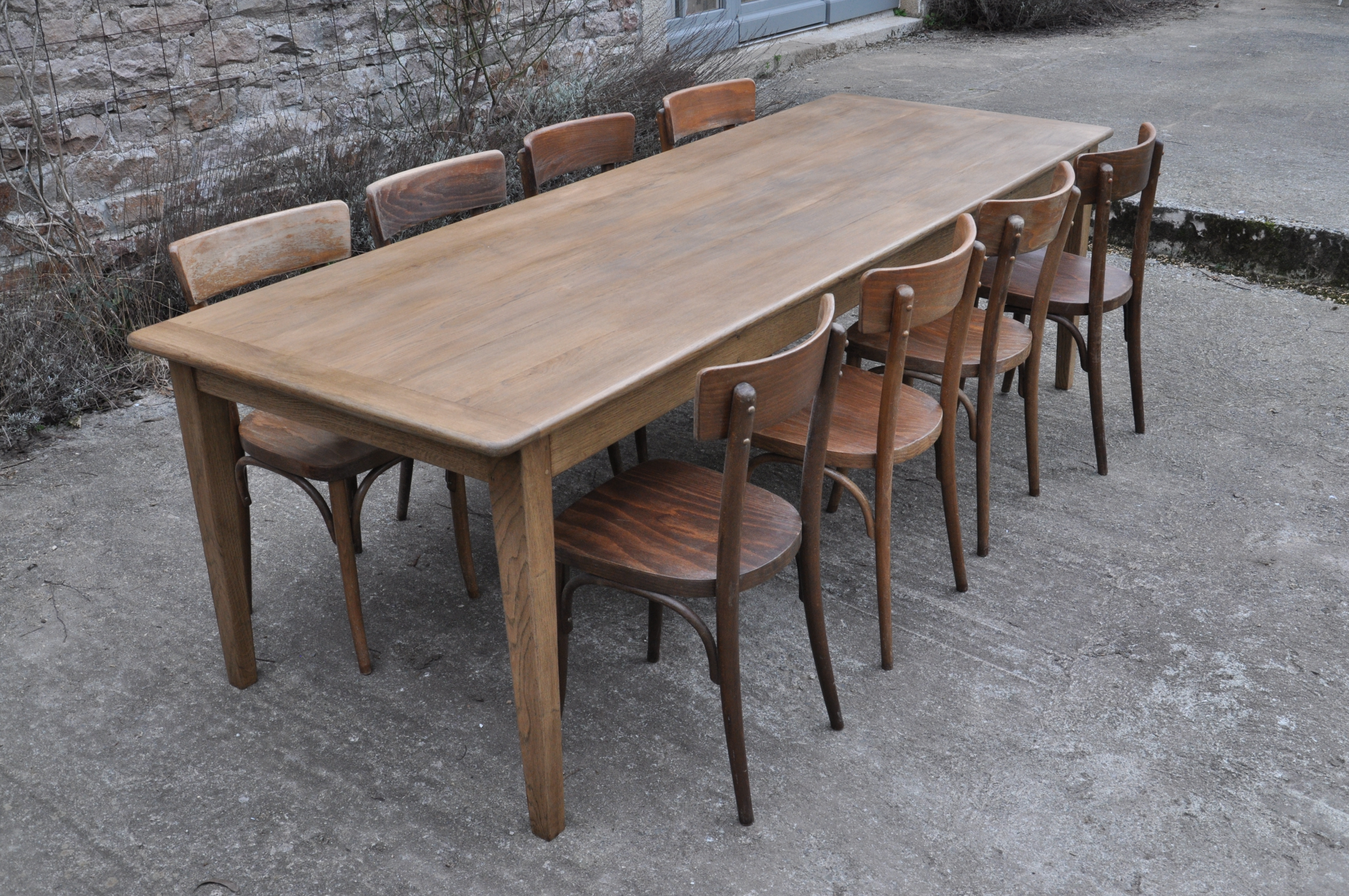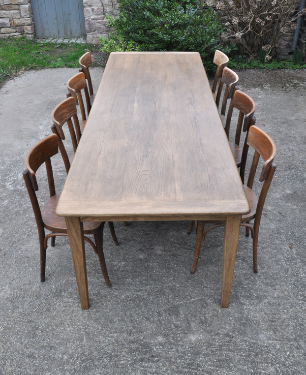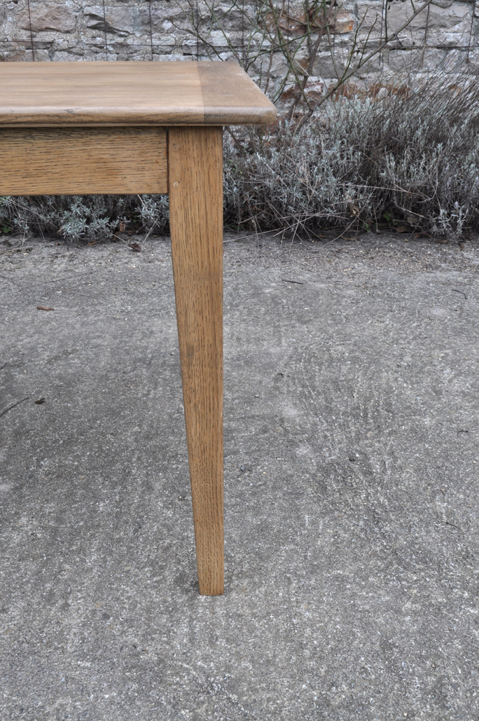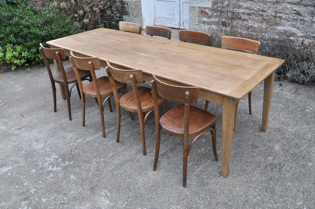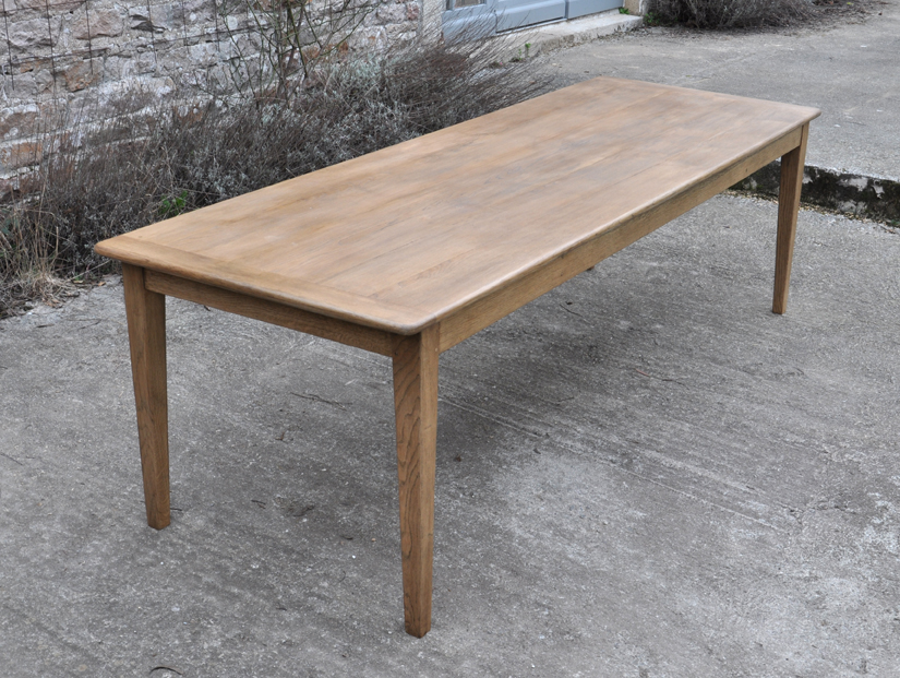 Grande table de ferme en chêne ton noyer réhaussé d’un ton chaud. Elle peut accueillir 8/10 personnes confortablement.
