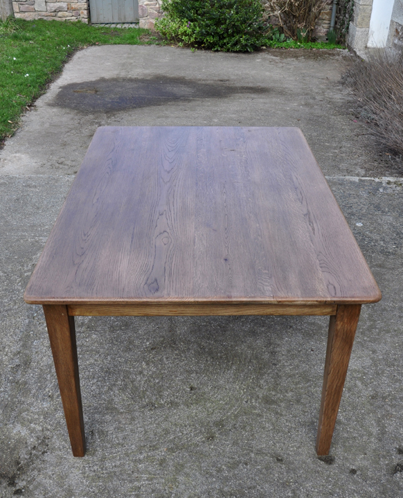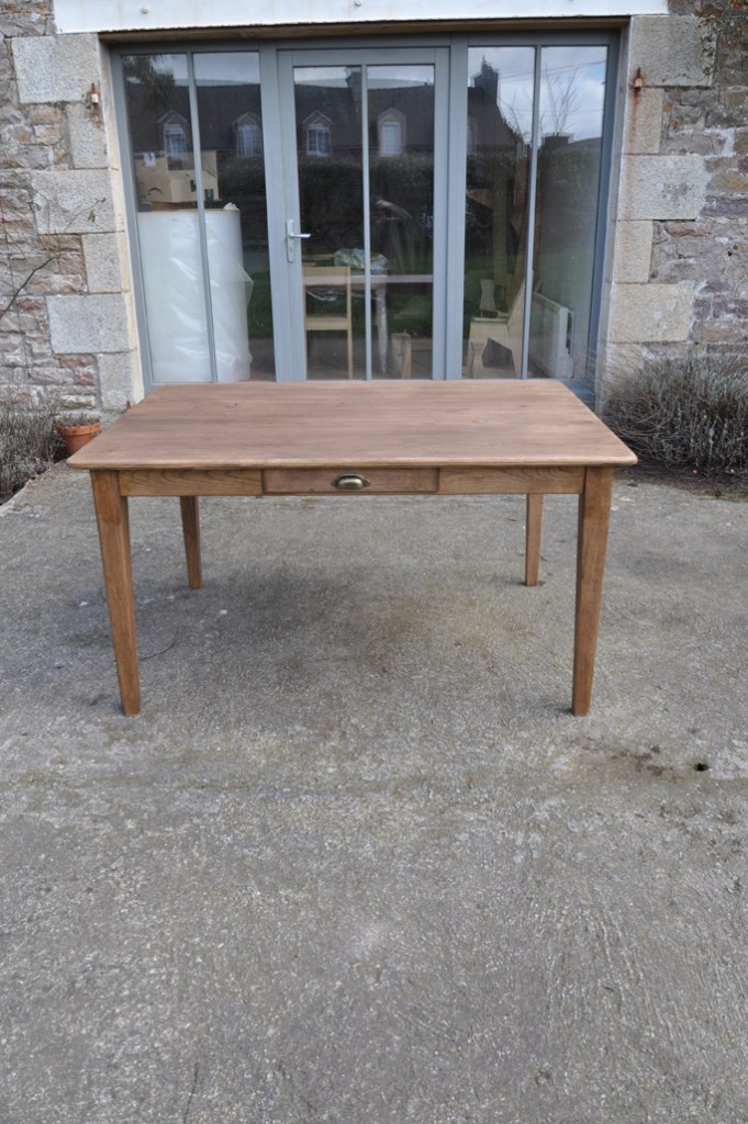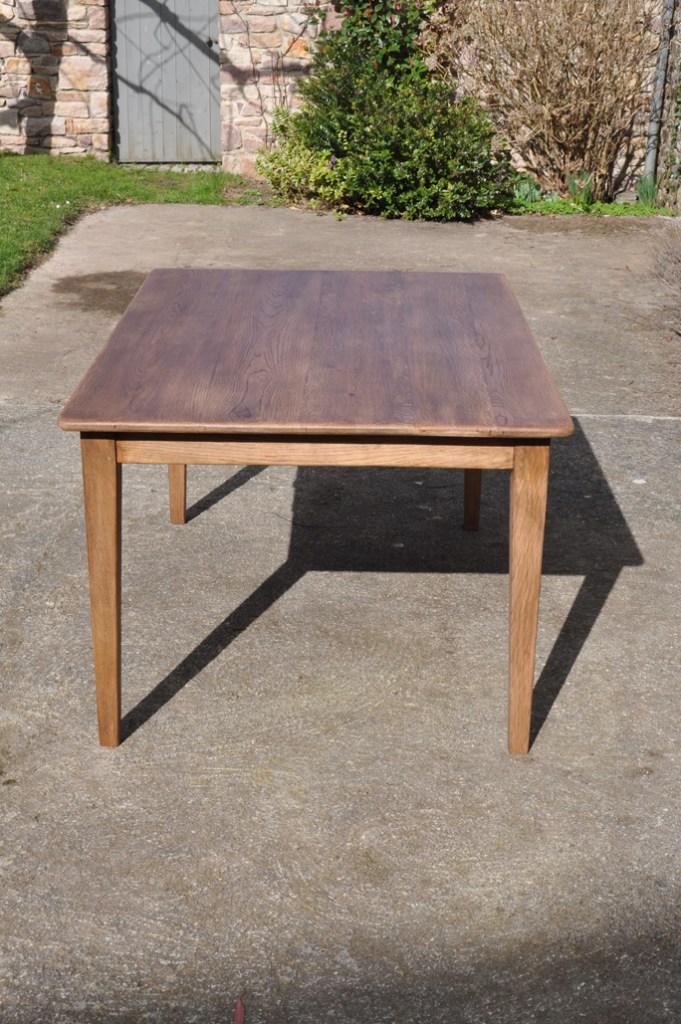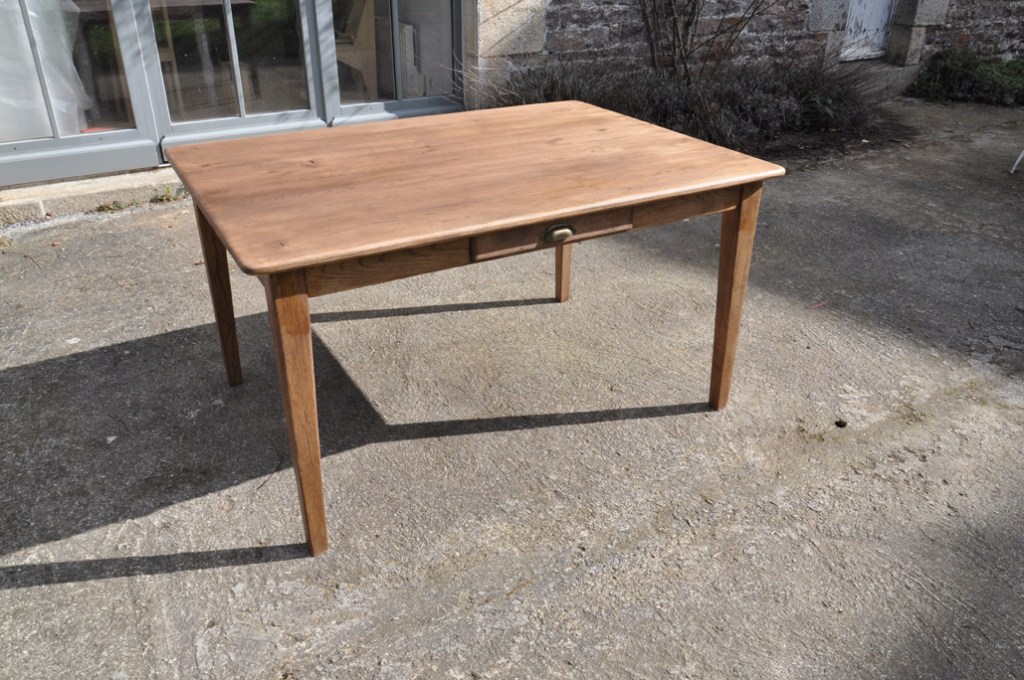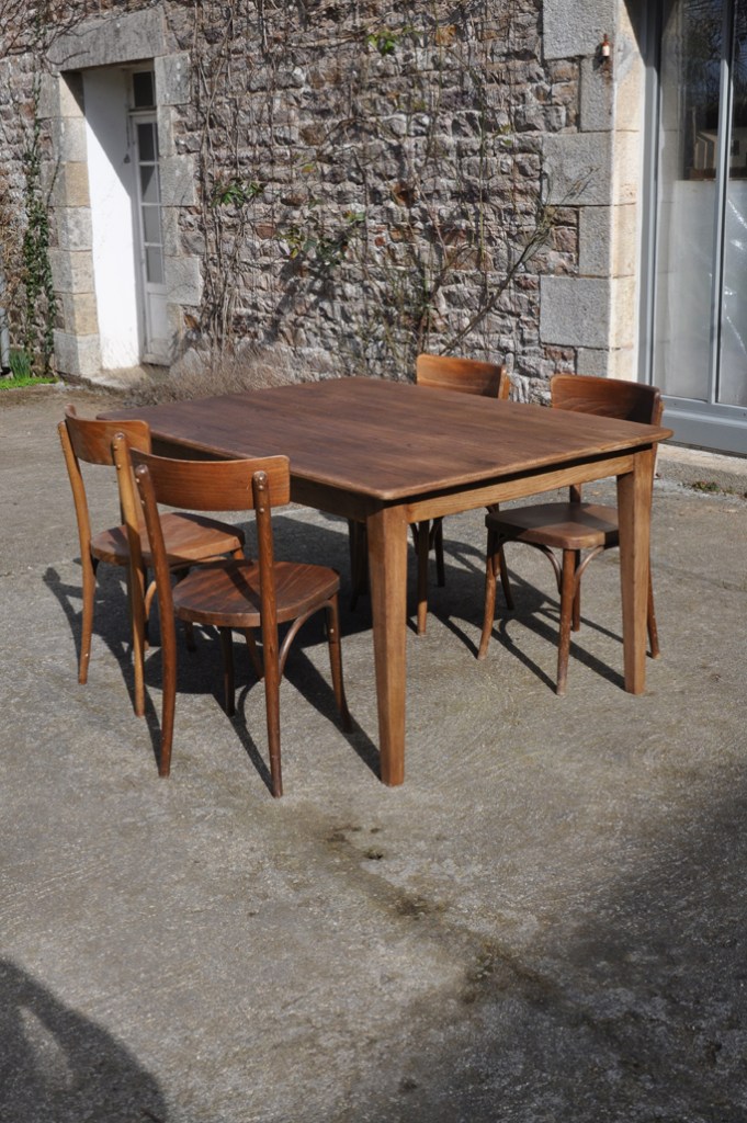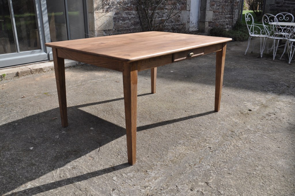 Table de ferme pieds fuseaux en chene teinté noyer. Elle peut accueillir confortablement 4 à 6 personnes grâce à sa grande largeur.