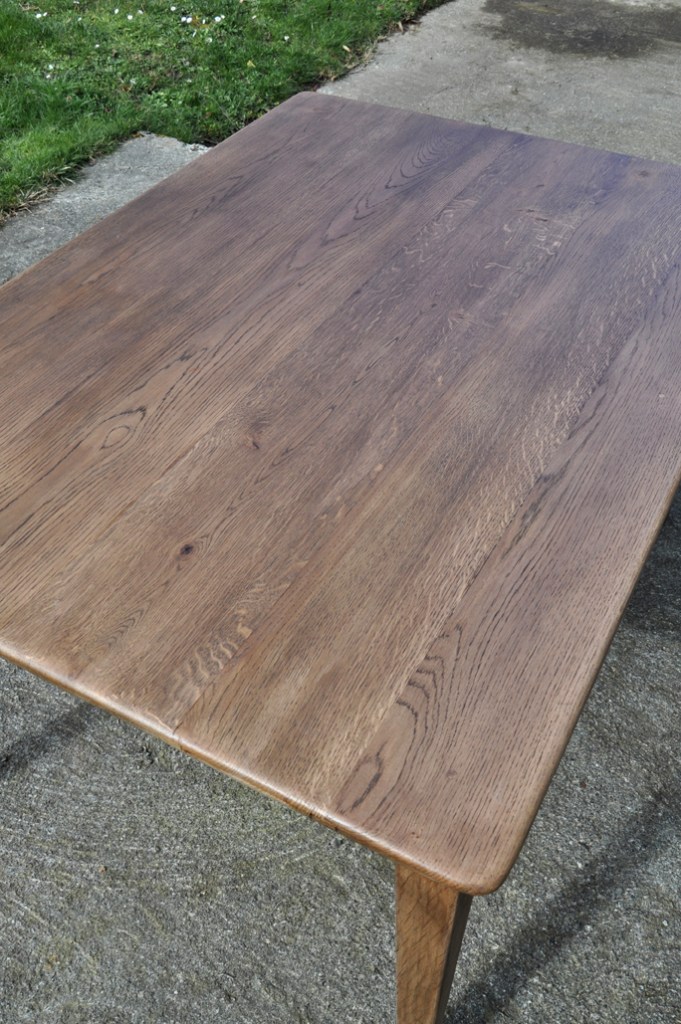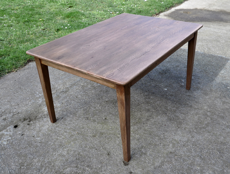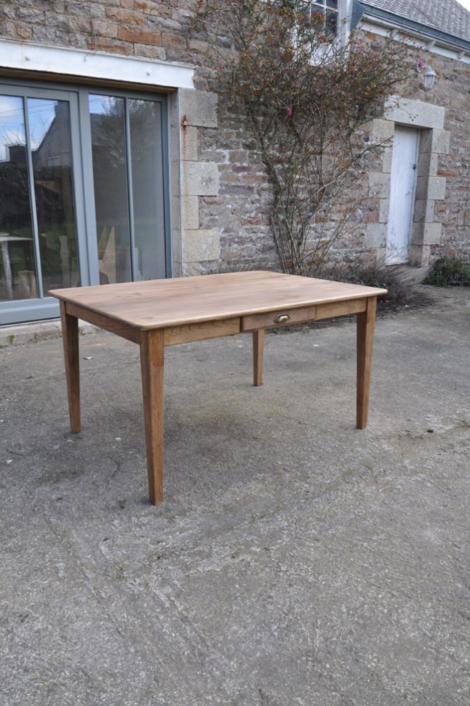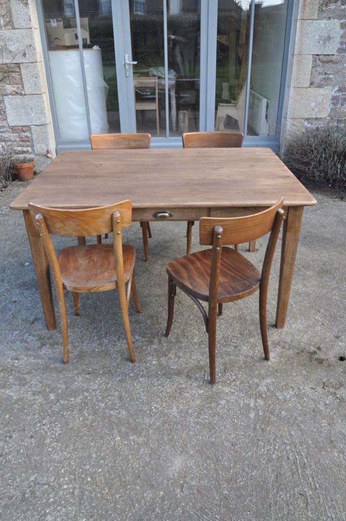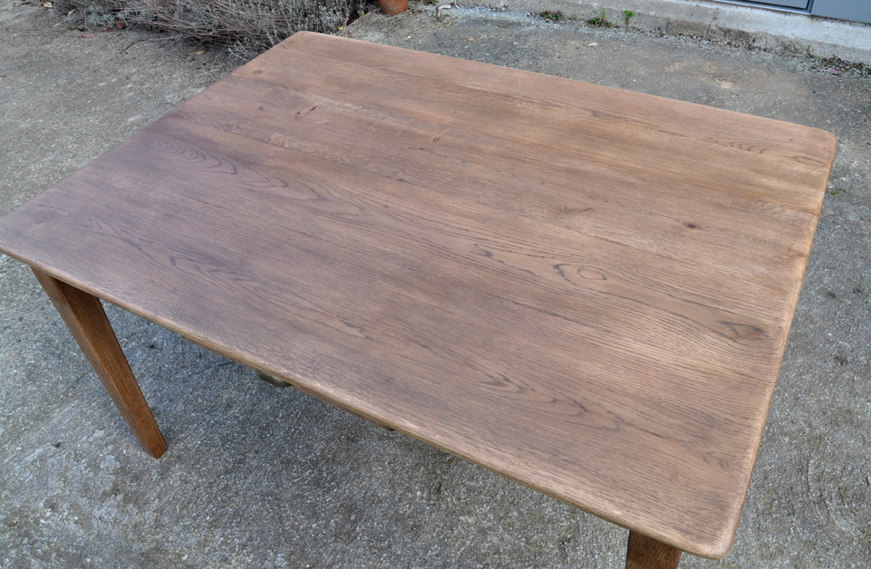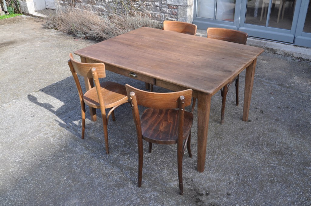 Table de ferme pieds fuseaux en chene teinté noyer. Elle peut accueillir confortablement 4 à 6 personnes grâce à sa grande largeur.