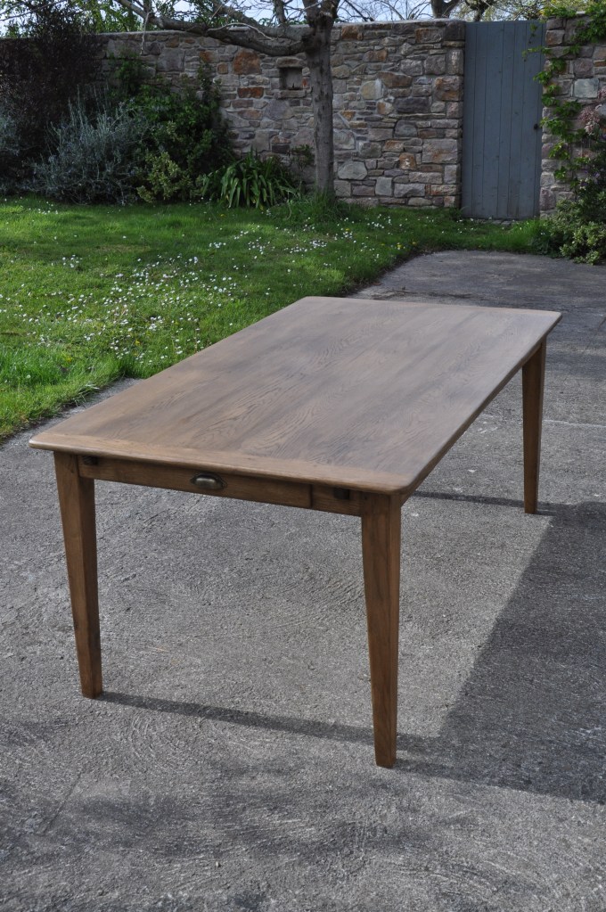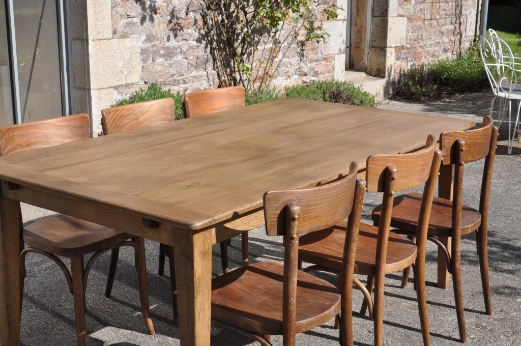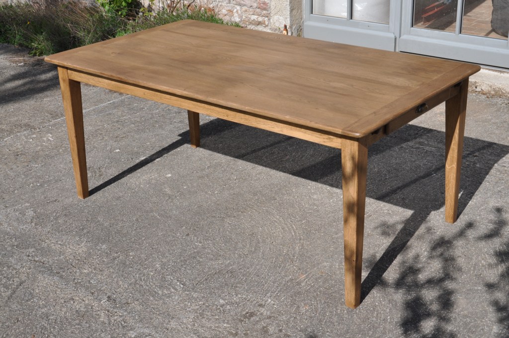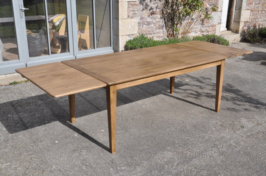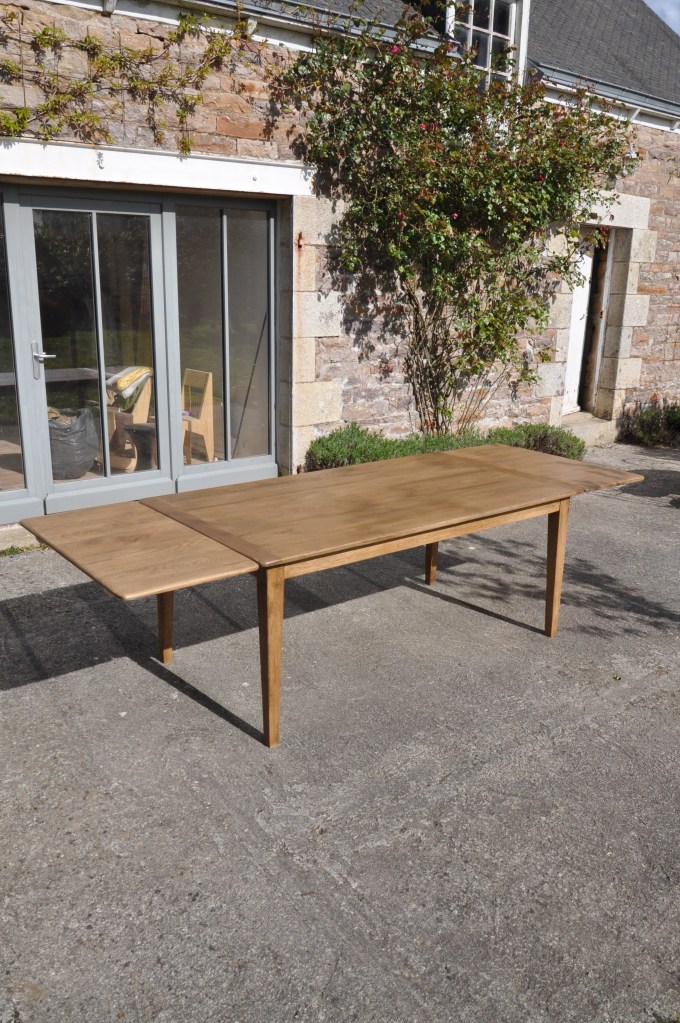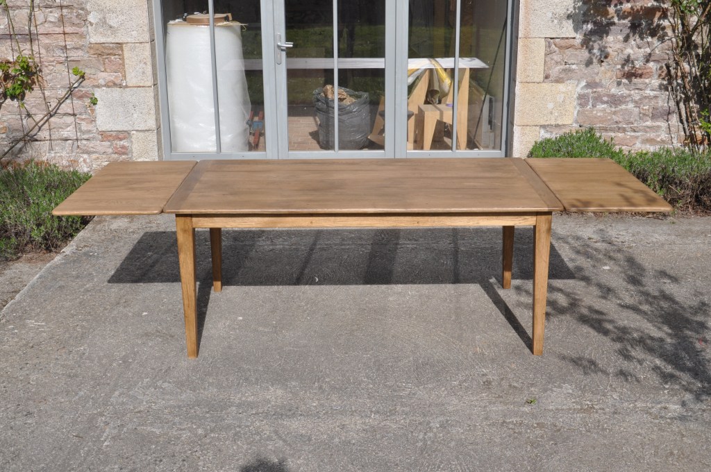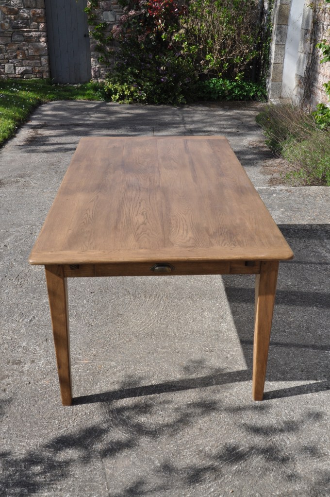 Table de ferme en chêne pour 6 à 12 personnes grâce à ses deux rallonges et sa grande largeur. Elle est aussi munie d’un petit tiroir avec poignée coquille.