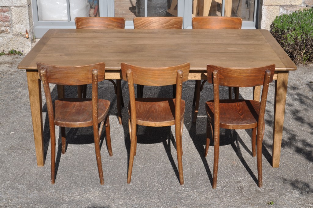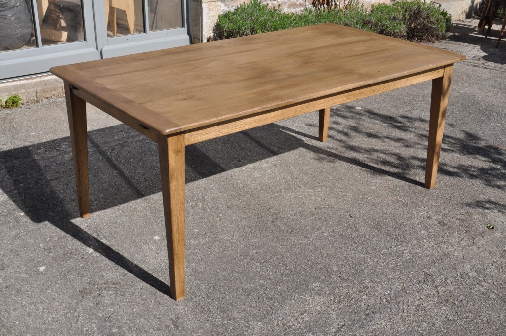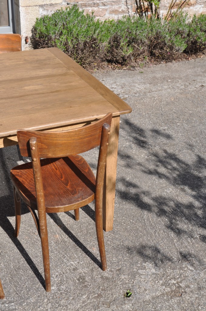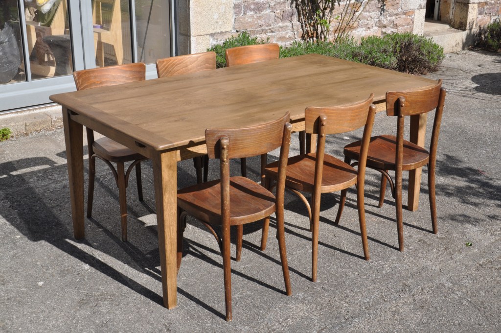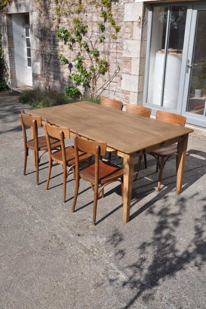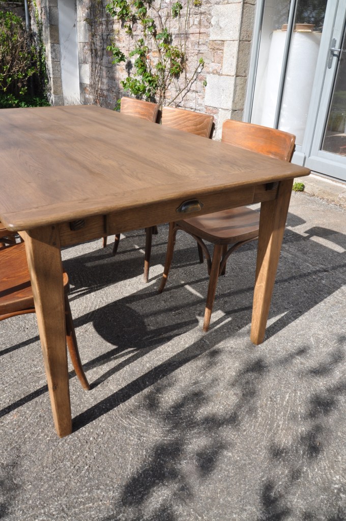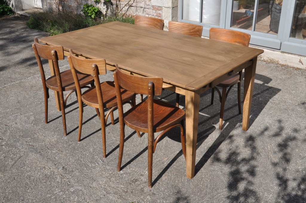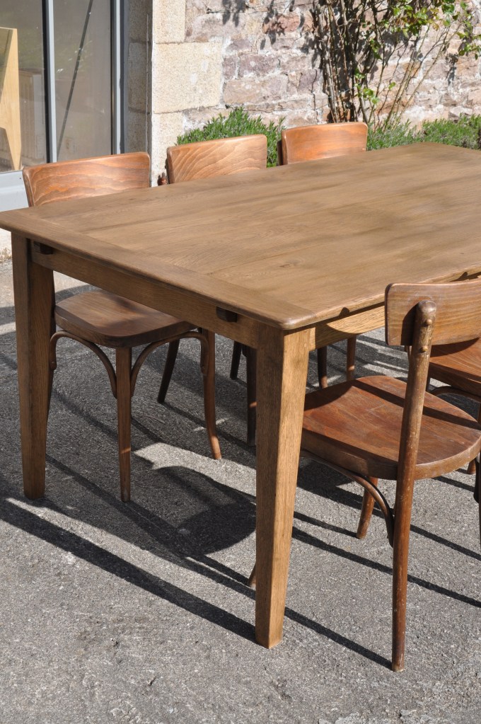 Table de ferme en chêne pour 6 à 12 personnes grâce à ses deux rallonges et sa grande largeur. Elle est aussi munie d’un petit tiroir avec poignée coquille.