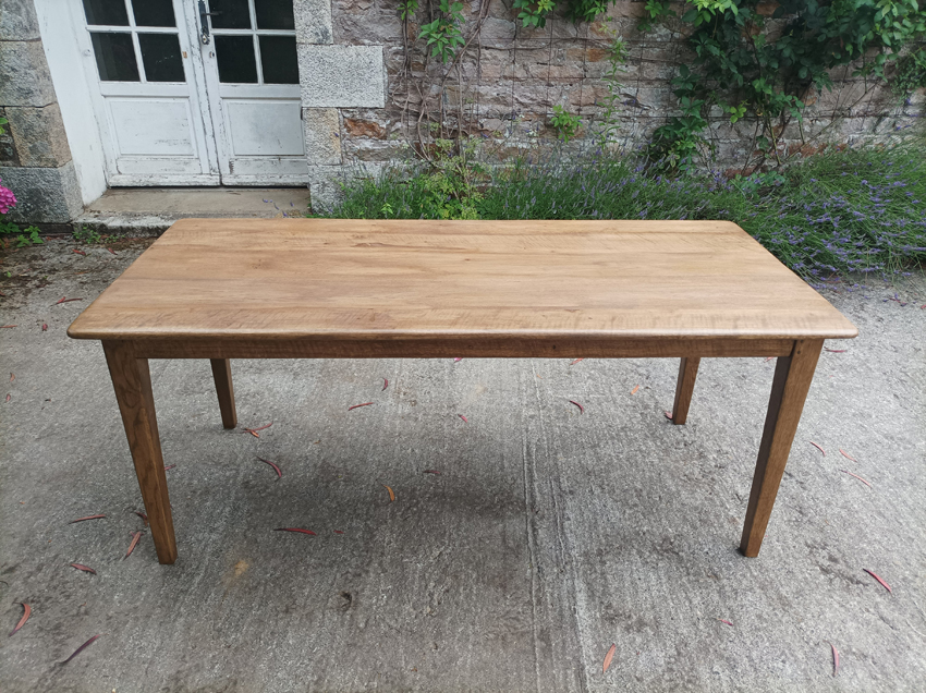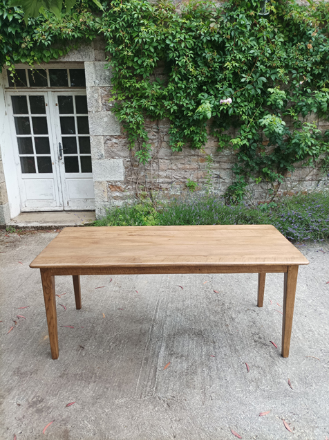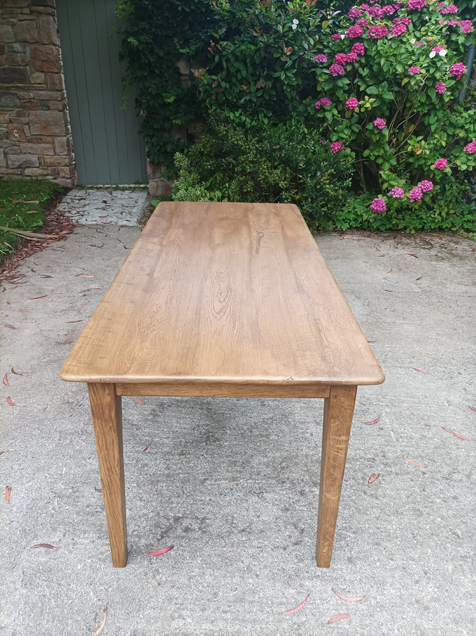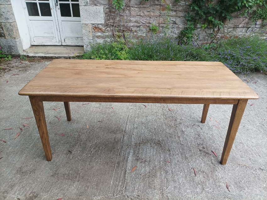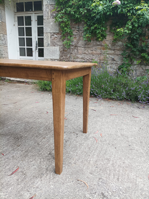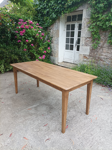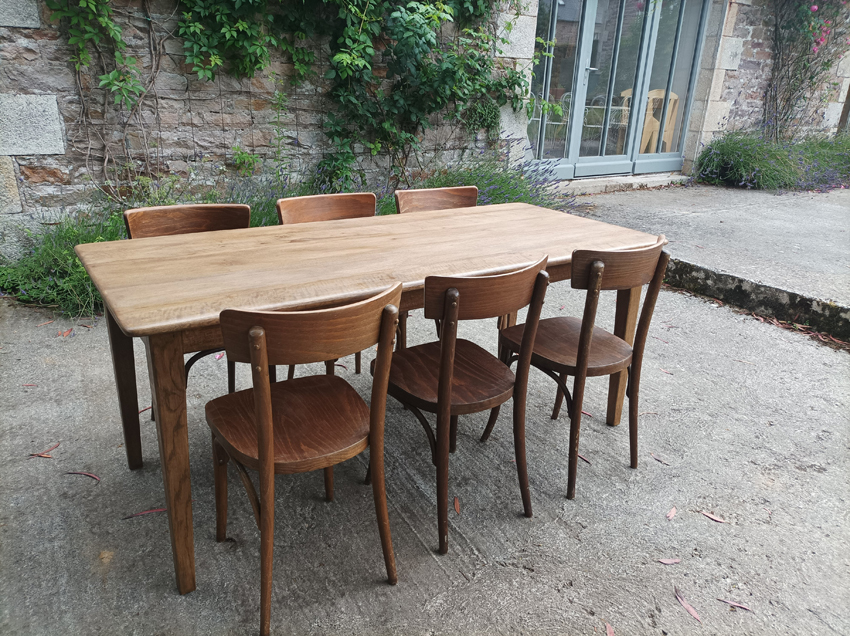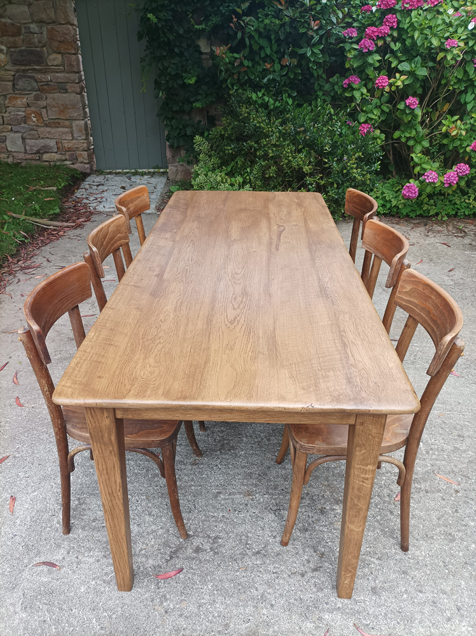 Tables de ferme en chêne de 180x80cm chacune. Pieds fuseaux. Teinte noyer réhaussée d’un ton chaud. Elles peuvent accueillir jusqu’à 16 convives.