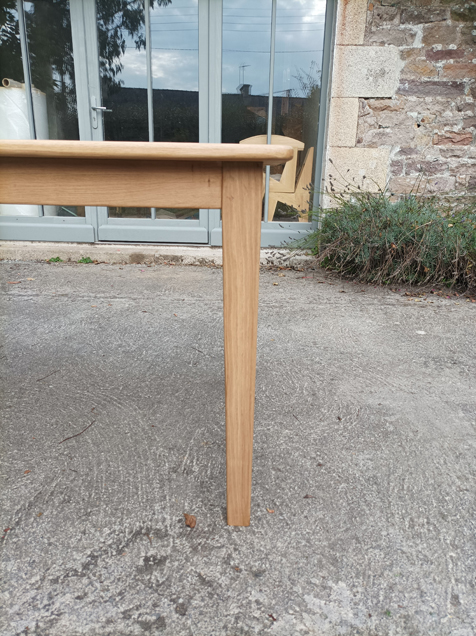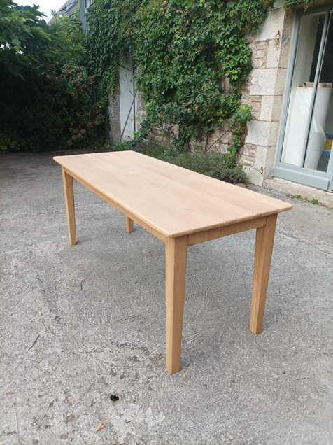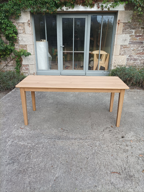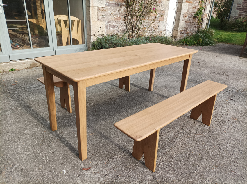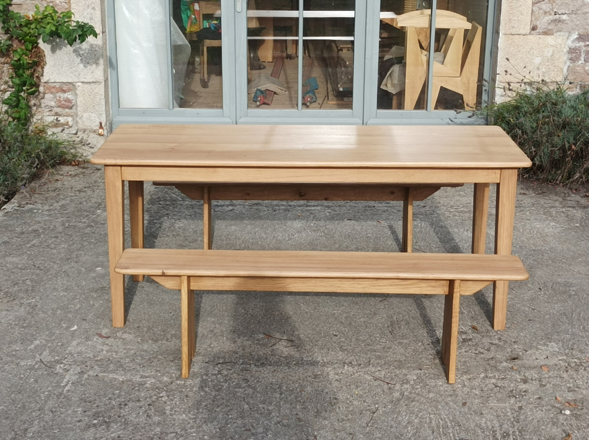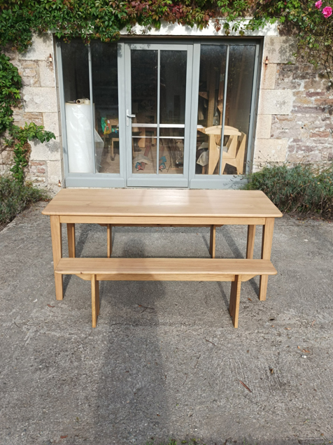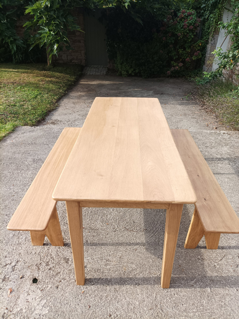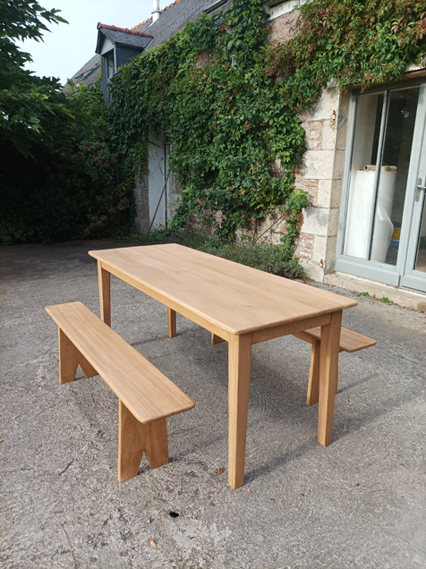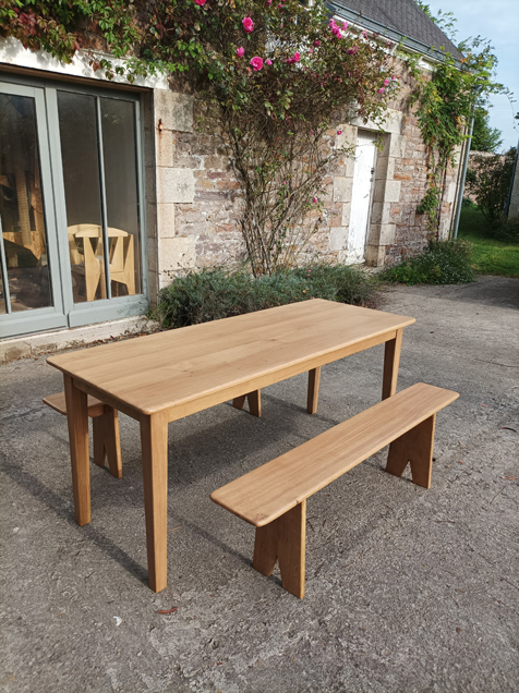 Table de ferme en chêne 180x70cm, pieds fuseaux. Elle peut accueillir 6 à 8 convives. Elle est accompagnées de deux bancs de ferme assortis. Teinte ton moyen.