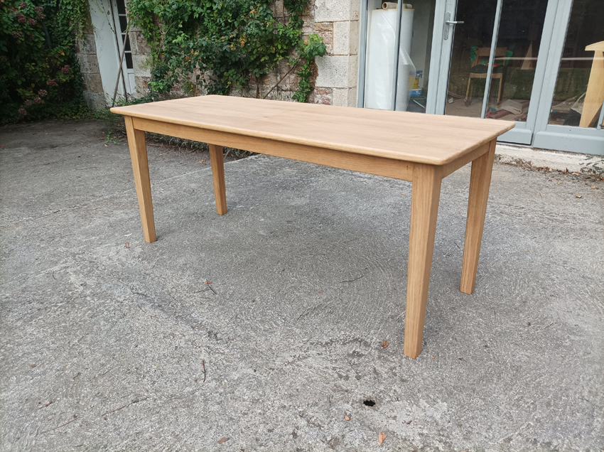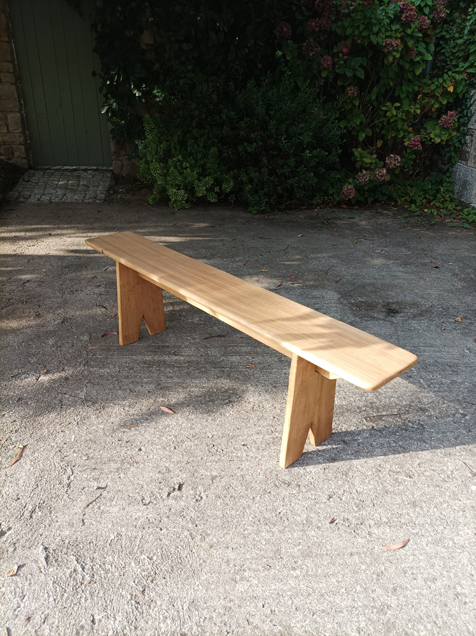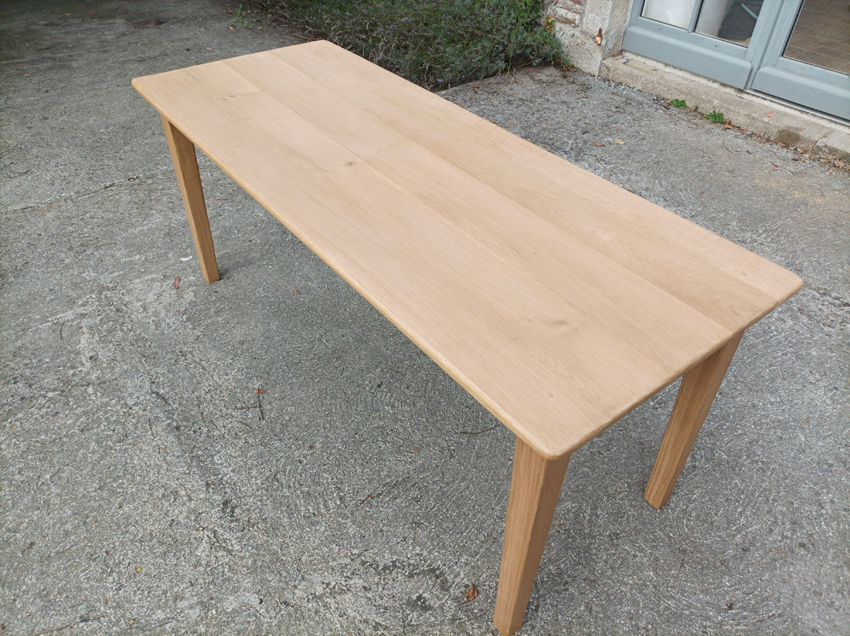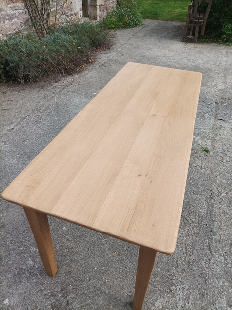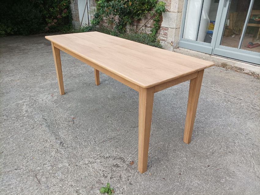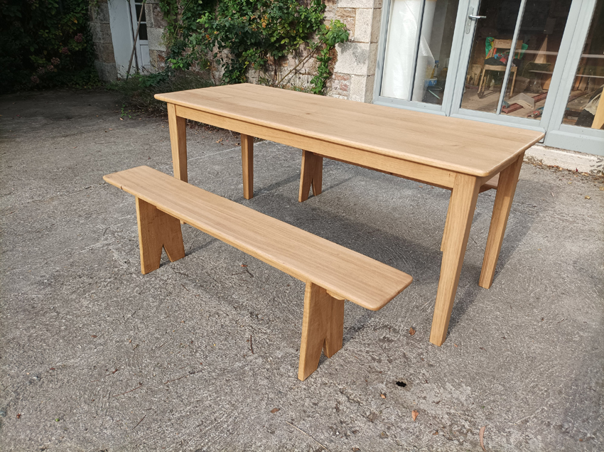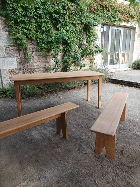 Table de ferme en chêne 180x70cm, pieds fuseaux. Elle peut accueillir 6 à 8 convives. Elle est accompagnées de deux bancs de ferme assortis. Teinte ton moyen.