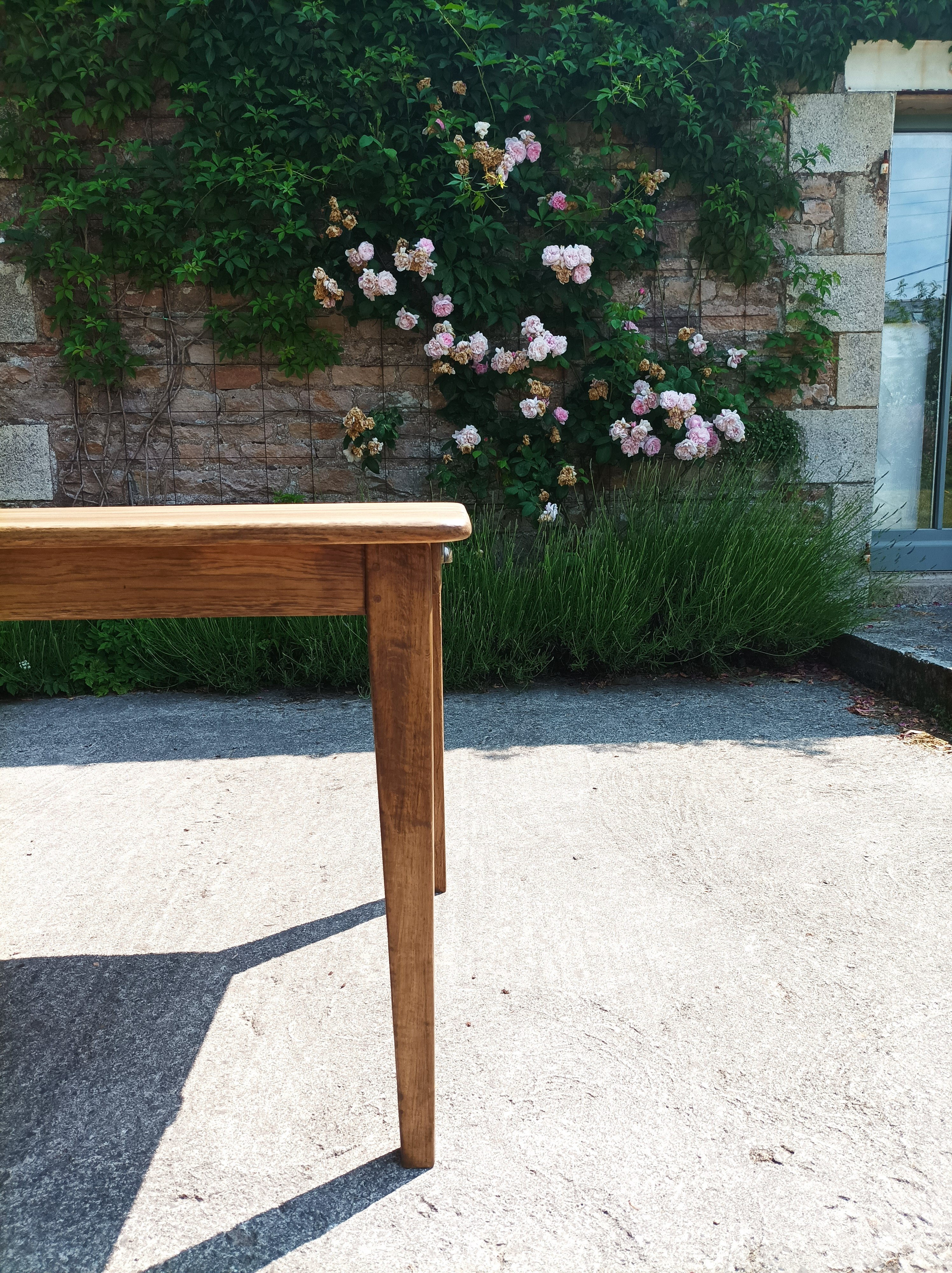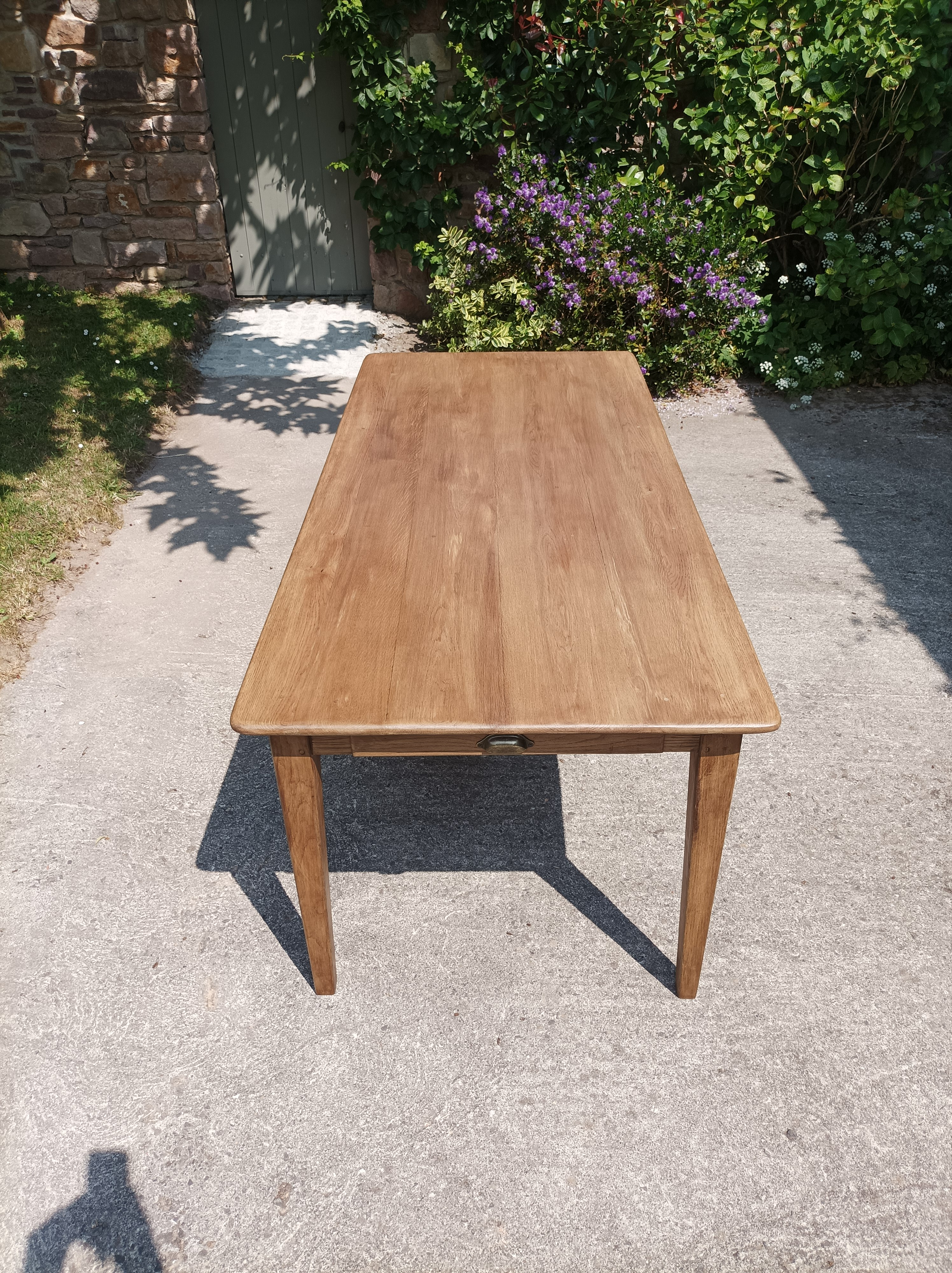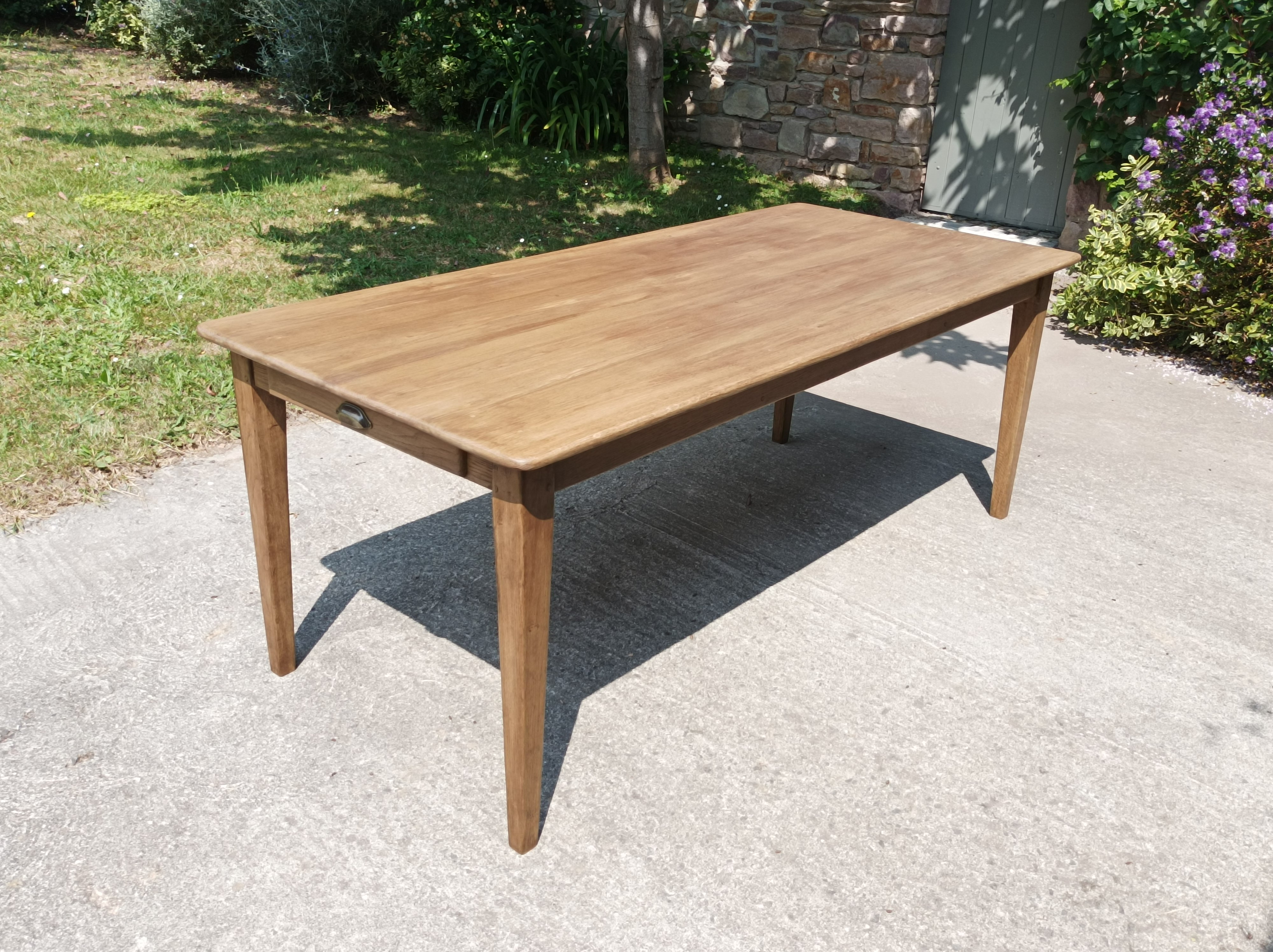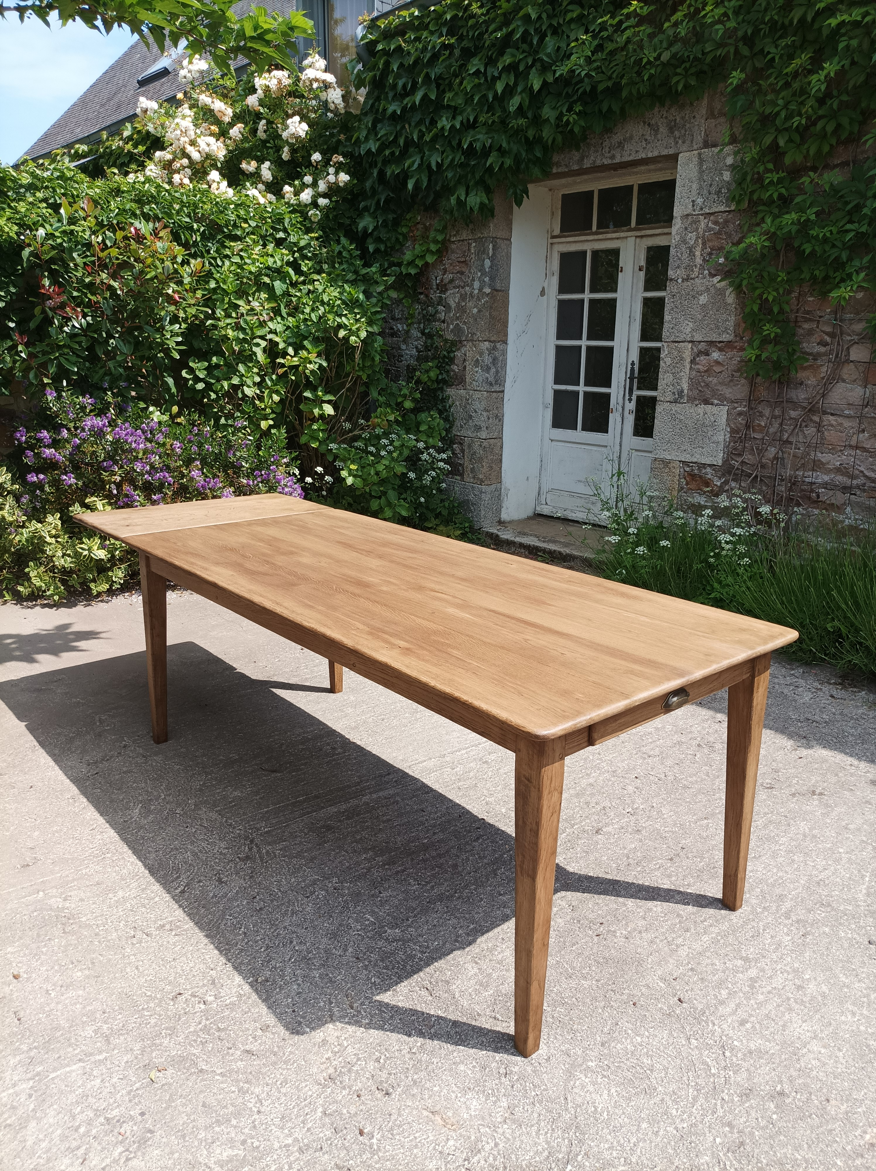 Table de ferme en chêne de 200x90cm, pieds fuseaux. Elle est dotée d’un tiroir poignée coquille style ancien, et d’une rallonge de 50cm.