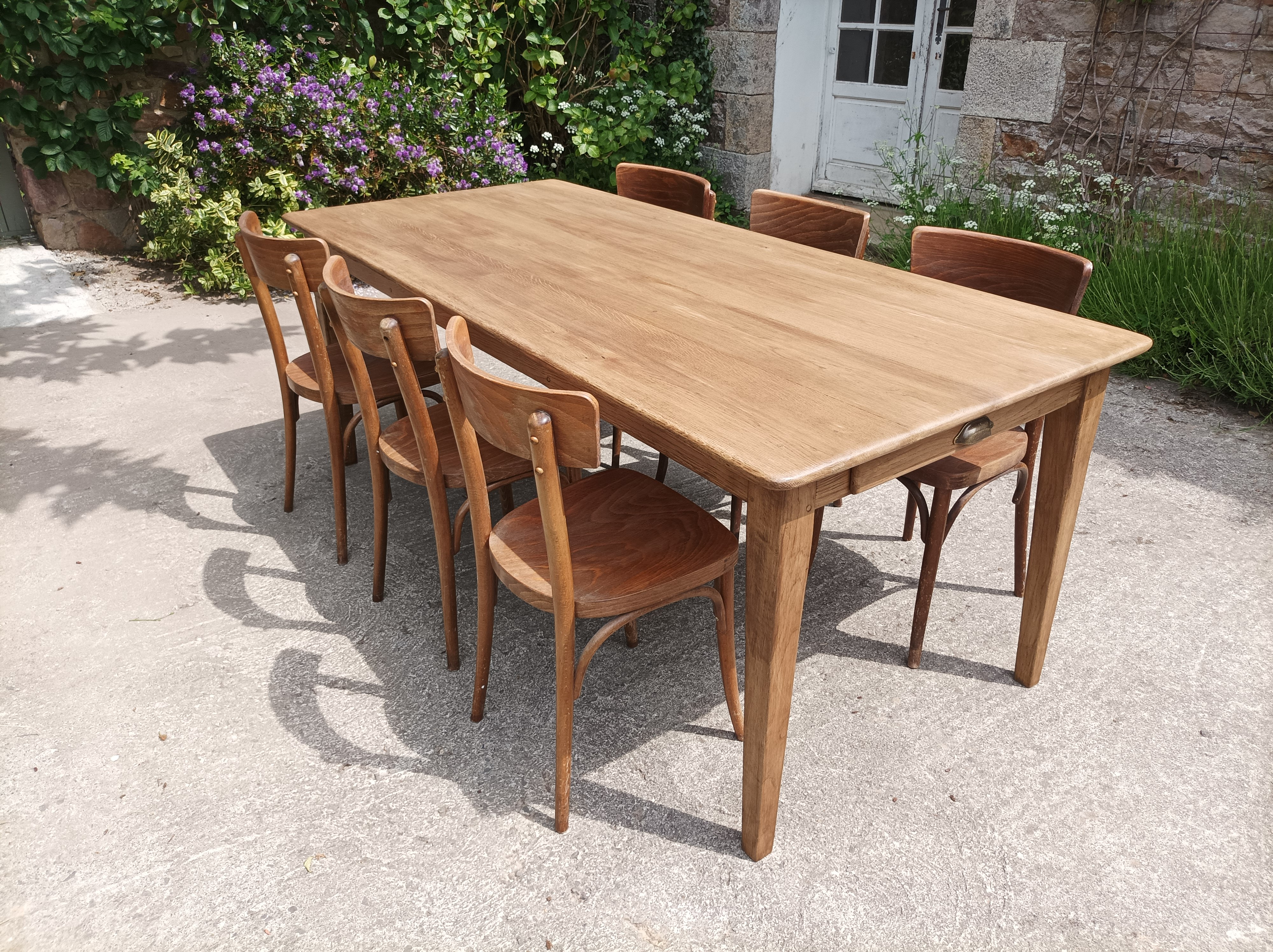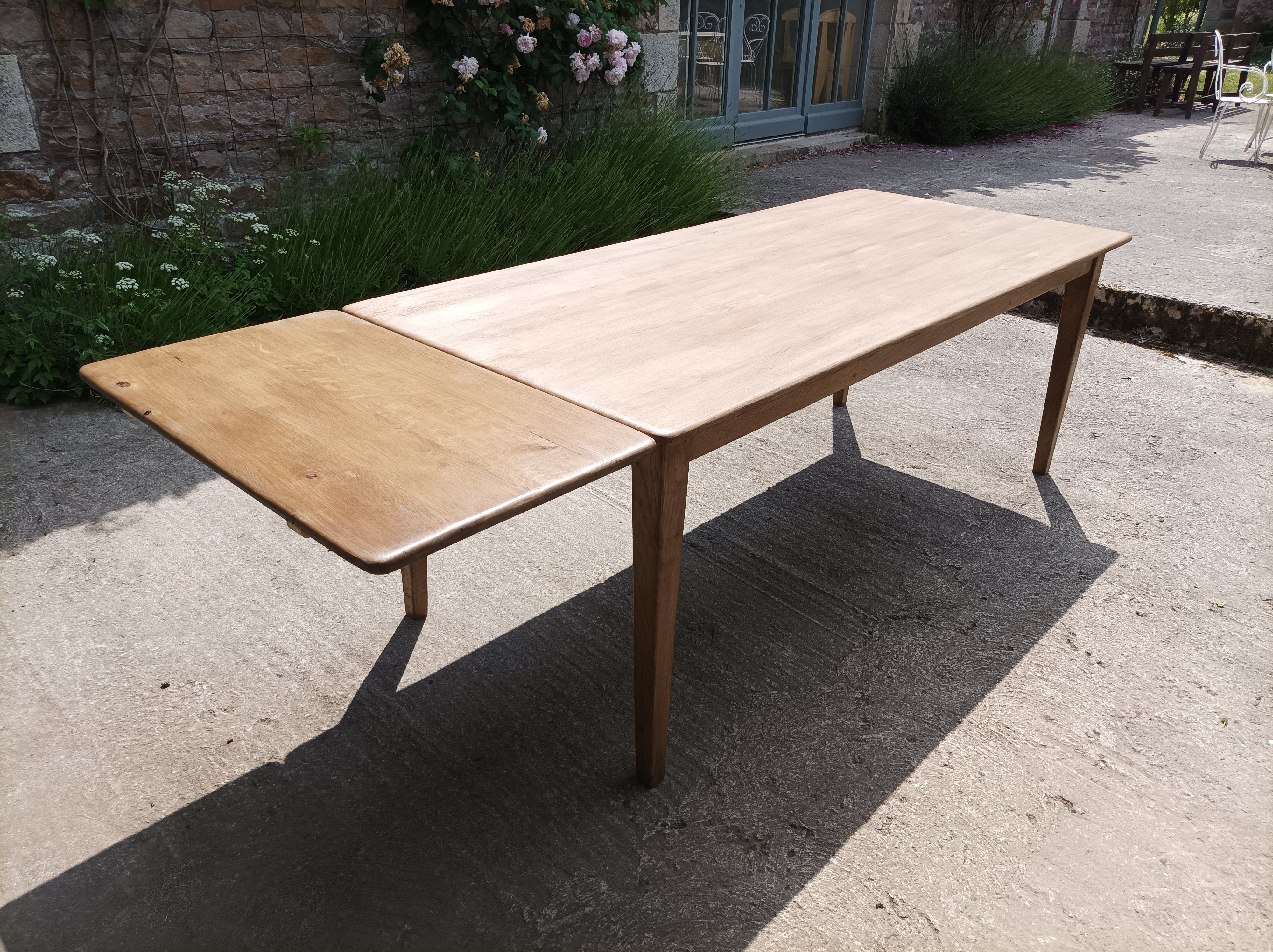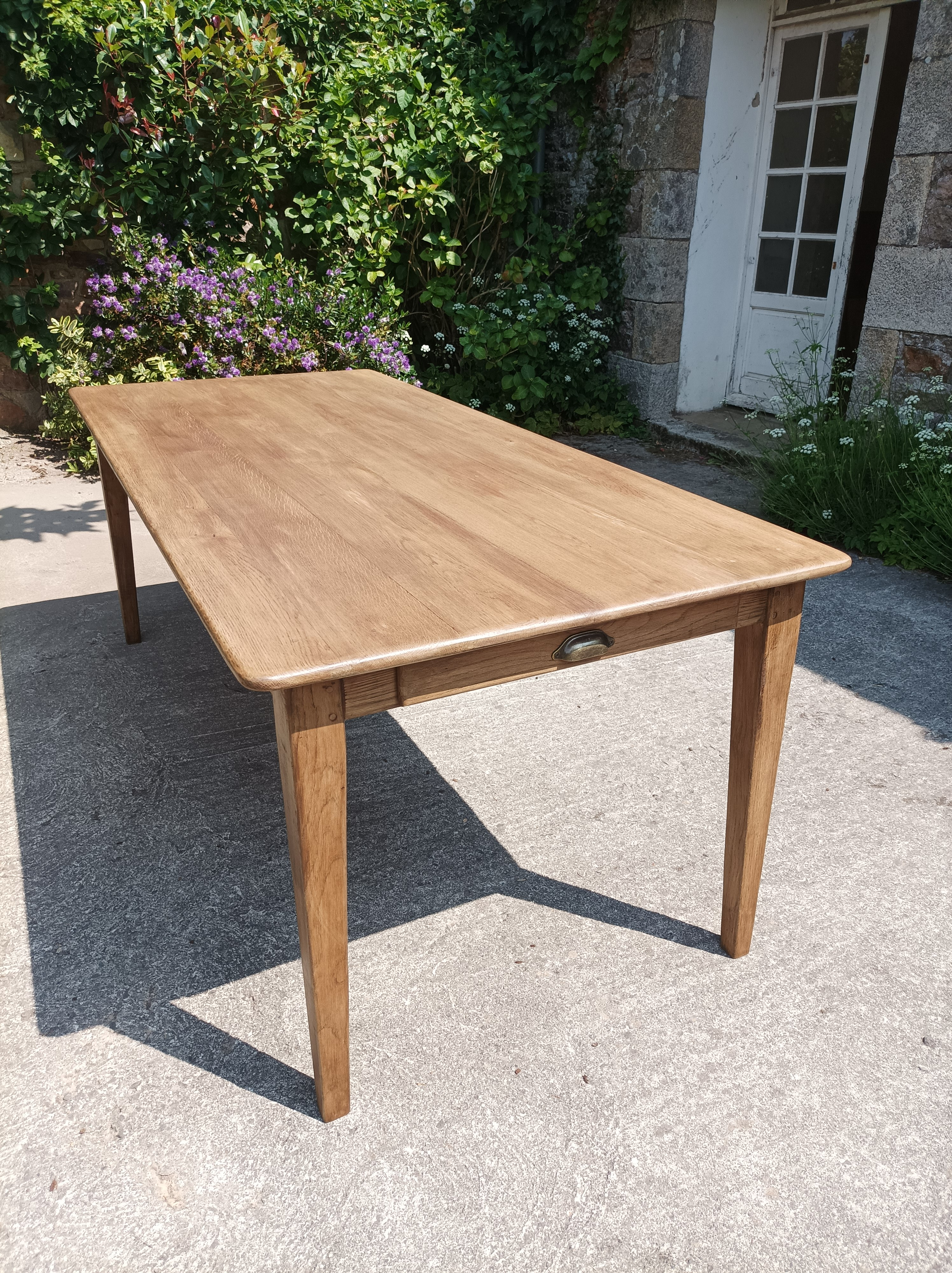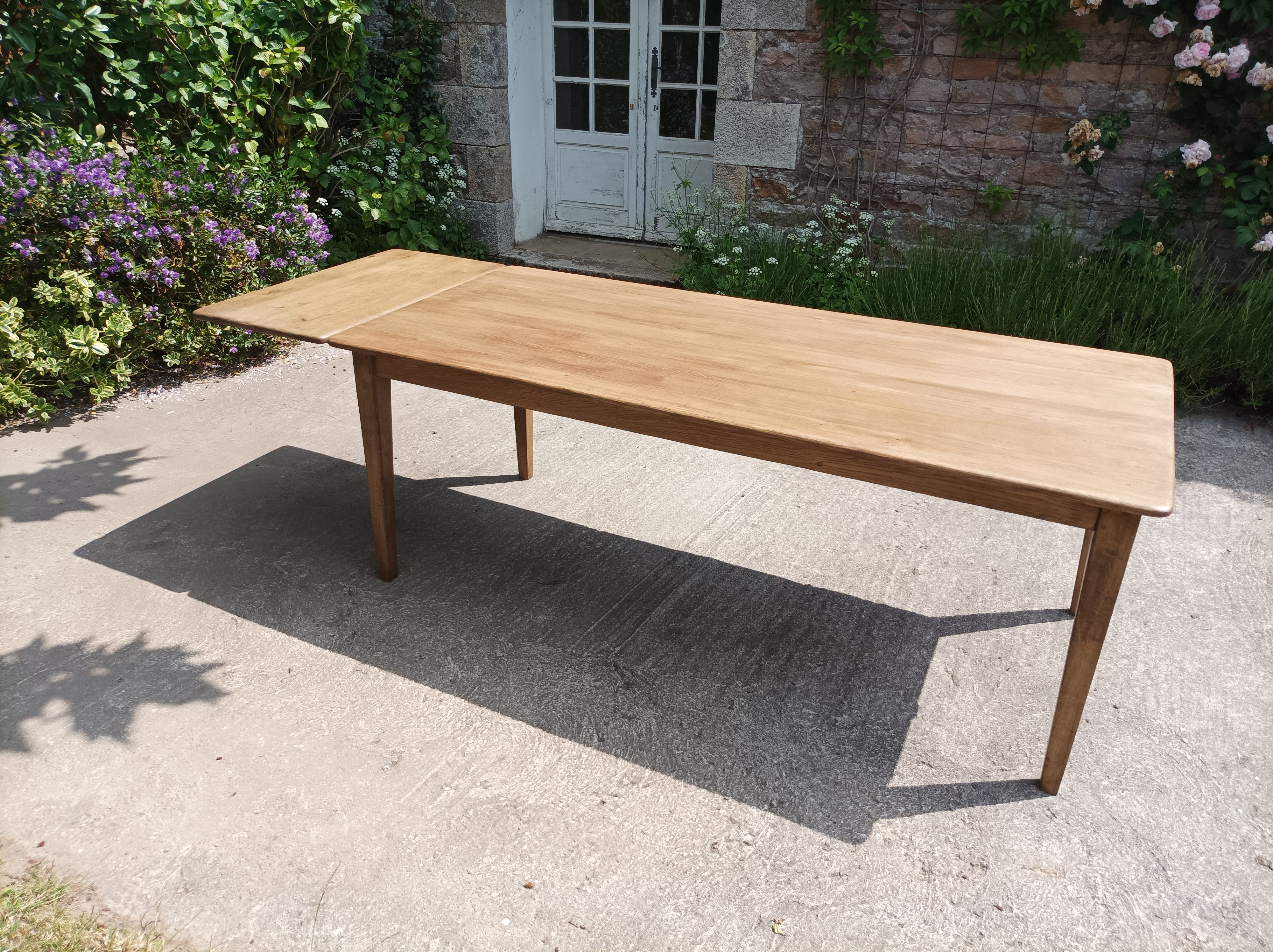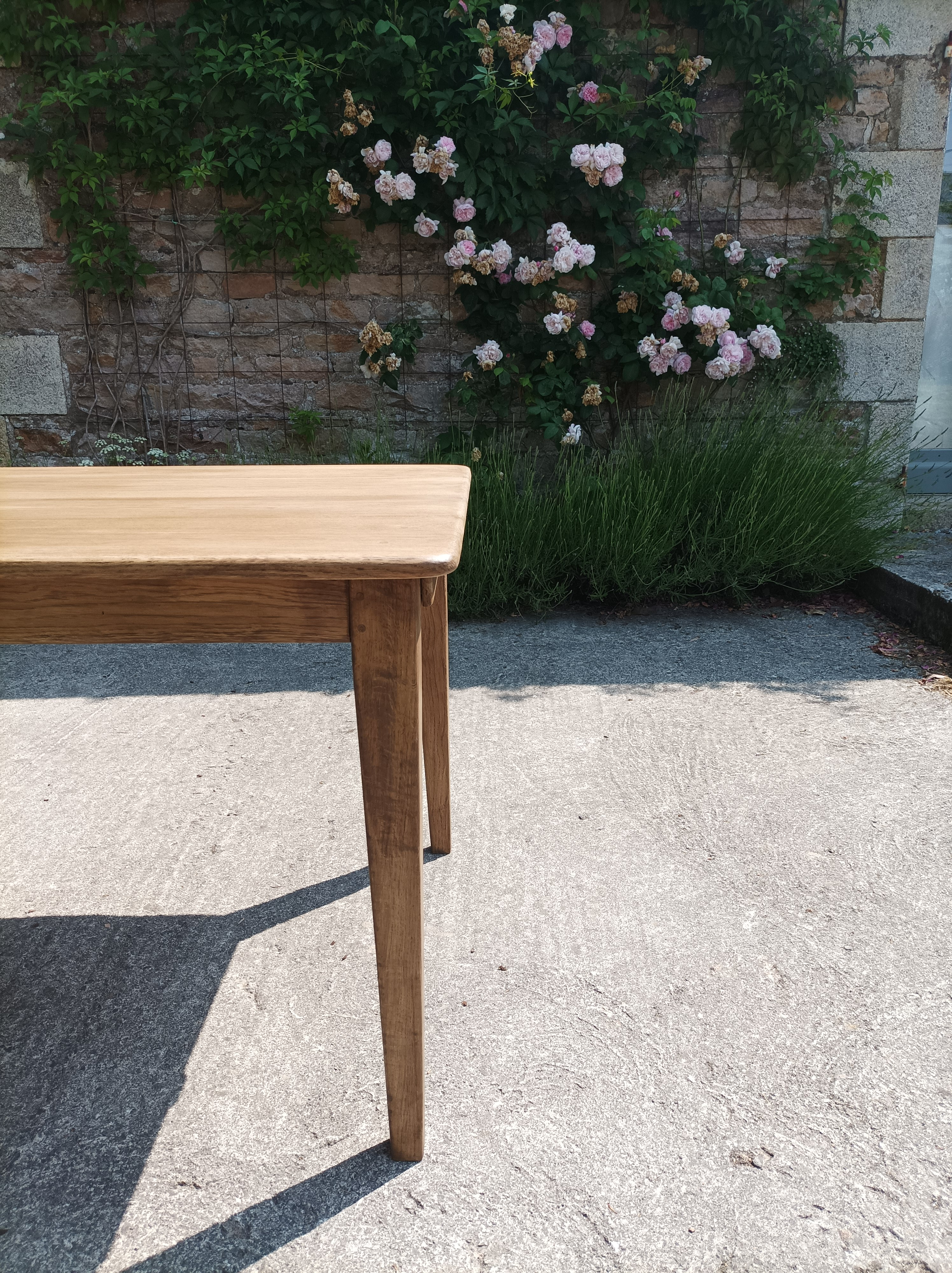 Table de ferme en chêne de 200x90cm, pieds fuseaux. Elle est dotée d’un tiroir poignée coquille style ancien, et d’une rallonge de 50cm.