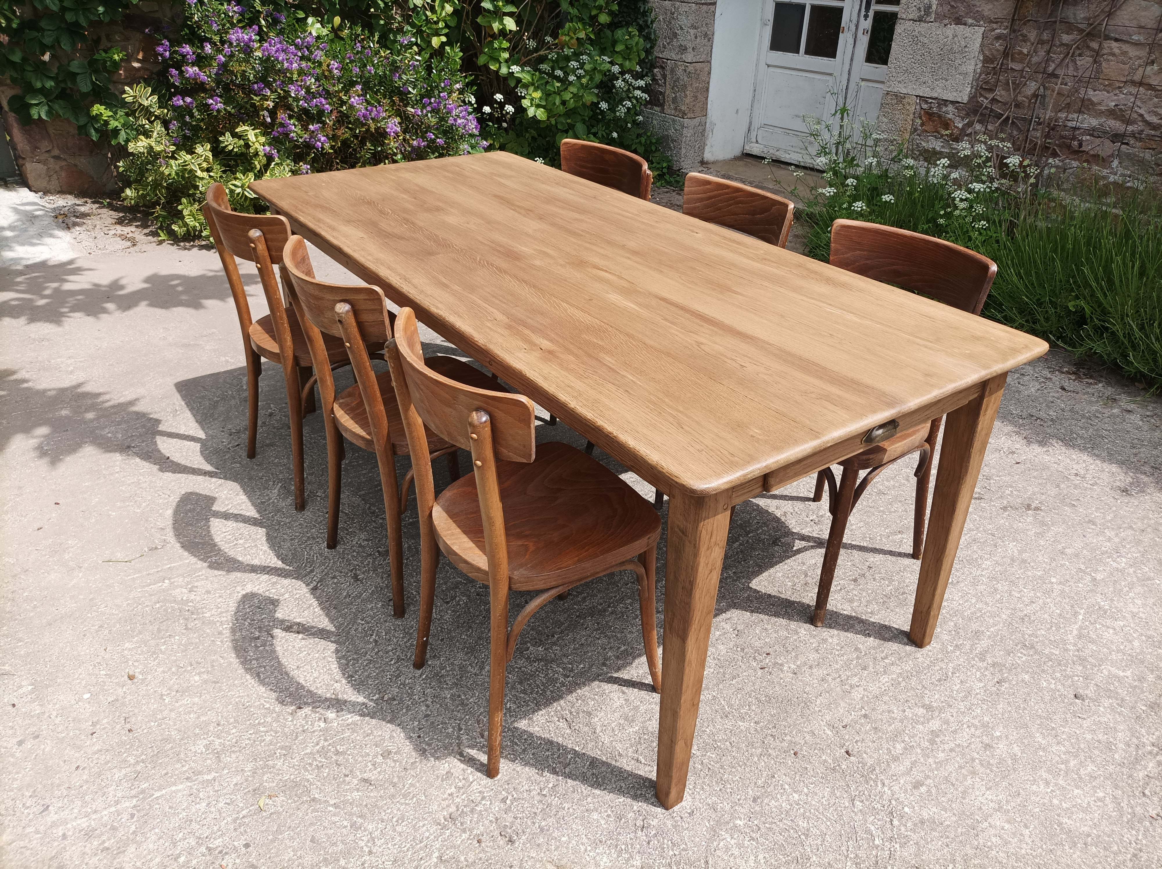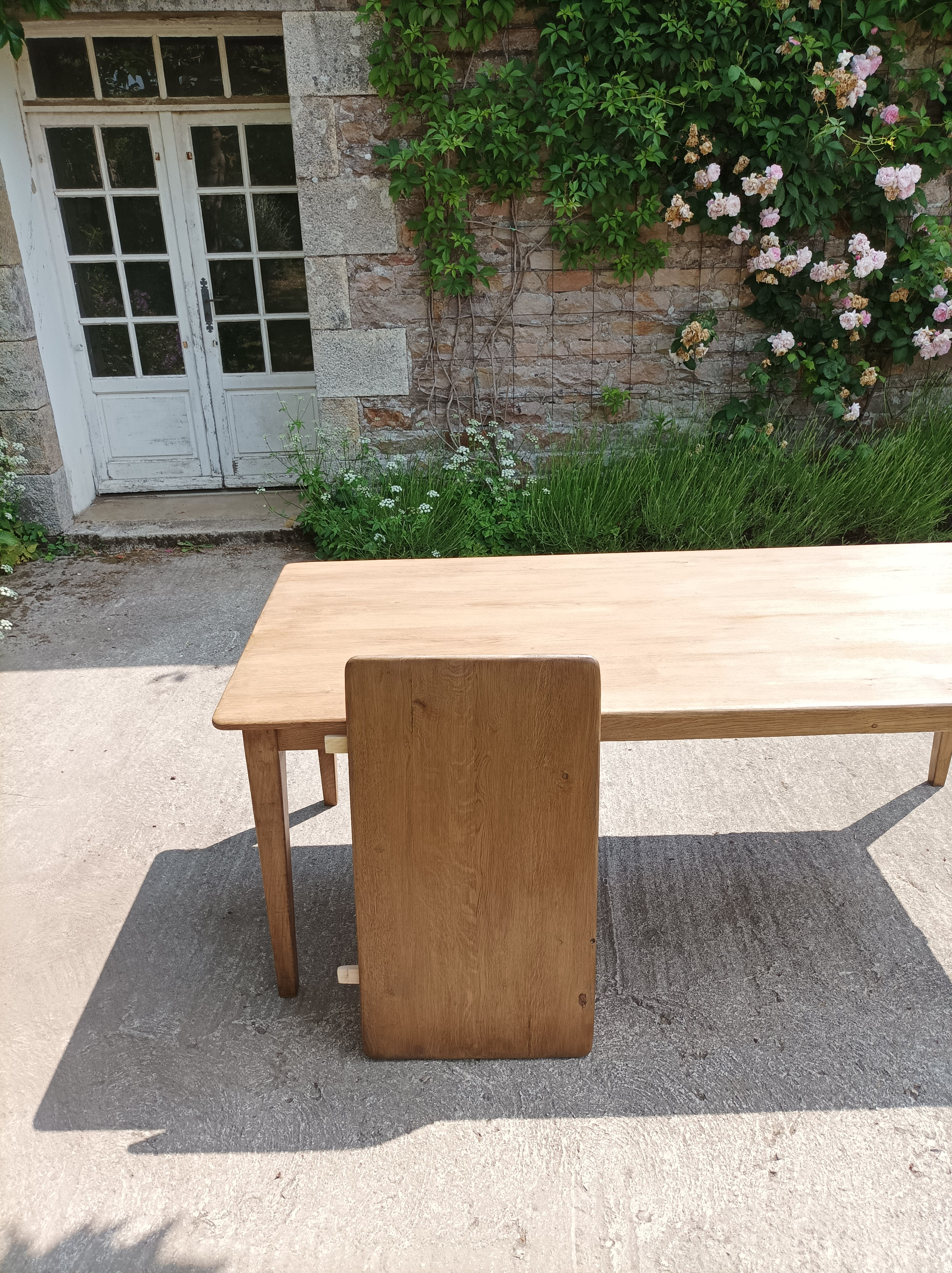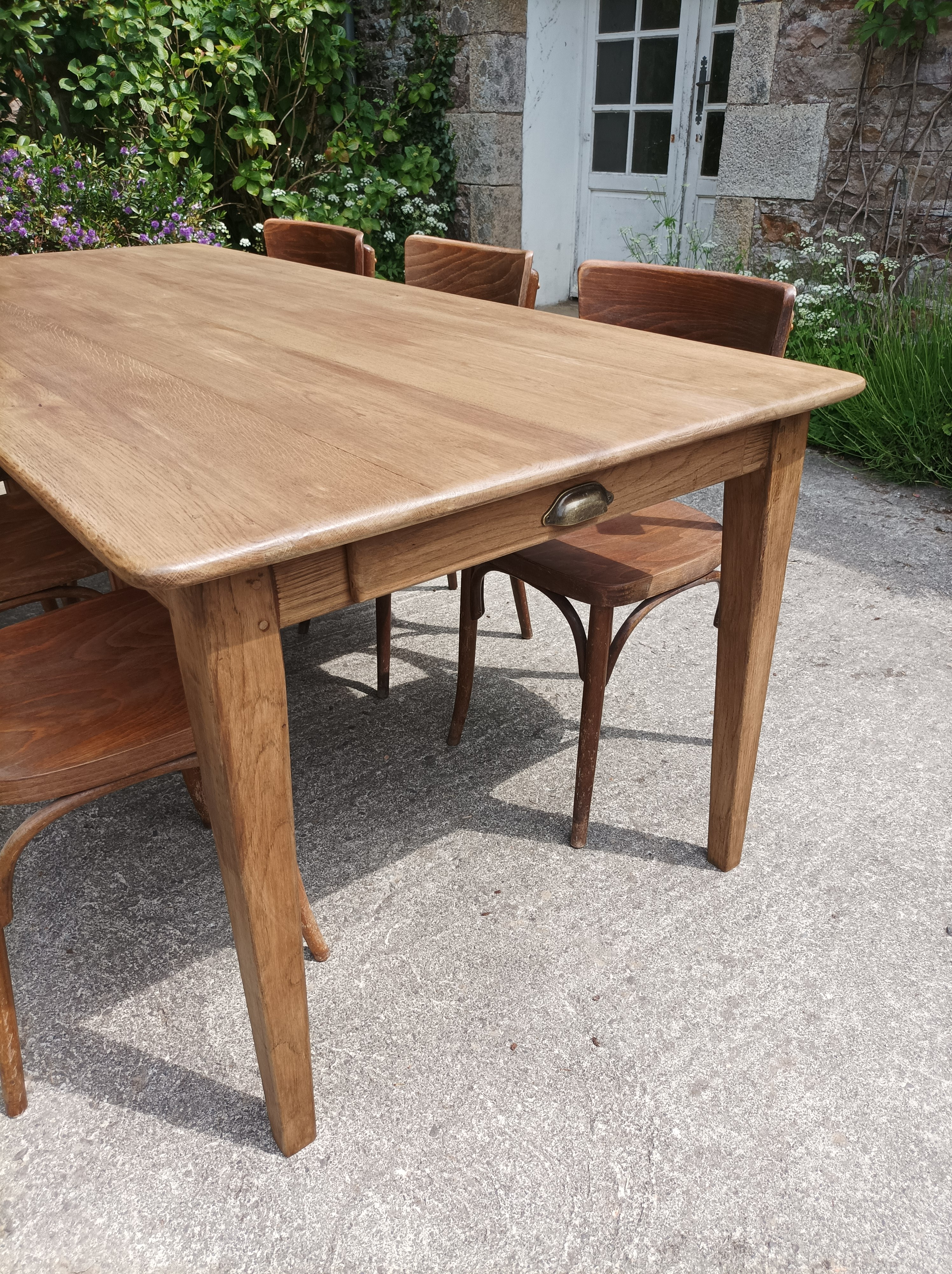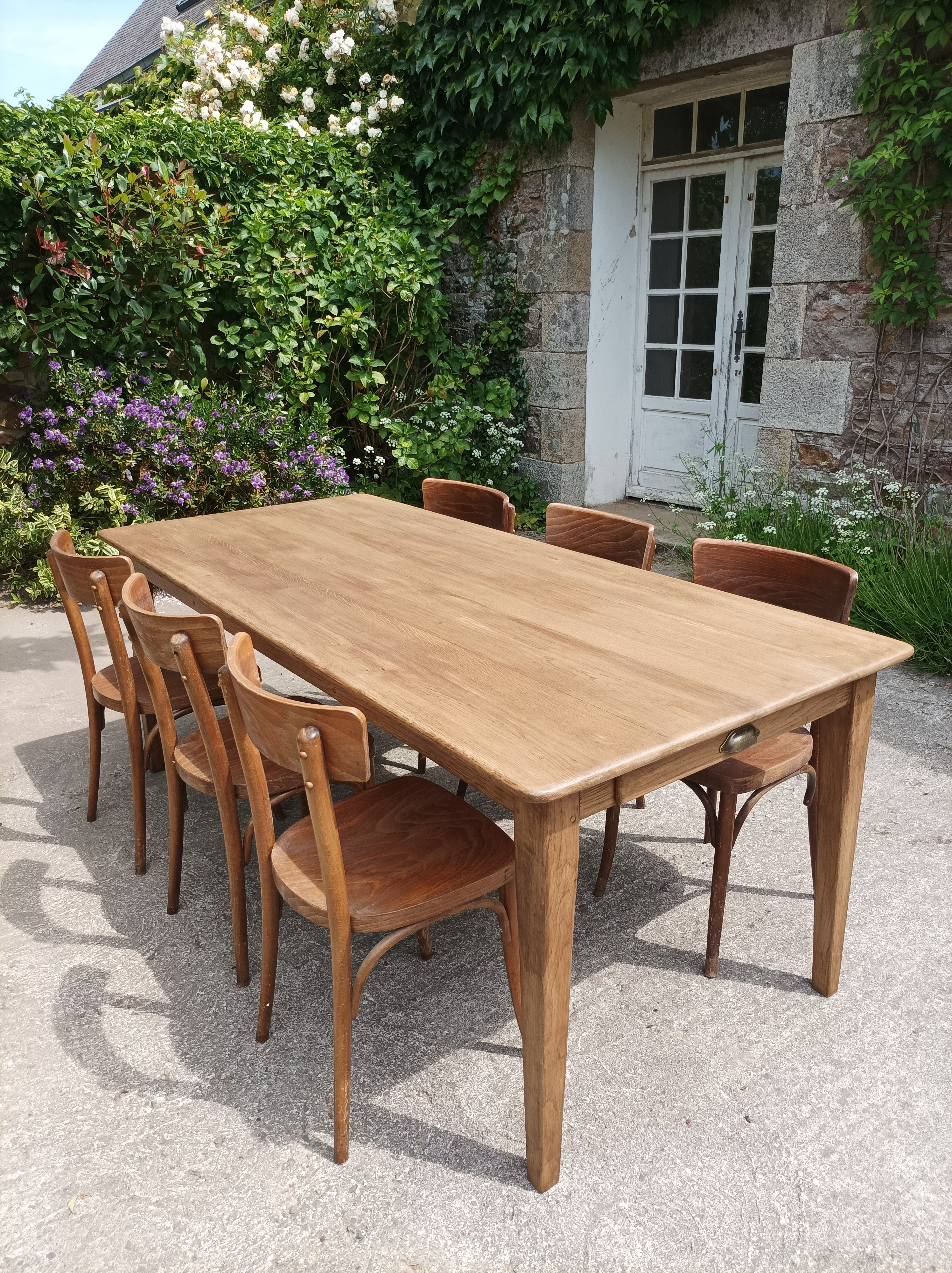 Table de ferme en chêne de 200x90cm, pieds fuseaux. Elle est dotée d’un tiroir poignée coquille style ancien, et d’une rallonge de 50cm.