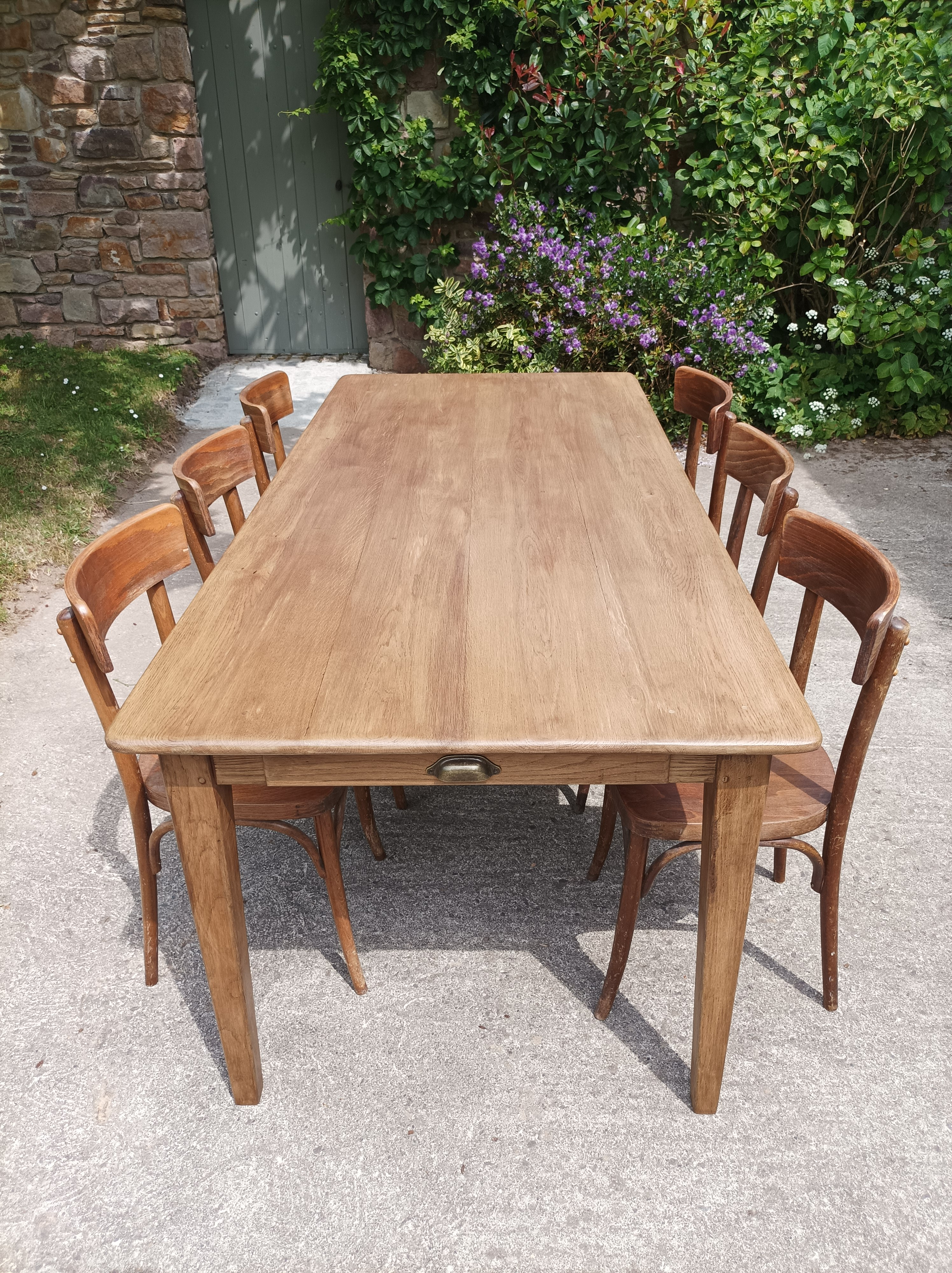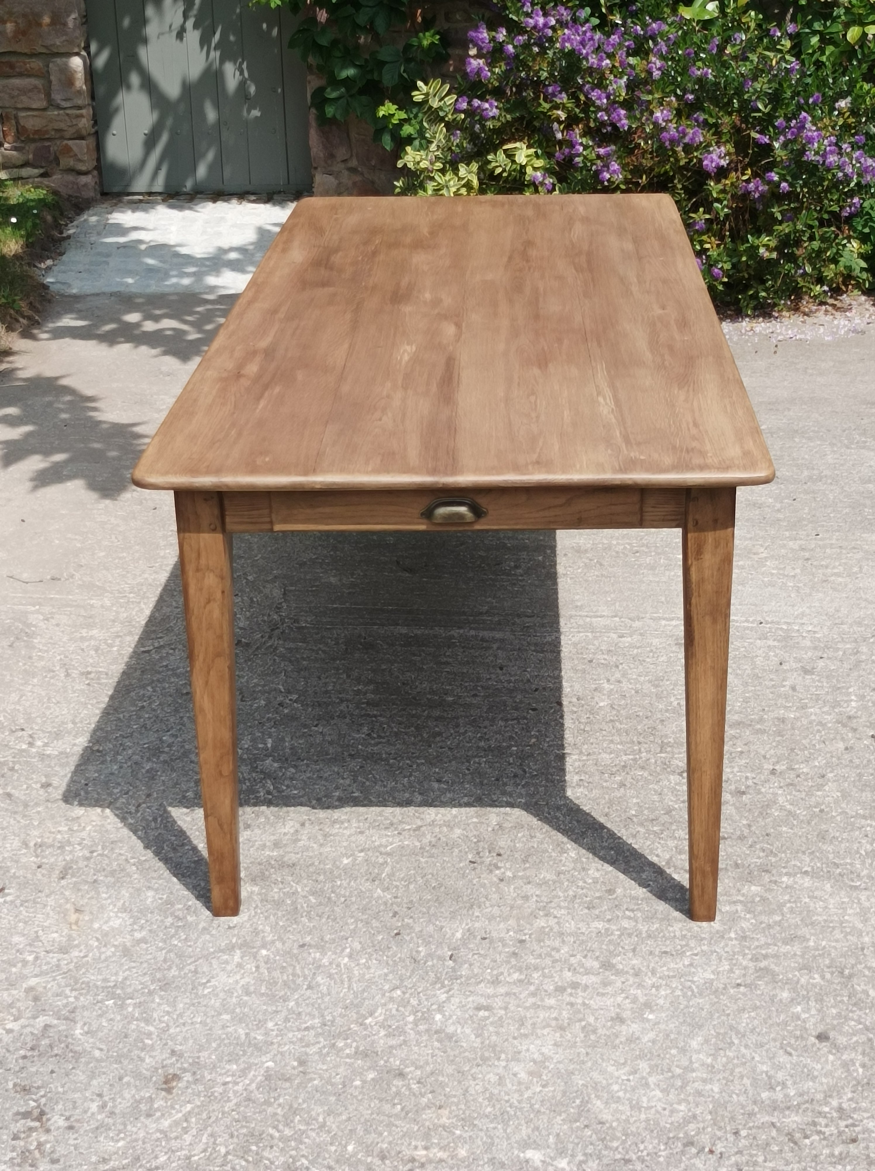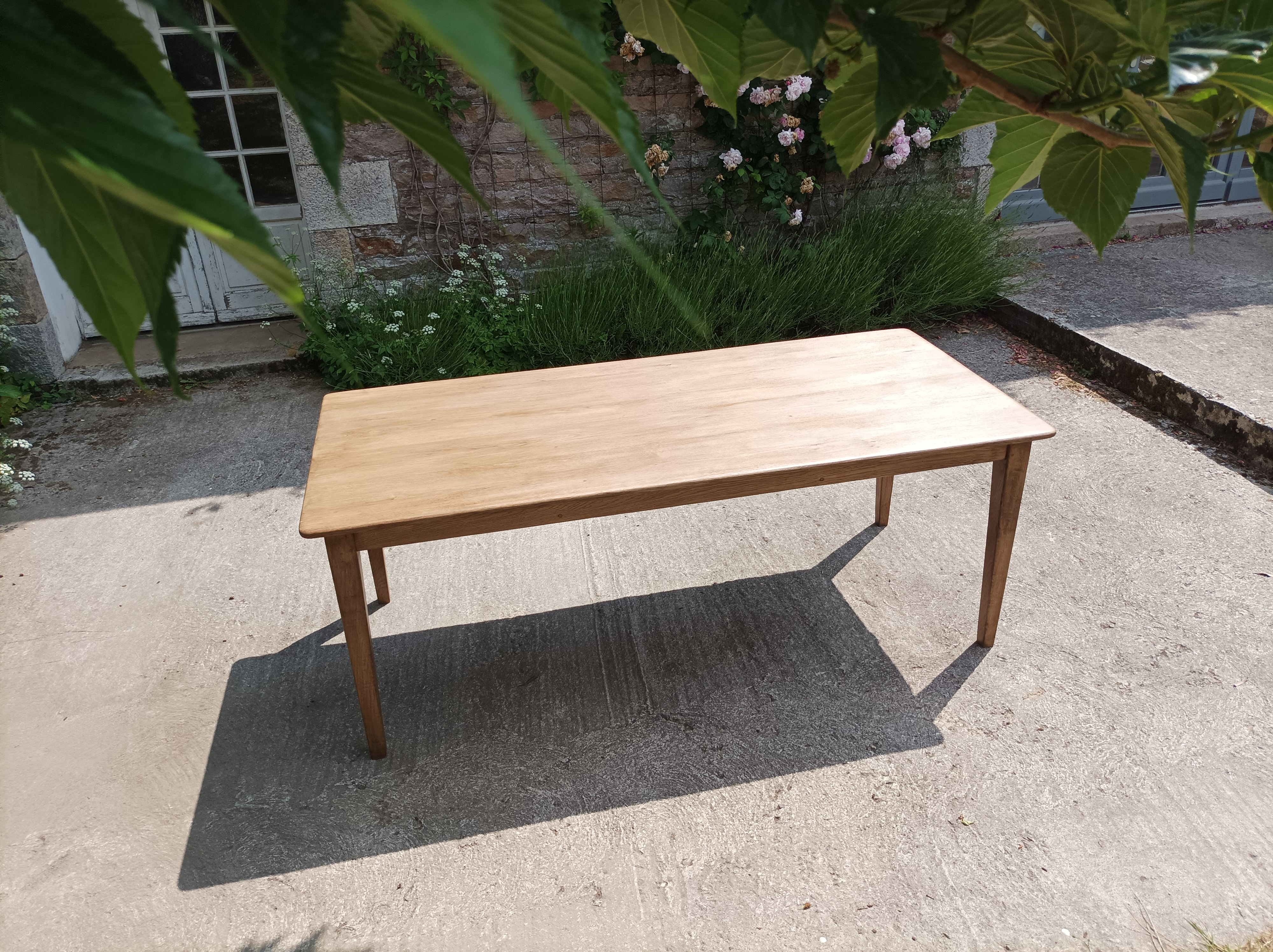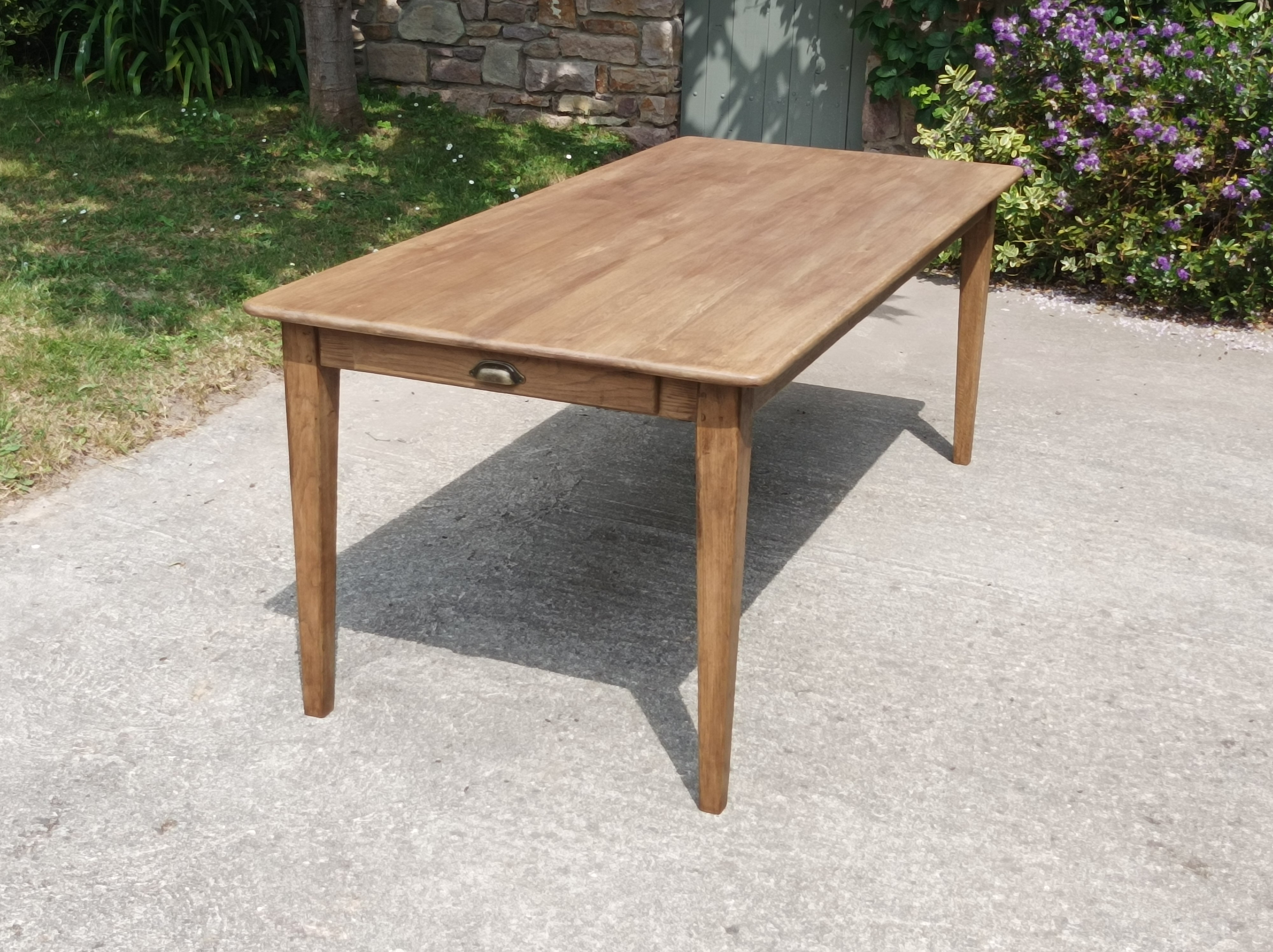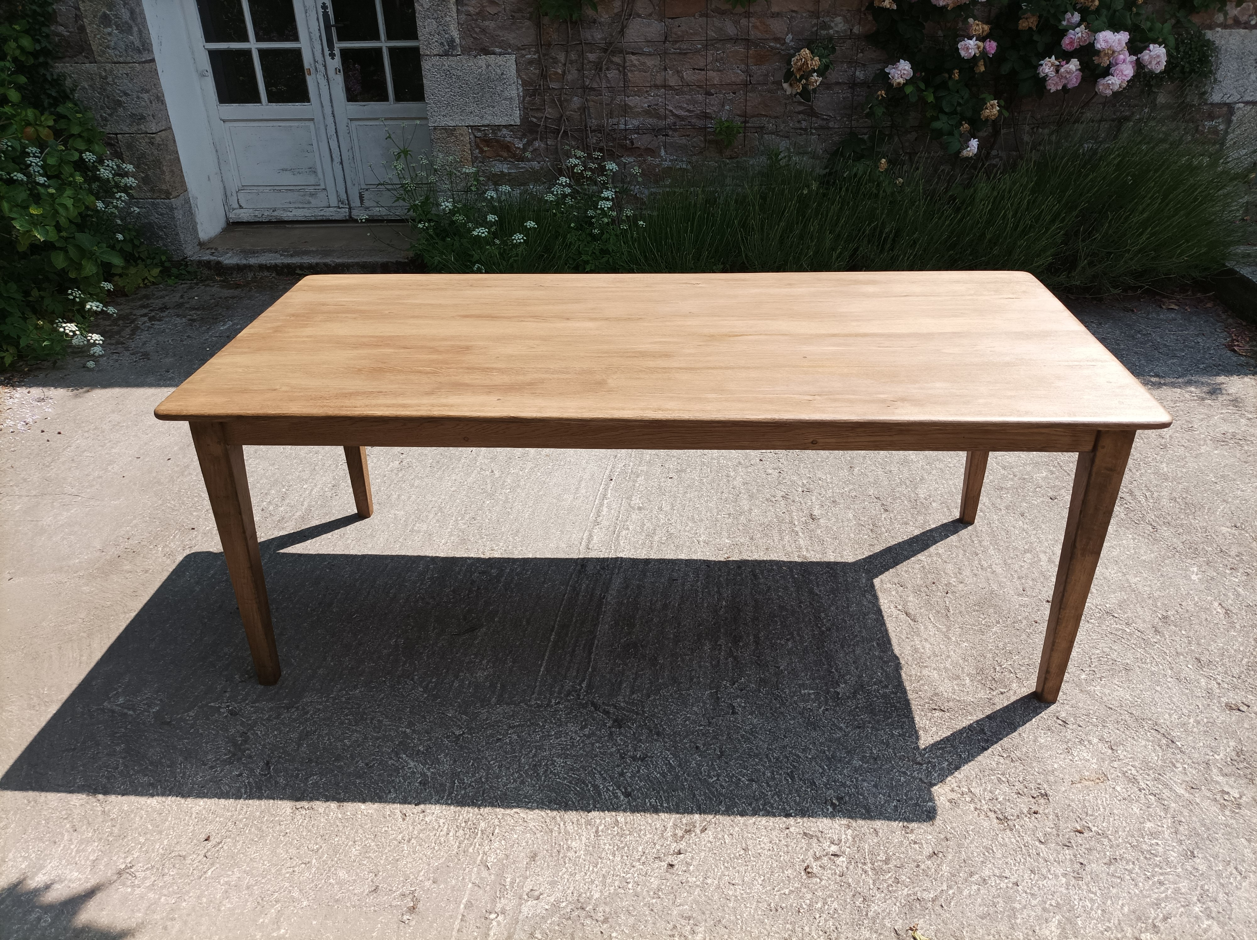 Table de ferme en chêne de 200x90cm, pieds fuseaux. Elle est dotée d’un tiroir poignée coquille style ancien, et d’une rallonge de 50cm.