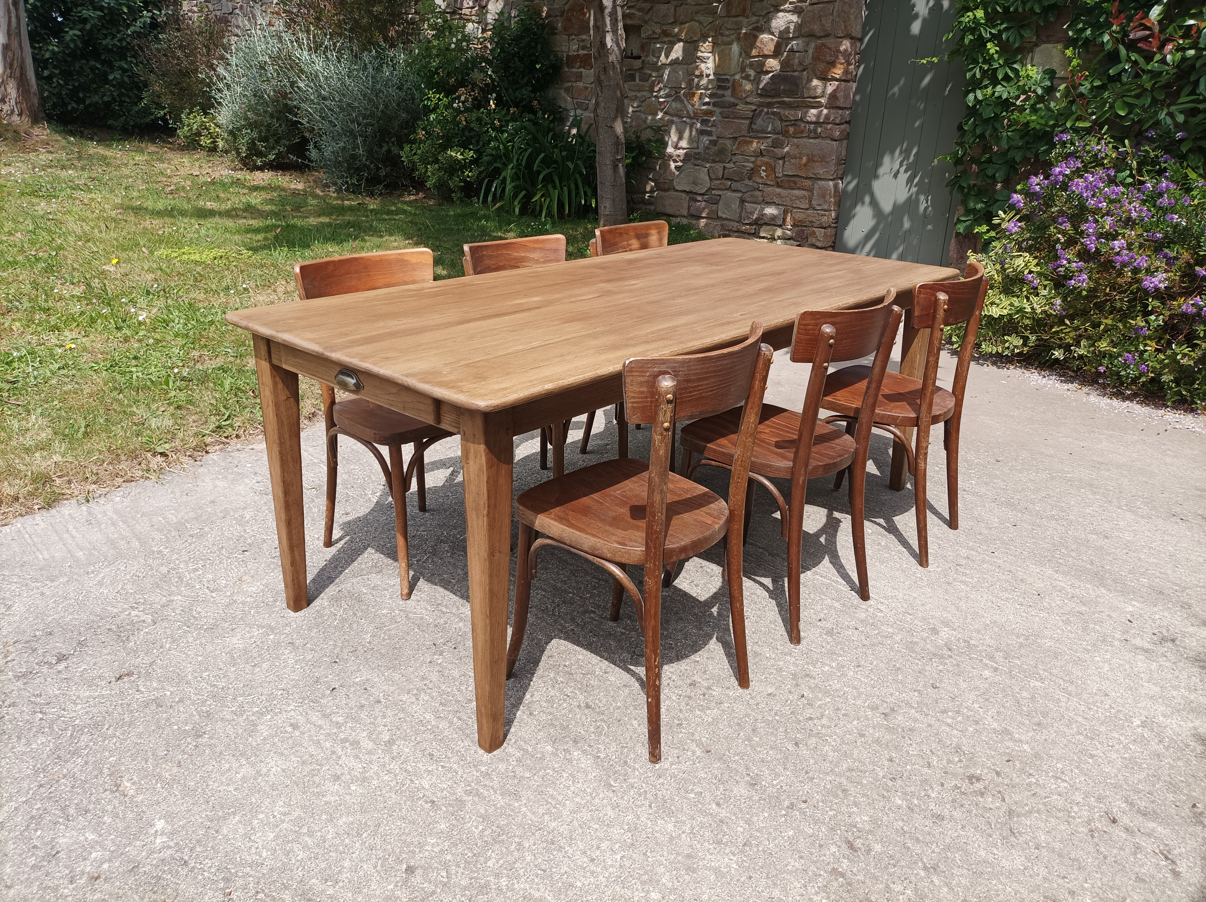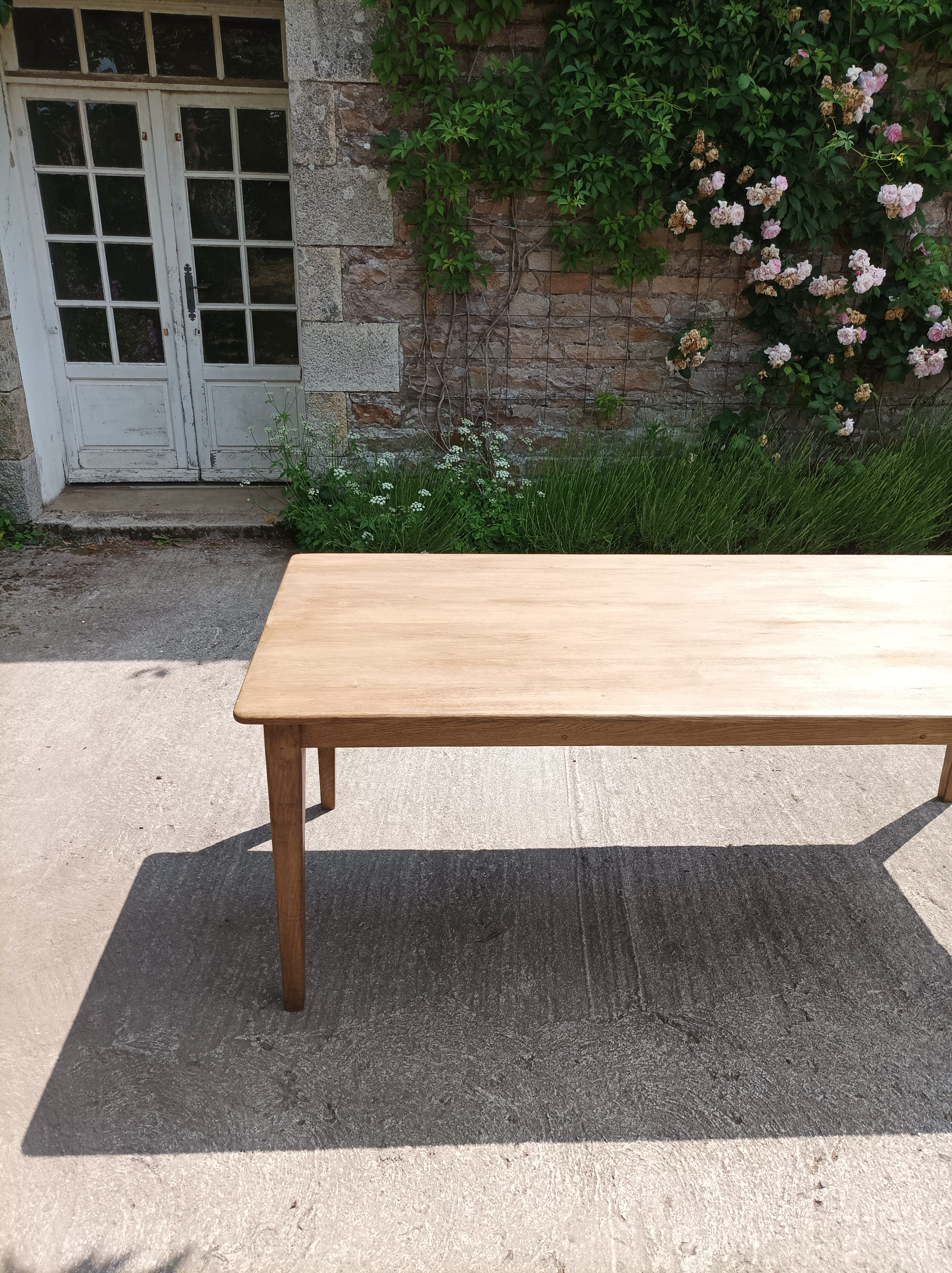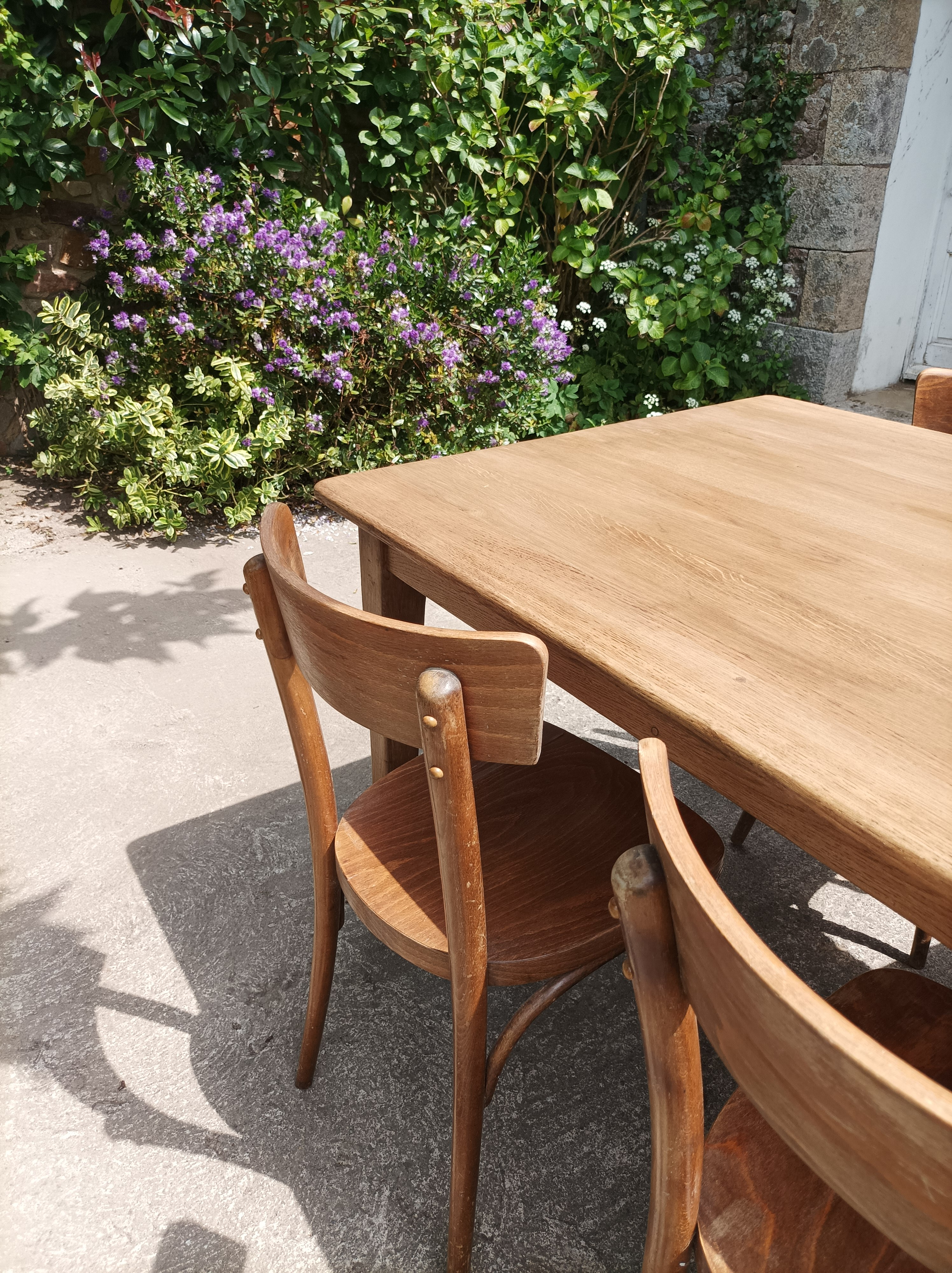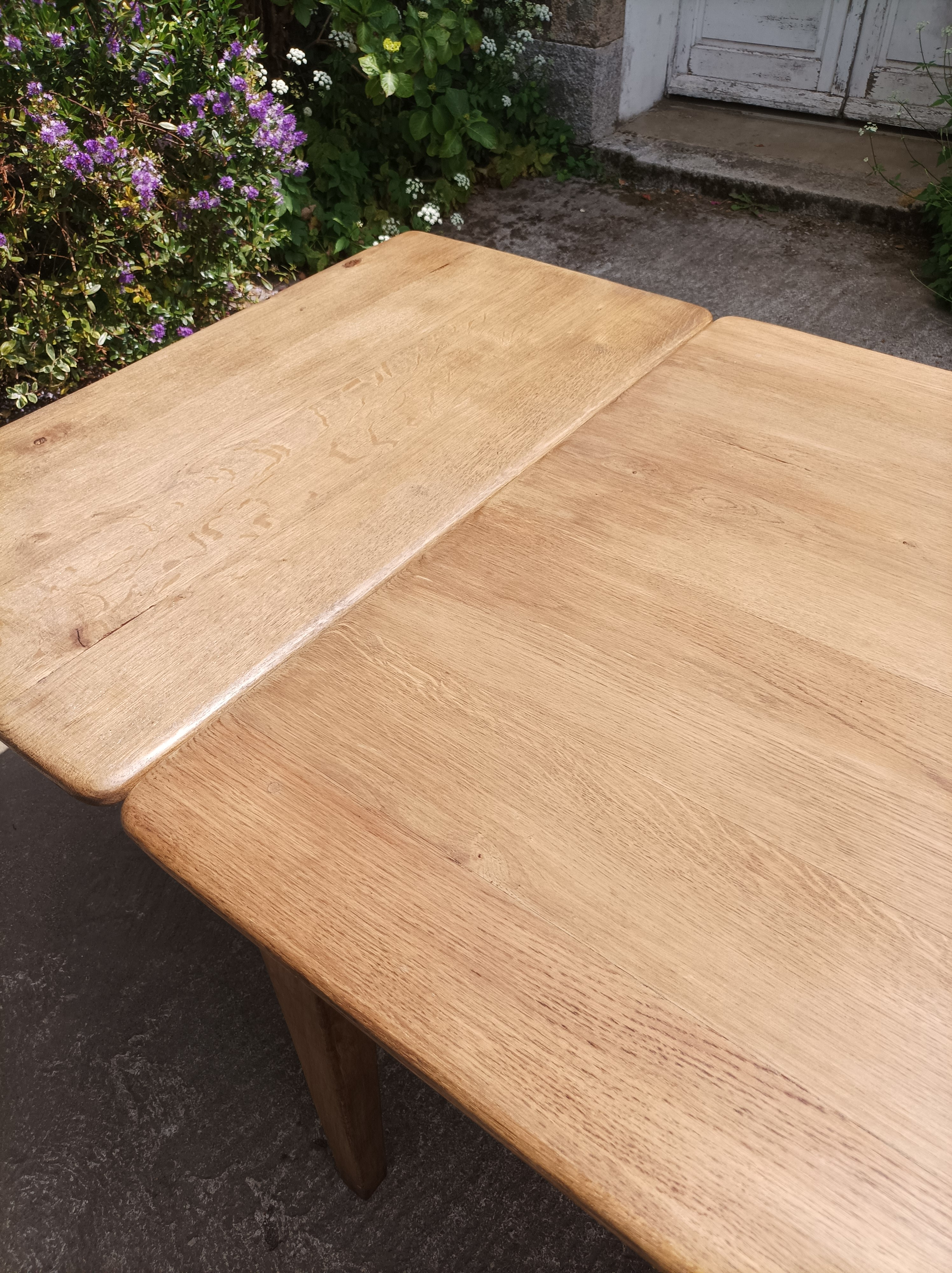 Table de ferme en chêne de 200x90cm, pieds fuseaux. Elle est dotée d’un tiroir poignée coquille style ancien, et d’une rallonge de 50cm.
