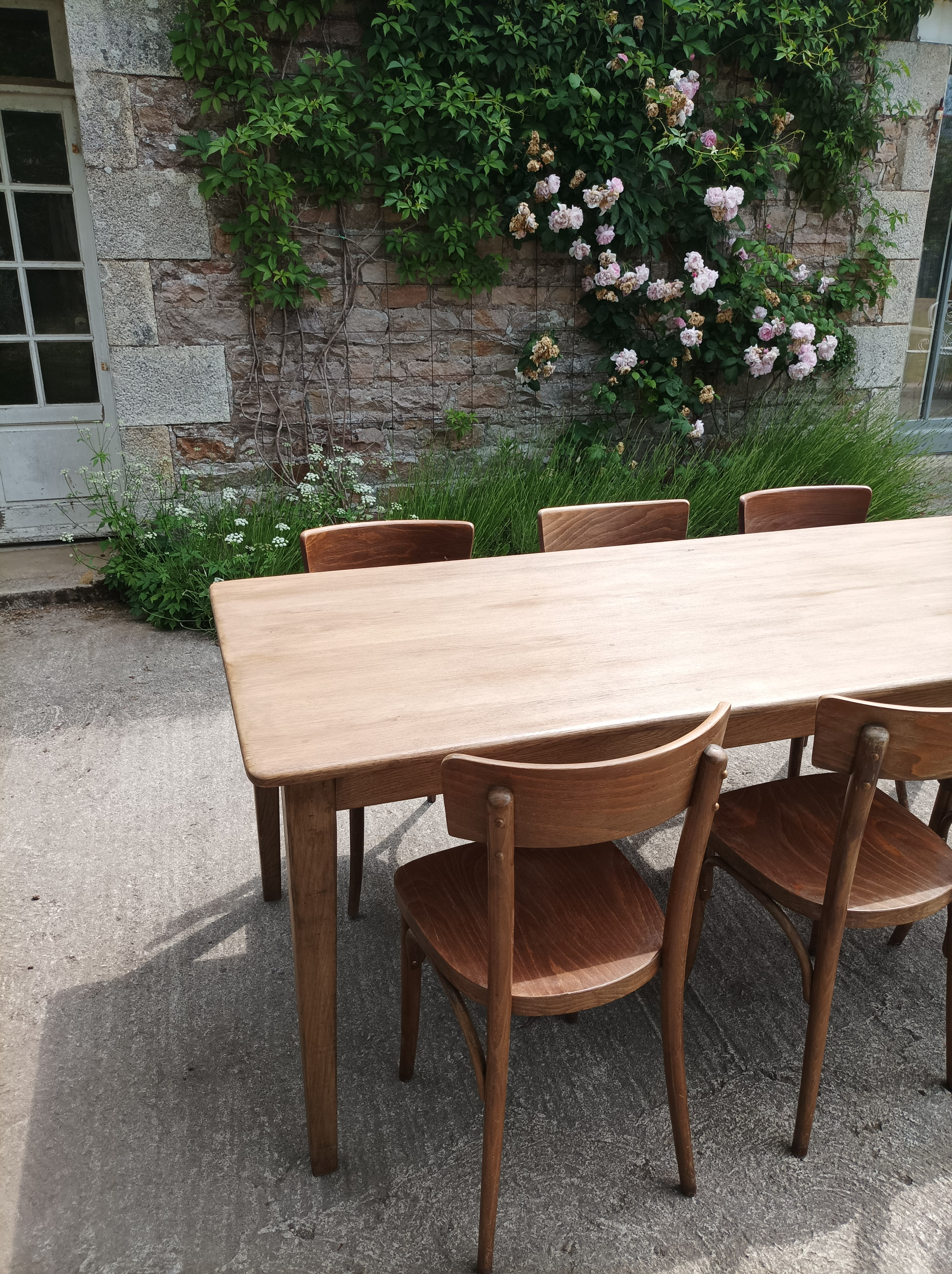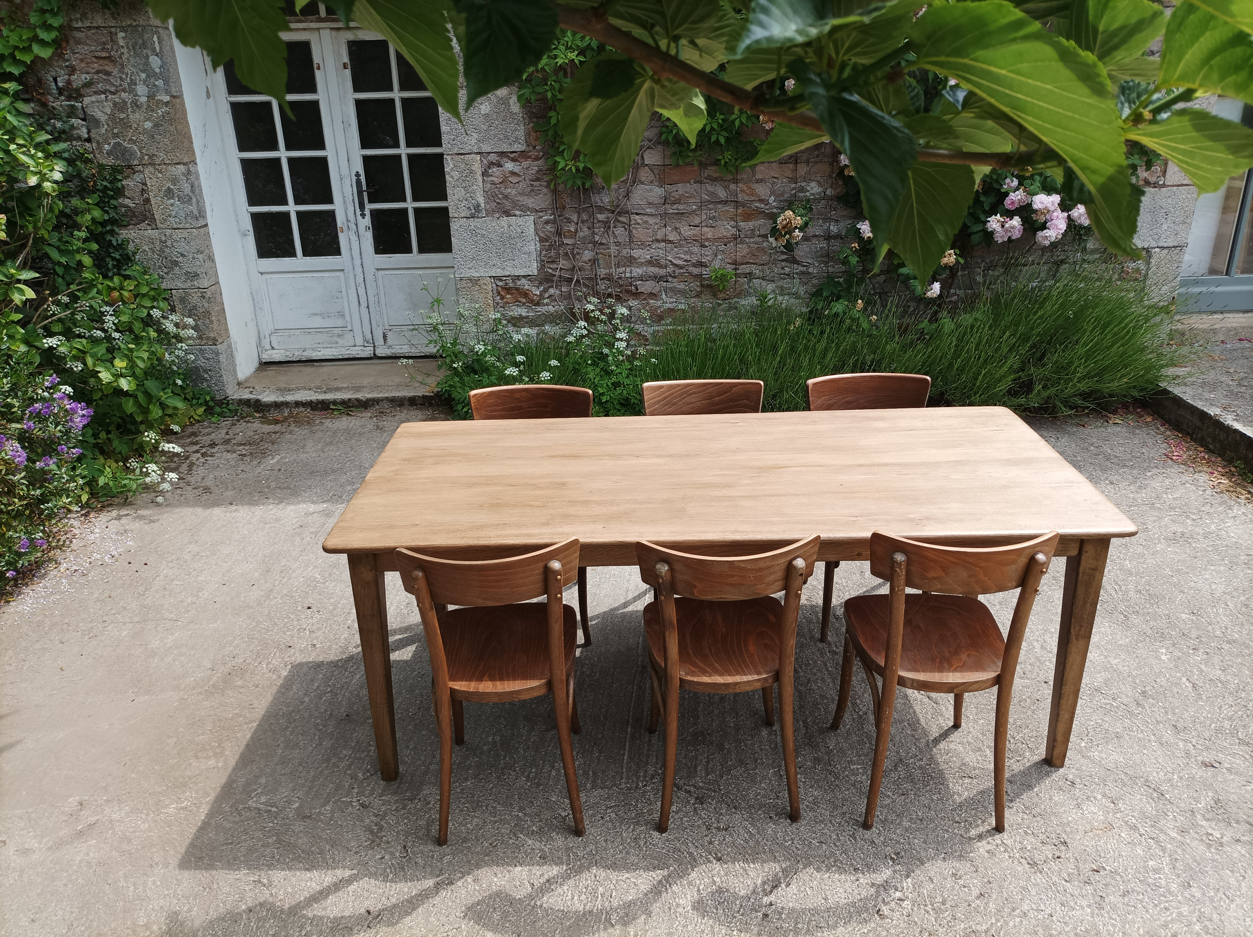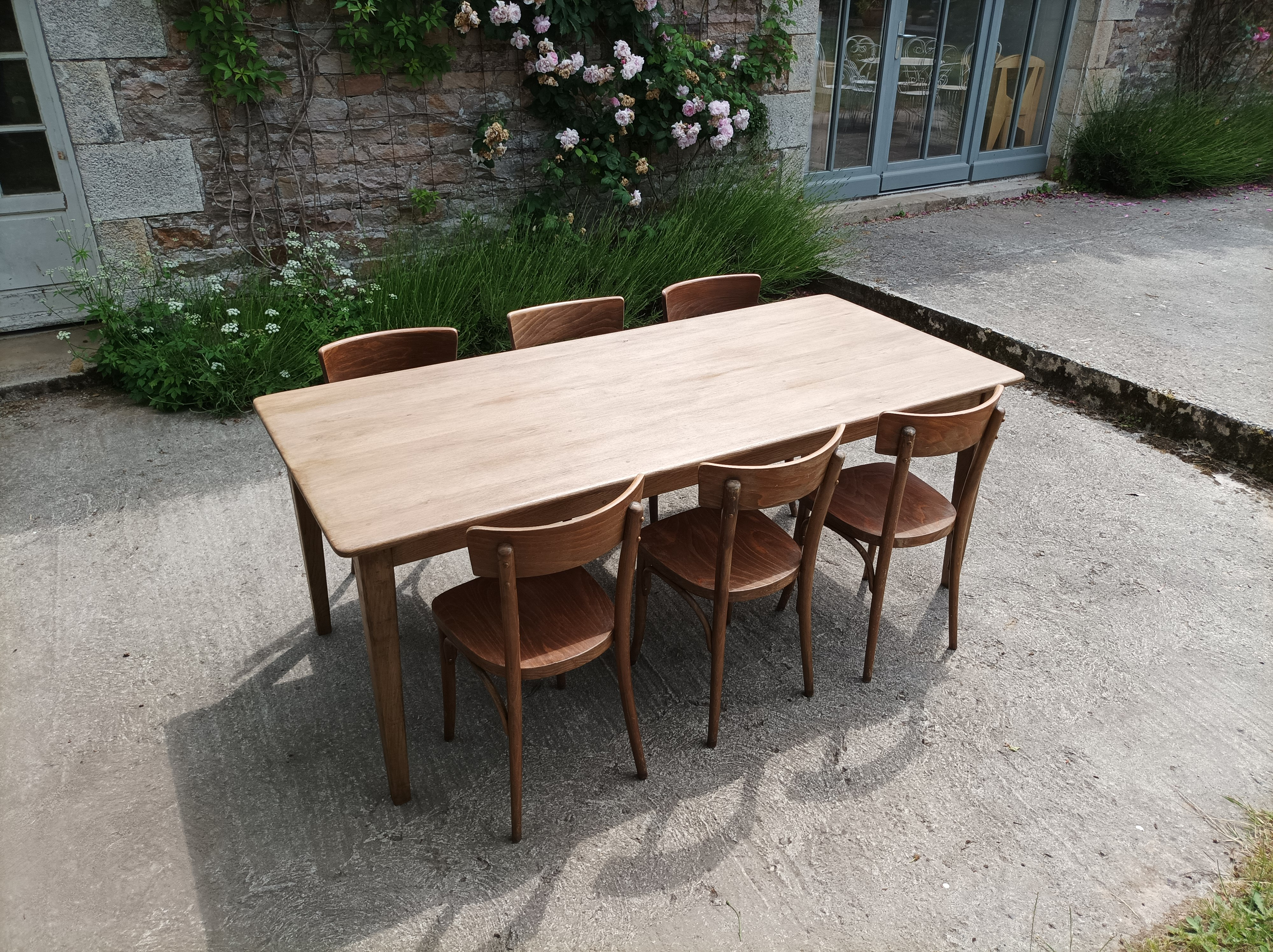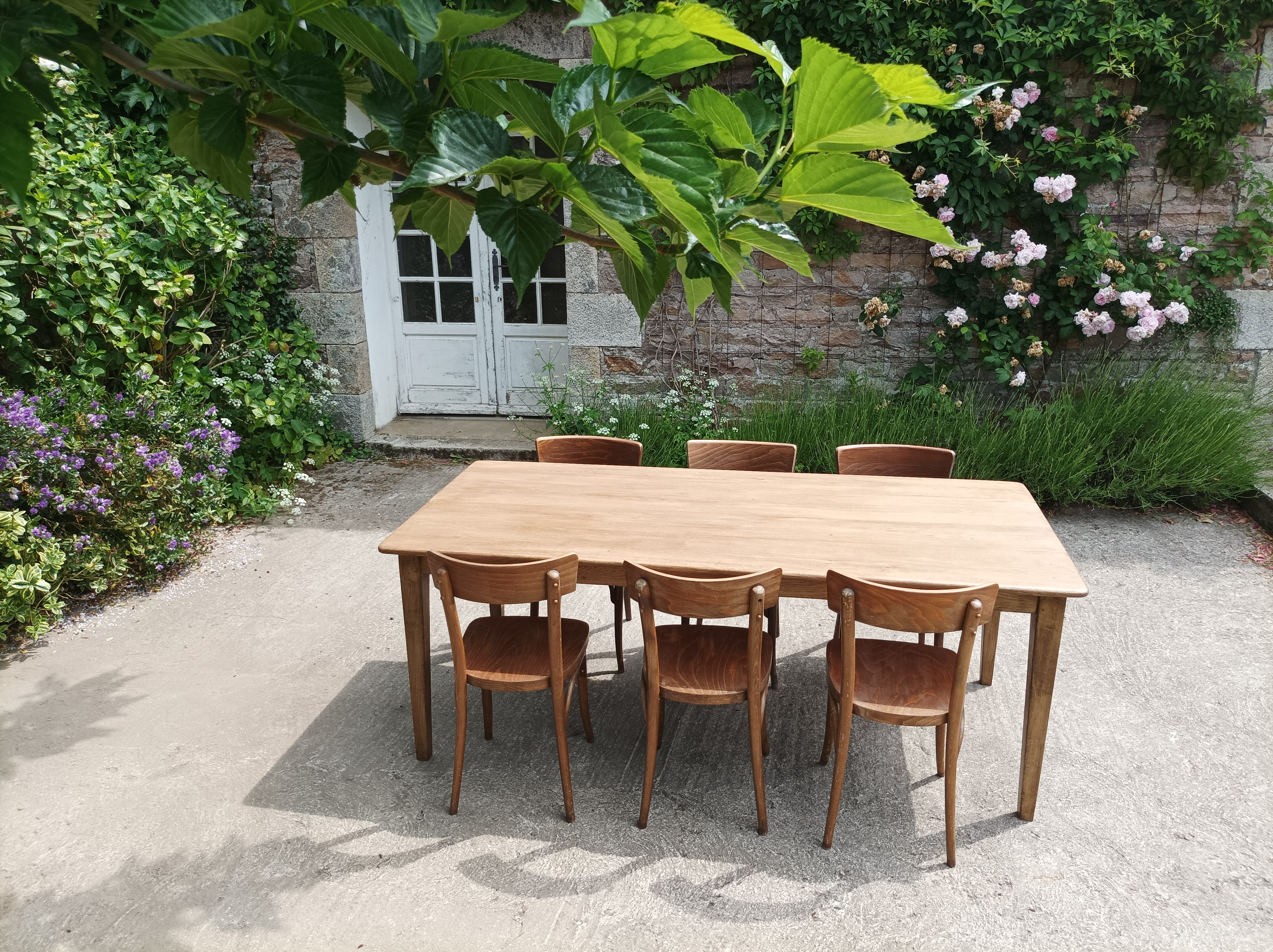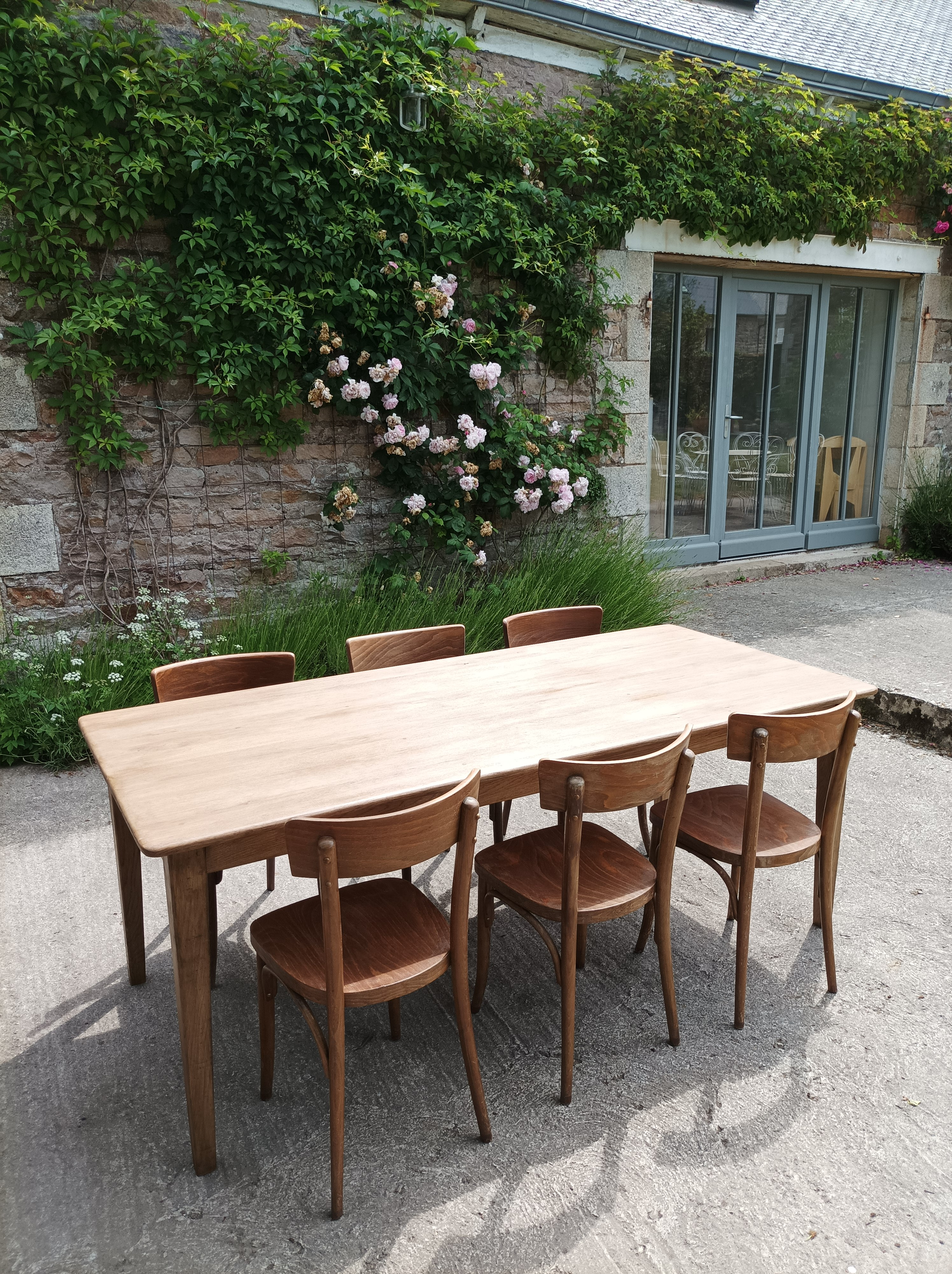 Table de ferme en chêne de 200x90cm, pieds fuseaux. Elle est dotée d’un tiroir poignée coquille style ancien, et d’une rallonge de 50cm.