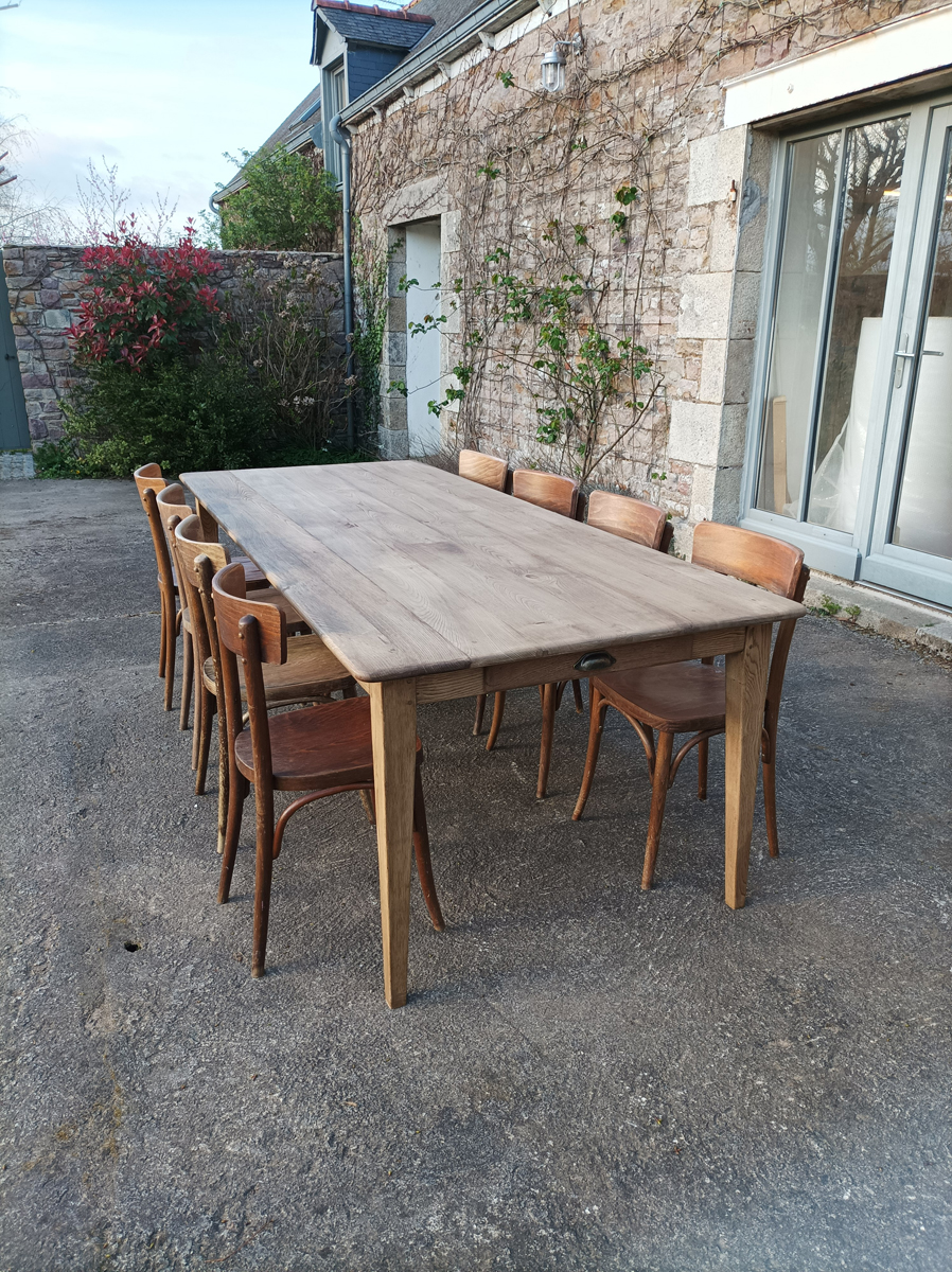 Table en châtaignier teinté noyer. Elle peut facilement recevoir 8 à 10 personnes, voir même 12 si on se sert un peu! 🙂 Elle est dotée de deux tiroirs avec poignée style ancien.